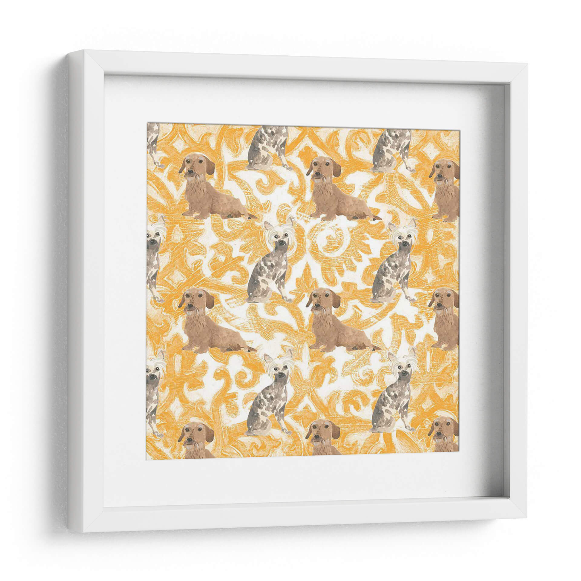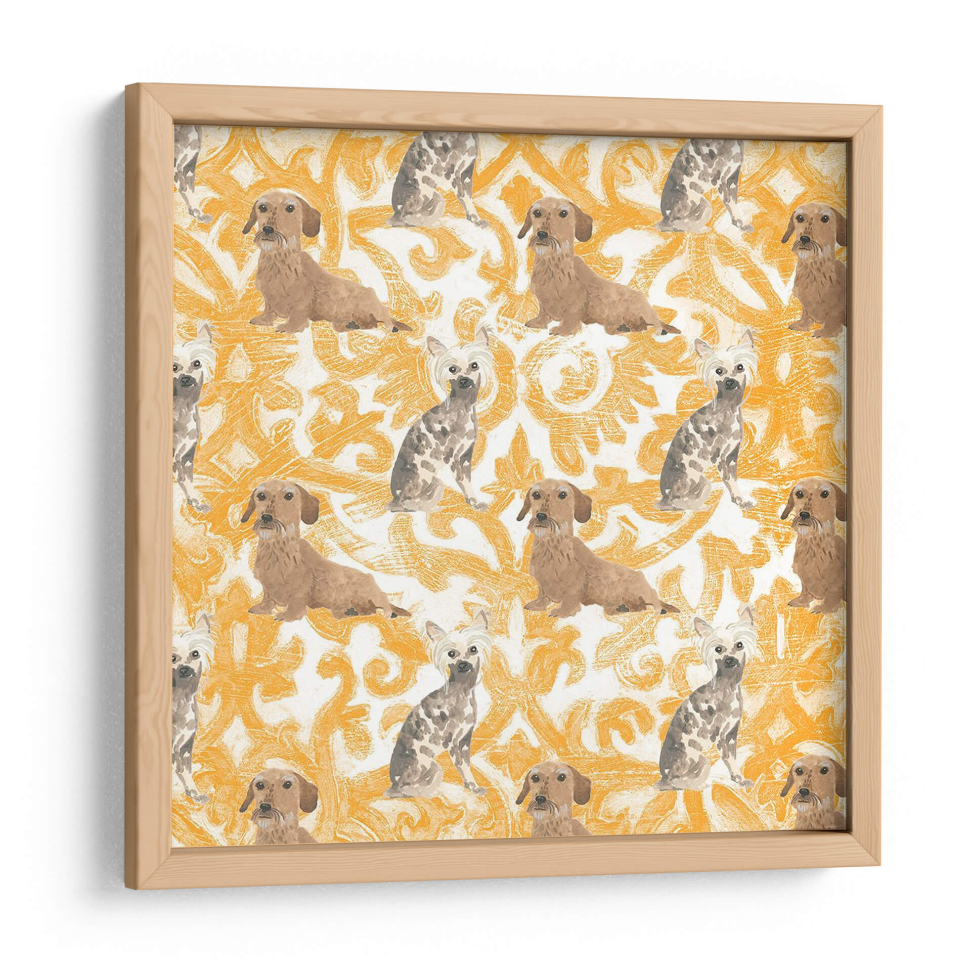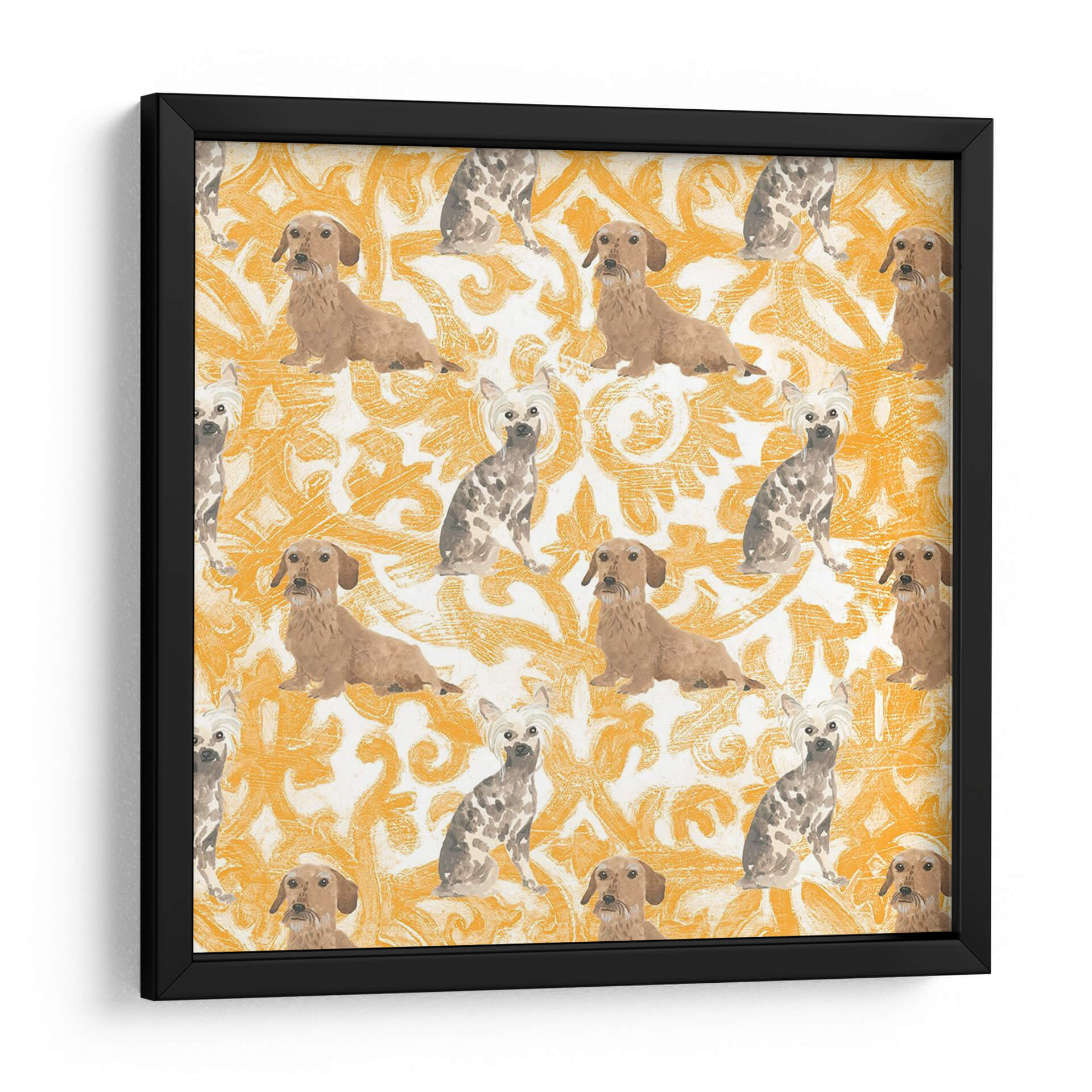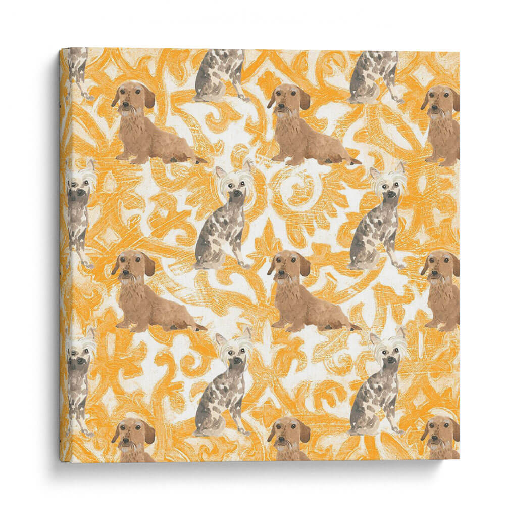 Sumérgete en el encanto juguetón de la obra 'Colección De Pooch De La Sala H' de June Erica Vess. Este cuadro decorativo presenta un patrón repetitivo de adorables perros, incluyendo dachshunds y terriers con pelo corto, sobre un vibrante fondo con un diseño ornamental en tonos ocre y blanco. La composición, inspirada en motivos clásicos pero con un toque moderno y desenfadado, crea una atmósfera alegre y acogedora. Cada figura canina está representada con un estilo distintivo, capturando la personalidad única de cada raza. La paleta de colores cálidos y terrosos, dominada por el ocre, aporta una sensación de energía y calidez al espacio, mientras que el patrón repetitivo genera un ritmo visual cautivador. Ideal para amantes de los perros, esta pieza aportará un toque de personalidad y un aire de sofisticación casual a cualquier sala de estar, estudio o habitación infantil. Su diseño único y el encanto de sus protagonistas la convierten en una elección perfecta para quienes buscan una decoración que combine arte, carácter y un guiño a sus compañeros de cuatro patas, añadiendo vida y color a su hogar.