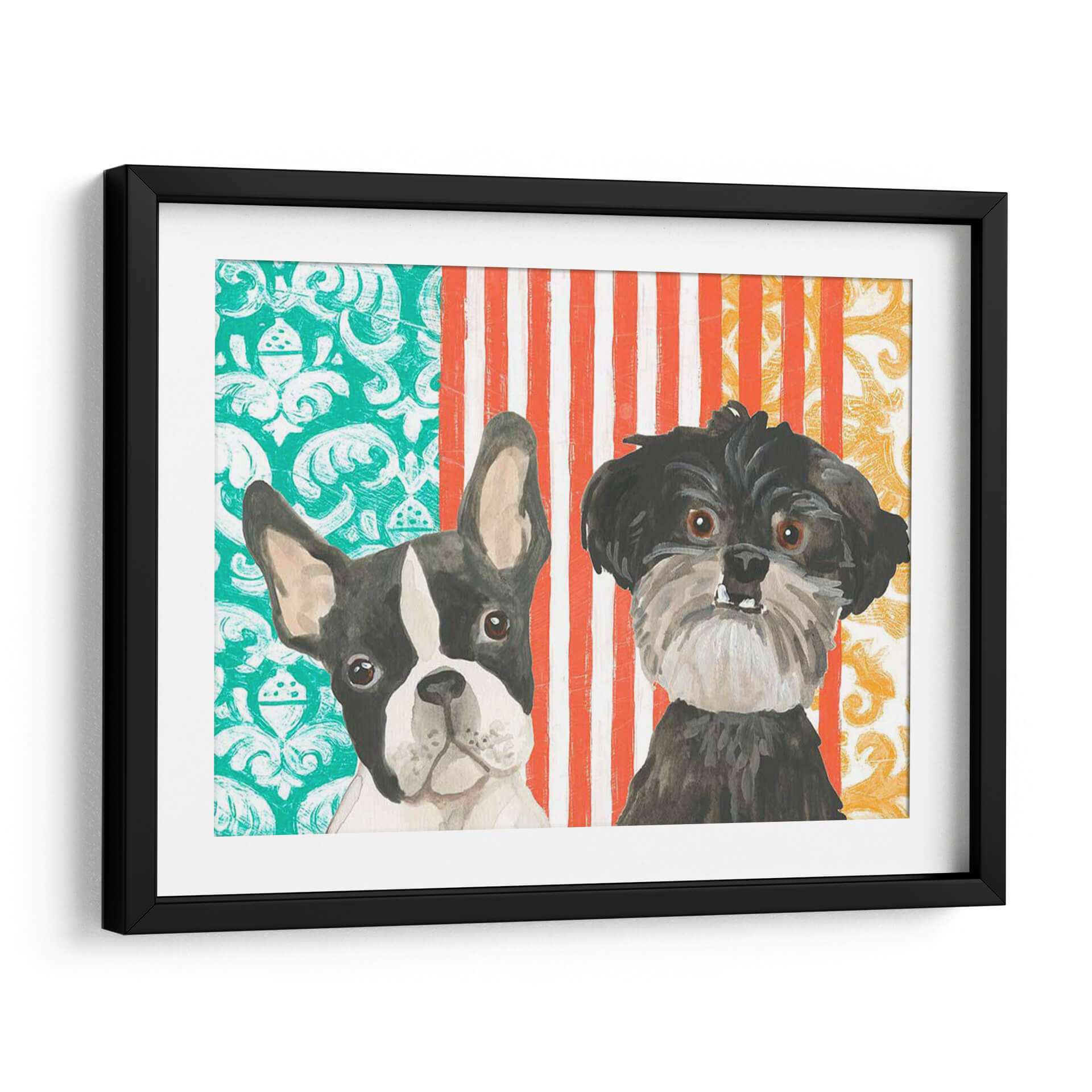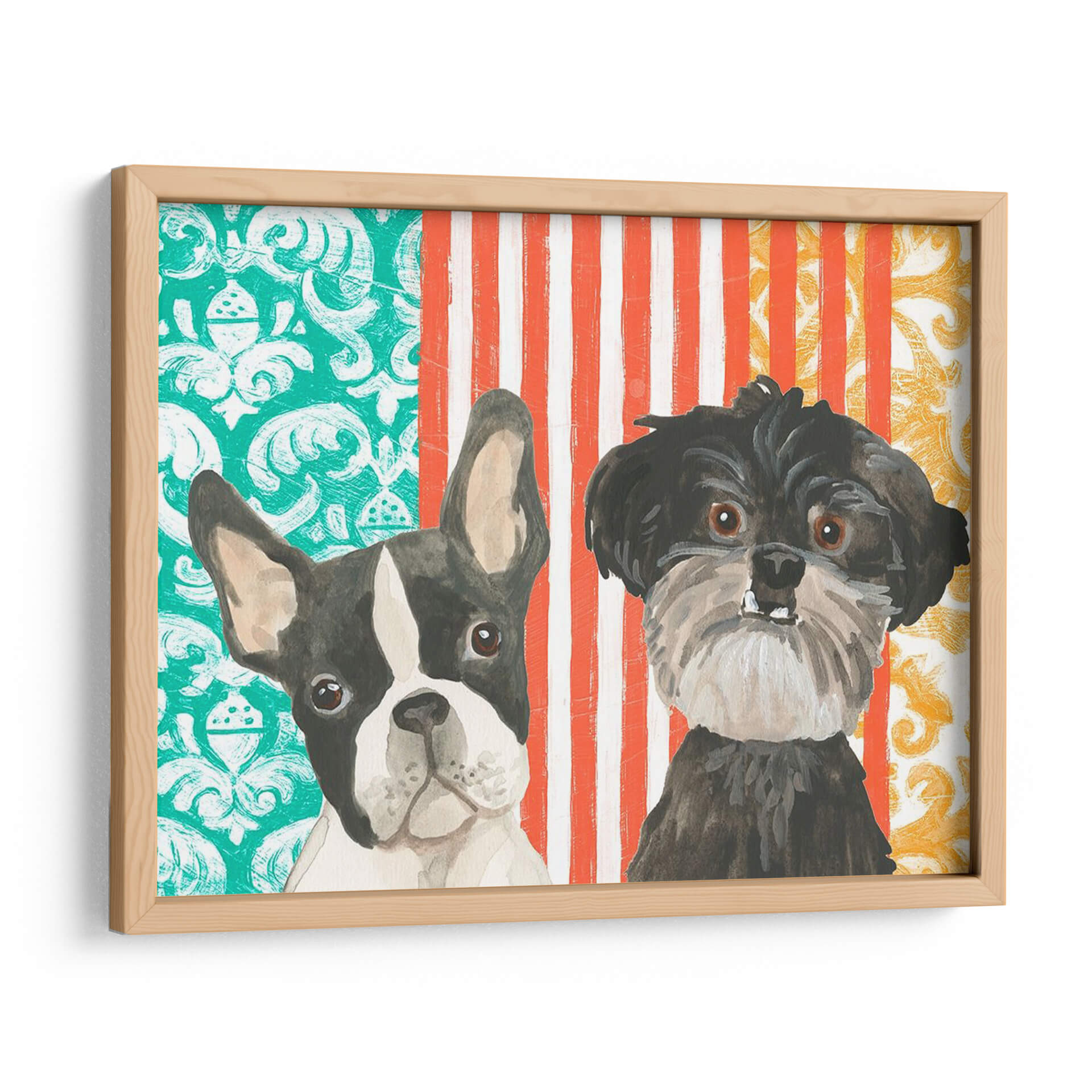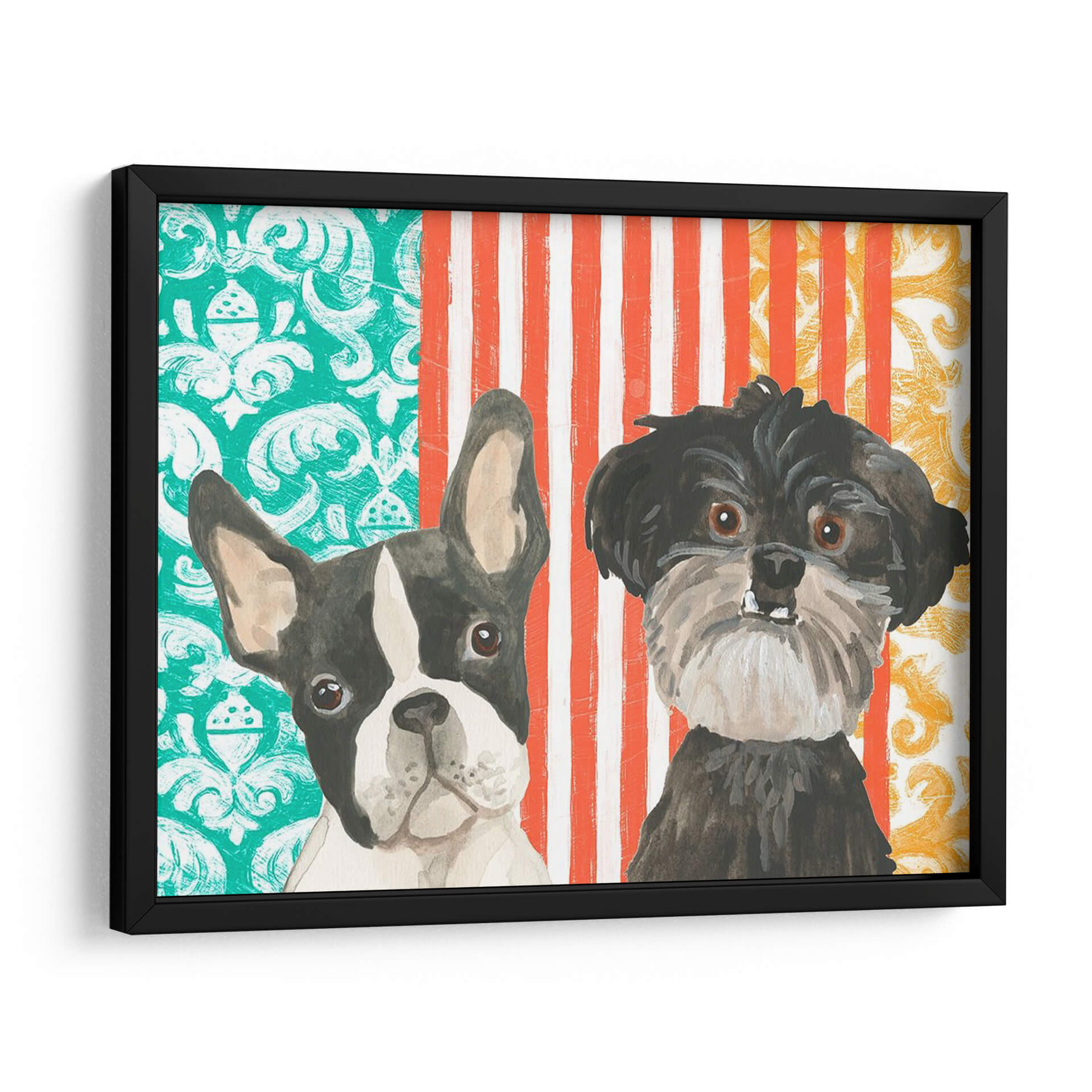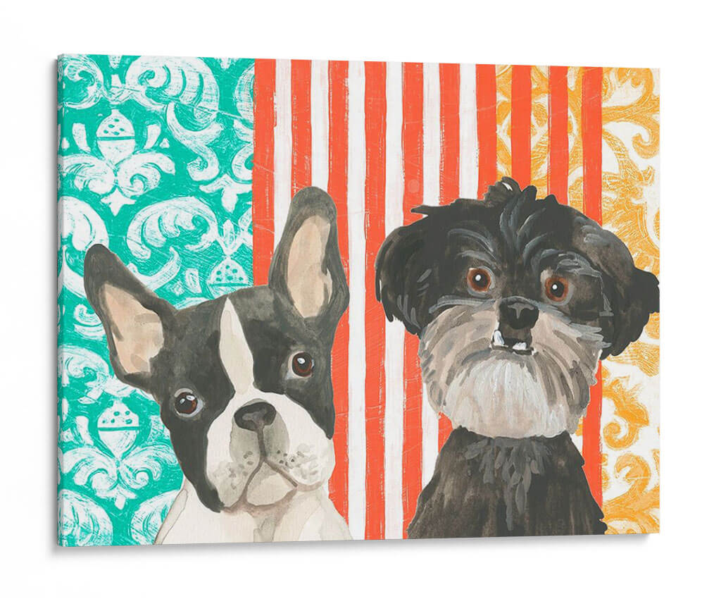Dale vida a tu espacio con este cautivador cuadro decorativo de dos adorables perros, una encantadora representación artística que fusiona la ternura canina con un vibrante telón de fondo. La obra presenta a un Boston Terrier de mirada curiosa y a un tierno perro de raza mixta, ambos capturados con un estilo pictórico expresivo. El fondo se divide en secciones audaces: a la izquierda, un intrincado patrón damasco en un vivo tono turquesa; en el centro, vibrantes rayas verticales en naranja y blanco; y a la derecha, un delicado motivo ornamental en amarillo. Esta composición ecléctica crea un contraste fascinante entre lo clásico y lo moderno, aportando una energía juguetona y sofisticada a cualquier habitación. Los colores primarios y los acentos brillantes hacen de esta pieza un punto focal ideal para salas de estar, estudios o incluso habitaciones infantiles, añadiendo un toque de personalidad y alegría. Es la elección perfecta para los amantes de los perros y para quienes buscan una decoración única que combine humor, arte y un diseño impactante. Transforma tu hogar con esta obra que evoca calidez y carácter.