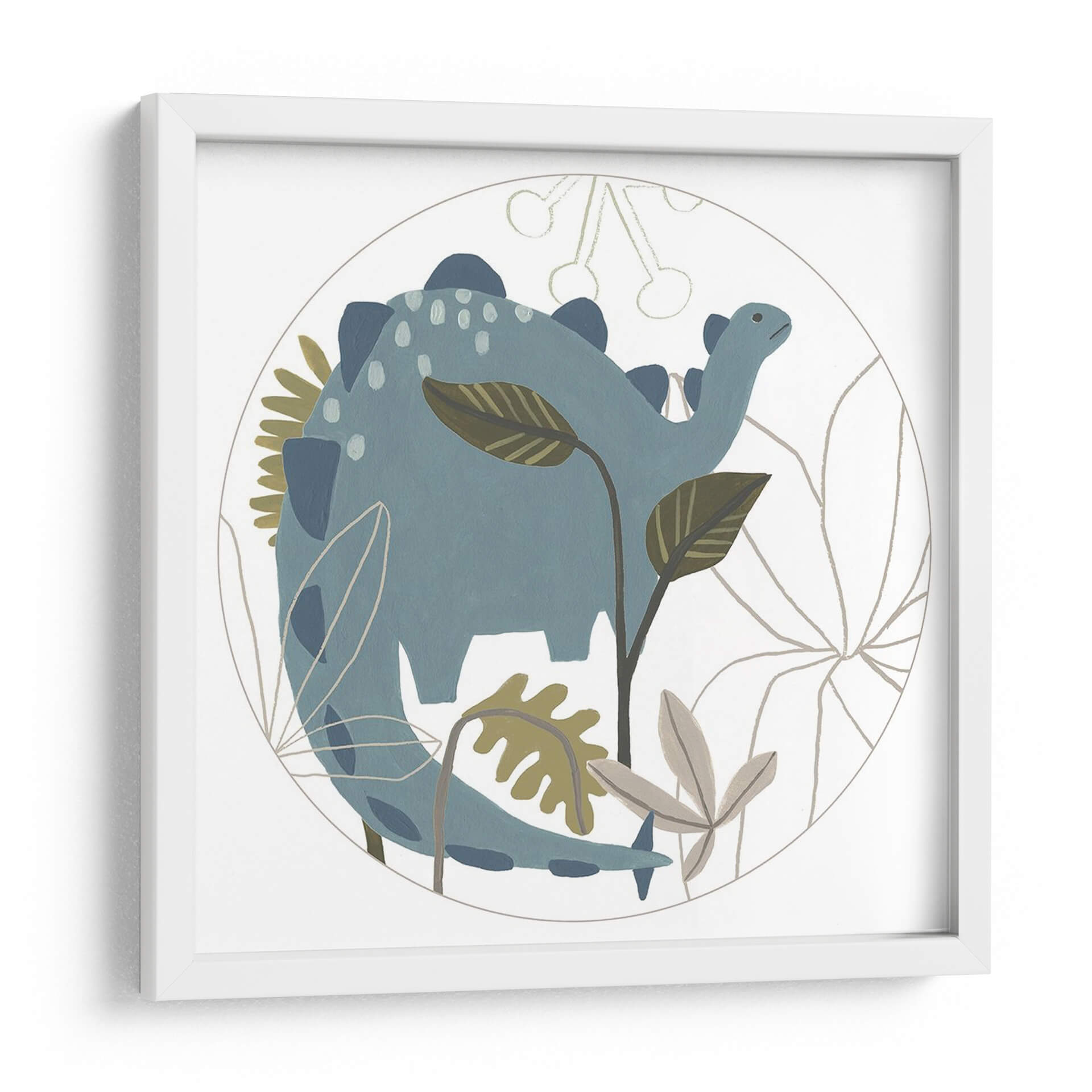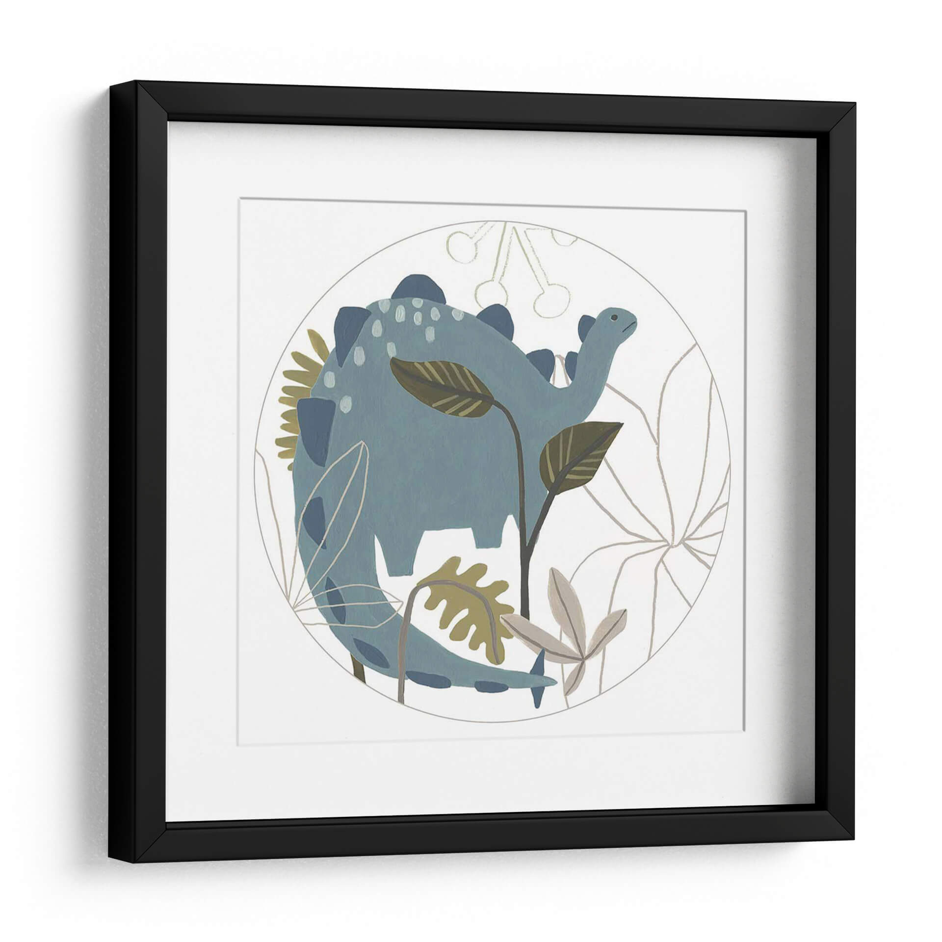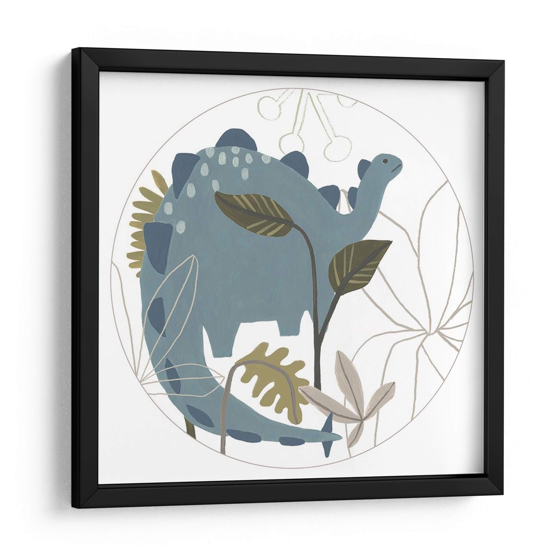 Sumérgete en un mundo de fantasía prehistórica con este encantador cuadro decorativo de la colección 'Mighty Dinos C' de June Erica Vess. La obra presenta un tierno dinosaurio azul en un entorno botánico estilizado, encapsulado dentro de un círculo delicado. La paleta de colores, dominada por tonos azules suaves, verdes apagados y toques de beige, crea una atmósfera serena y juguetona, perfecta para espacios infantiles o para añadir un toque de dulzura y nostalgia a cualquier habitación. El estilo de ilustración, con sus líneas suaves y formas redondeadas, evoca una sensación de calma y asombro. Este cuadro decorativo es ideal para estimular la imaginación en habitaciones de bebés, cuartos infantiles o incluso como una pieza lúdica en una sala de estar moderna que busque un toque de originalidad. Su diseño circular y la temática del dinosaurio lo convierten en un punto focal encantador que invita a la contemplación y la alegría, transformando cualquier pared en un rincón lleno de encanto y carácter.