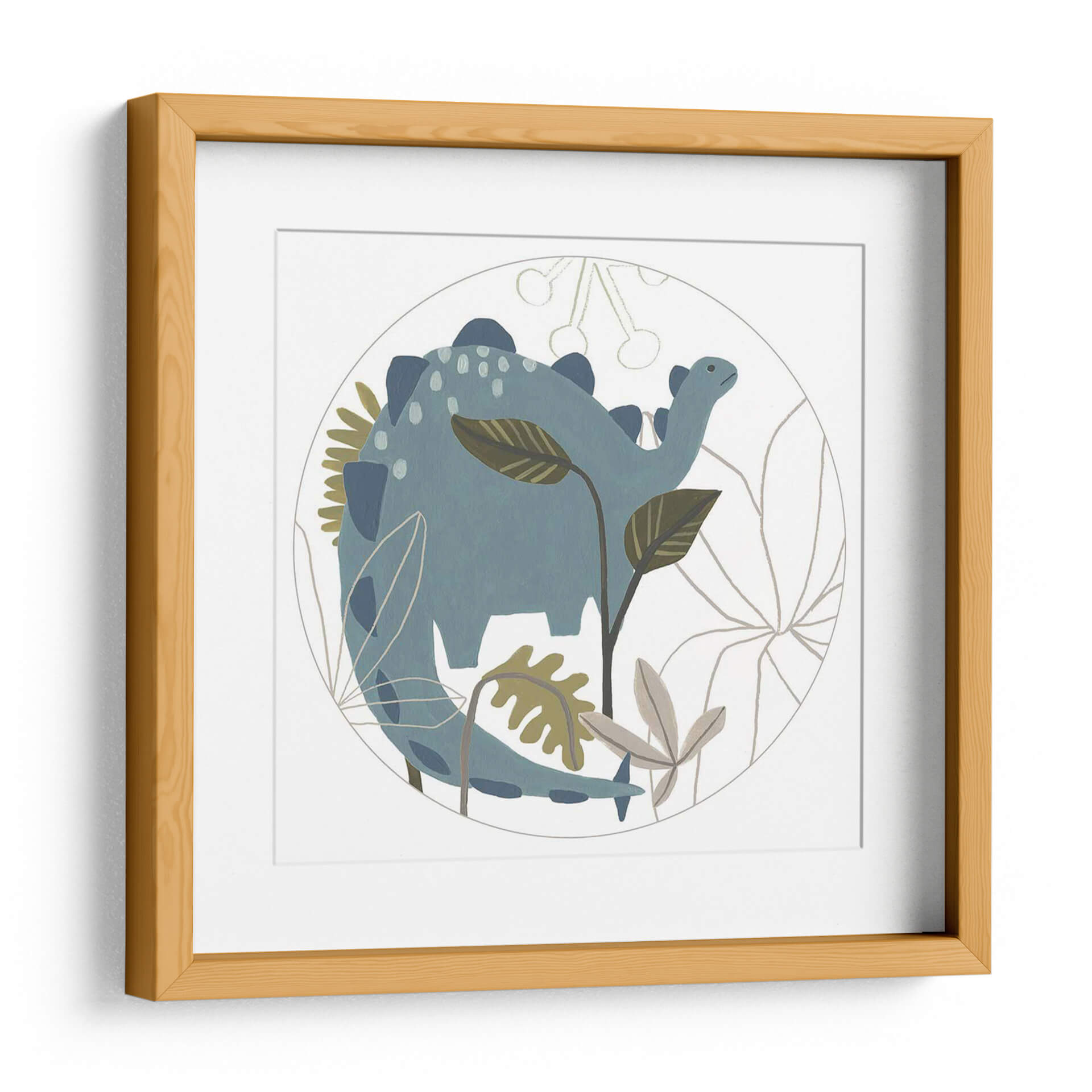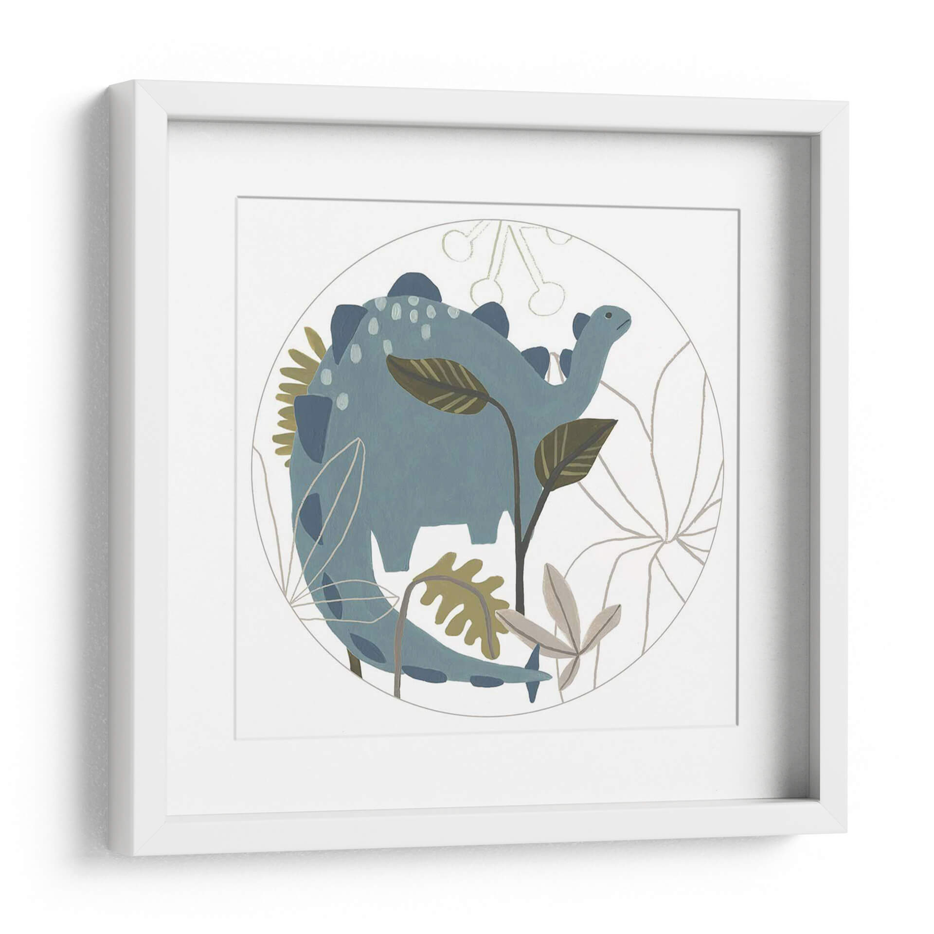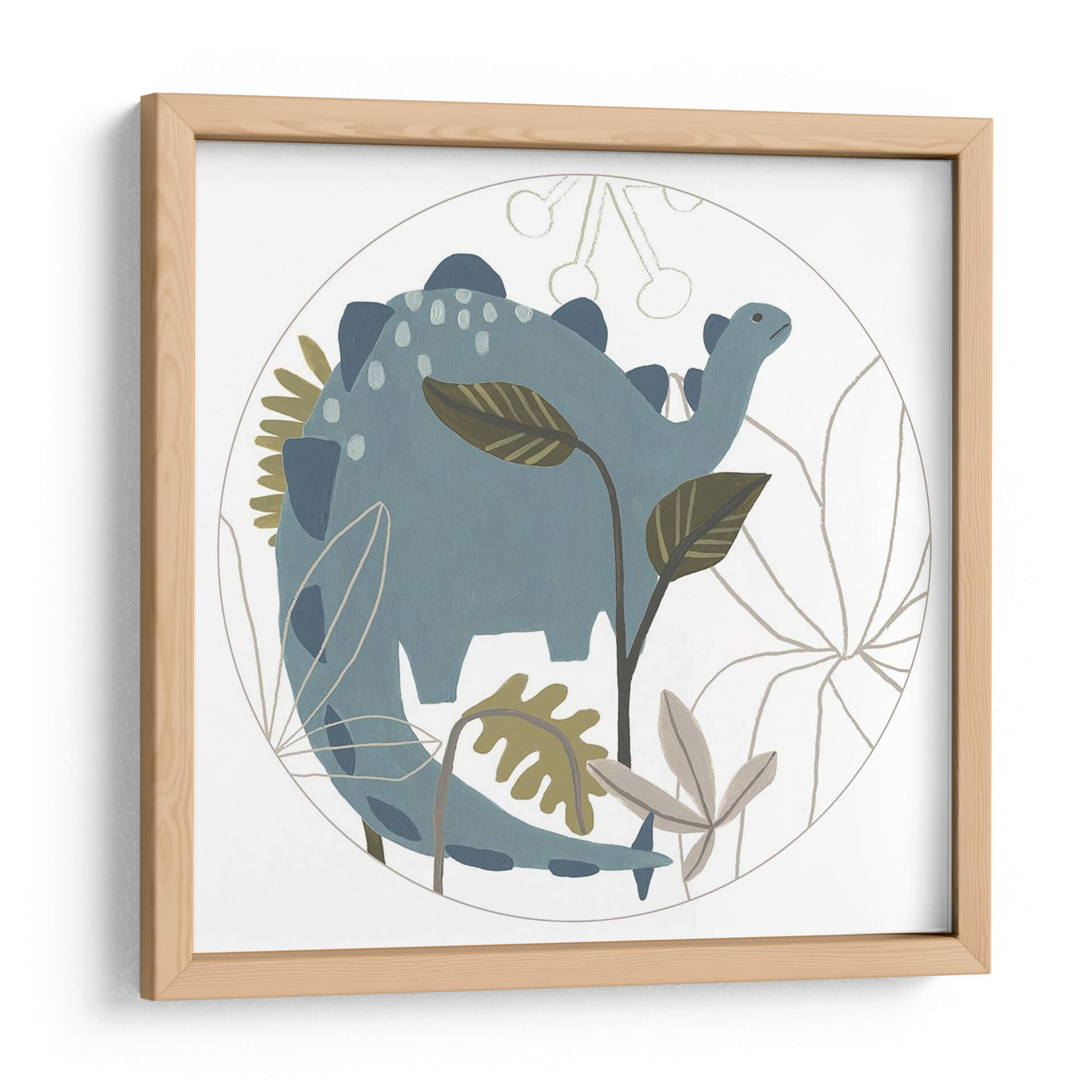 Sumérgete en un mundo de fantasía prehistórica con este encantador cuadro decorativo de la colección 'Mighty Dinos C' de June Erica Vess. La obra presenta un tierno dinosaurio azul en un entorno botánico estilizado, encapsulado dentro de un círculo delicado. La paleta de colores, dominada por tonos azules suaves, verdes apagados y toques de beige, crea una atmósfera serena y juguetona, perfecta para espacios infantiles o para añadir un toque de dulzura y nostalgia a cualquier habitación. El estilo de ilustración, con sus líneas suaves y formas redondeadas, evoca una sensación de calma y asombro. Este cuadro decorativo es ideal para estimular la imaginación en habitaciones de bebés, cuartos infantiles o incluso como una pieza lúdica en una sala de estar moderna que busque un toque de originalidad. Su diseño circular y la temática del dinosaurio lo convierten en un punto focal encantador que invita a la contemplación y la alegría, transformando cualquier pared en un rincón lleno de encanto y carácter.
