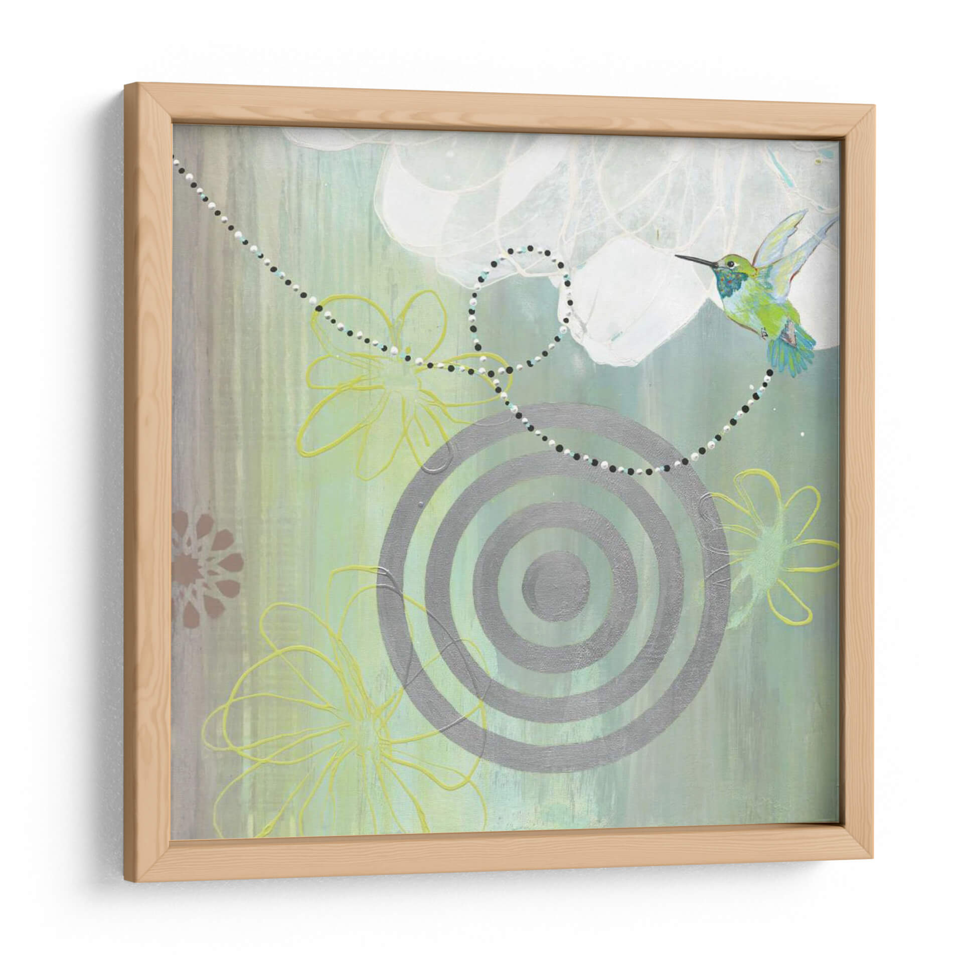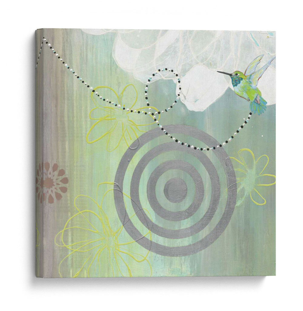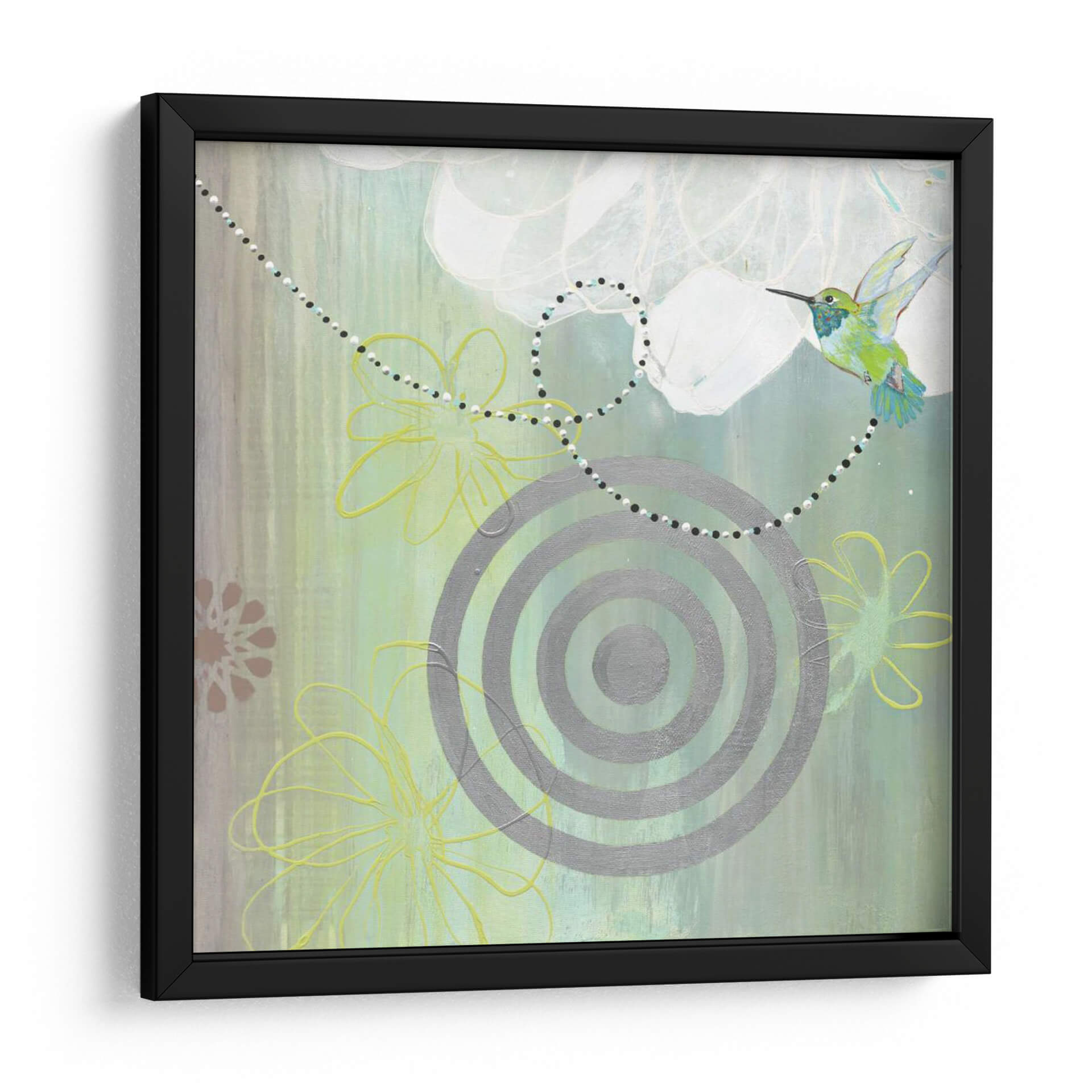 Embellece tu hogar con la obra "Conectado II" de Jodi Fuchs, una pieza que irradia serenidad y conexión con la naturaleza. Este cuadro decorativo captura la delicadeza de un colibrí en pleno vuelo, rodeado de un fondo abstracto que evoca texturas suaves y etéreas. La paleta de colores, dominada por tonos verdes, grises y toques sutiles de amarillo y rosa, crea una atmósfera de calma y armonía, perfecta para espacios que buscan transmitir tranquilidad y elegancia. La composición integra elementos gráficos como círculos concéntricos y líneas fluidas, entrelazándose con delicadas siluetas florales, lo que aporta un toque contemporáneo y sofisticado. "Conectado II" es ideal para salones, dormitorios o estudios, añadiendo un punto focal inspirador que invita a la contemplación. Descubre cómo esta obra de arte puede transformar tu ambiente, aportando un aire de frescura y vitalidad a tu decoración.