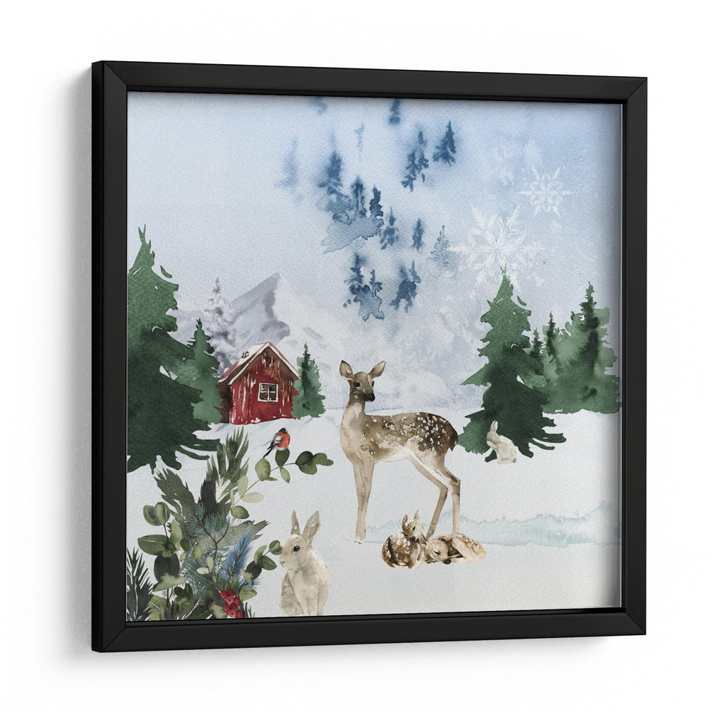 Embárcate en un viaje visual a un "Cuento invernal del bosque", una obra de arte cautivadora de Emel Tunaboylu que captura la serenidad y la magia de una escena nevada. Esta pieza evoca una atmósfera de calma y refugio, presentando un ciervo majestuoso rodeado de conejos blancos y un pájaro rojo posado delicadamente en la vegetación invernal, todo ello enmarcado por árboles de hoja perenne y una acogedora cabaña roja. La paleta de colores, dominada por suaves azules y blancos, se complementa con los verdes profundos de los pinos y el cálido contraste de la cabaña, creando una escena visualmente equilibrada y encantadora. El estilo acuarela aporta una textura etérea y soñadora, perfecta para añadir un toque de naturaleza idílica y tranquilidad a cualquier espacio. Ideal para salones, dormitorios o incluso oficinas, este cuadro decorativo invita a la reflexión y la paz, transportando al espectador a un mundo de ensueño invernal. Es una pieza que celebra la belleza simple y la armonía de la naturaleza, ofreciendo un respiro visual y un punto de conexión con la serenidad del invierno.