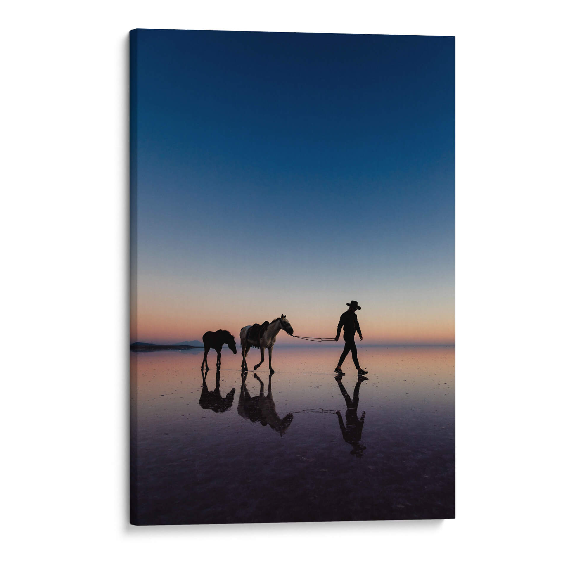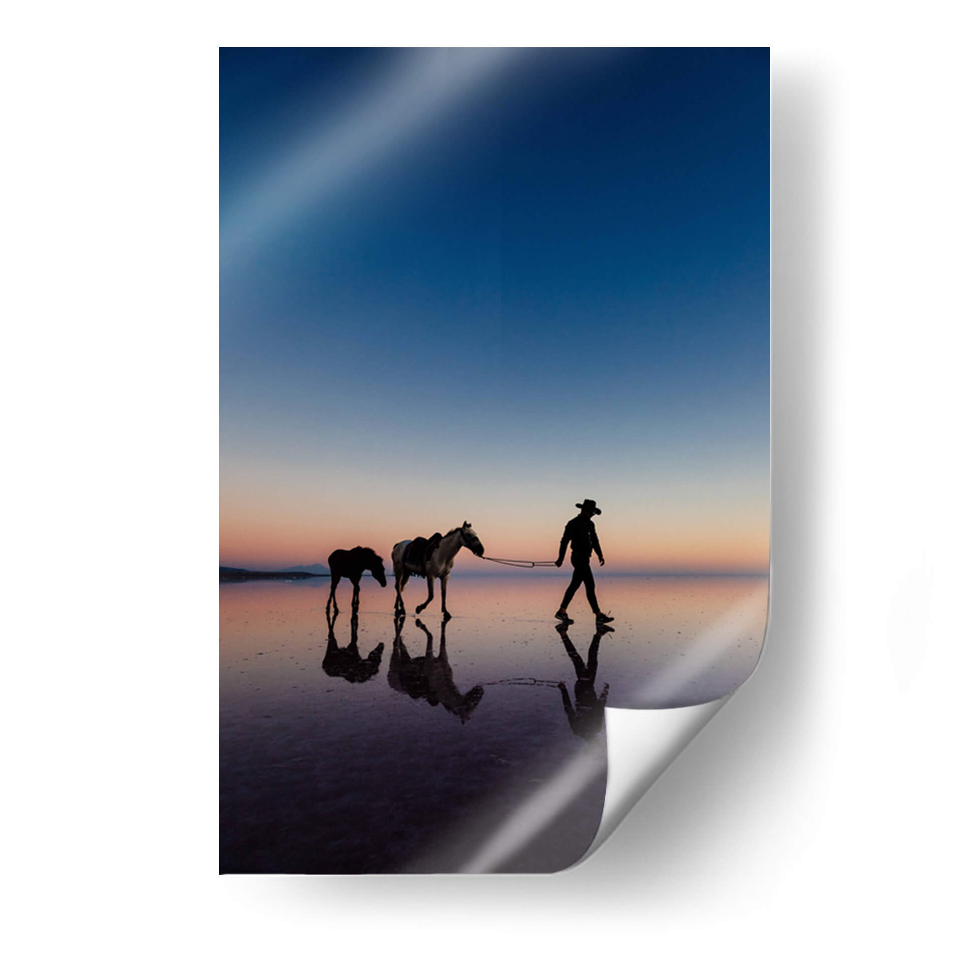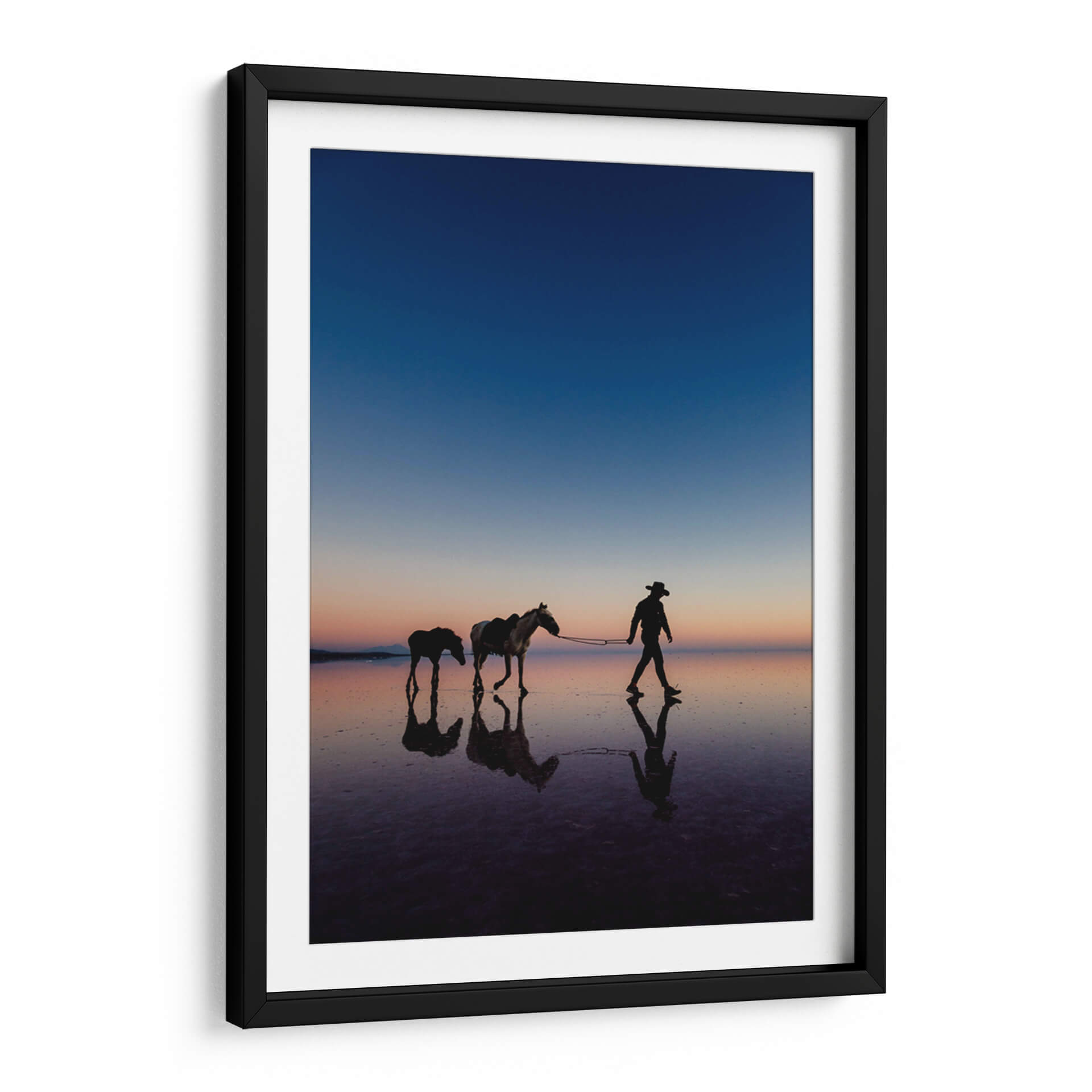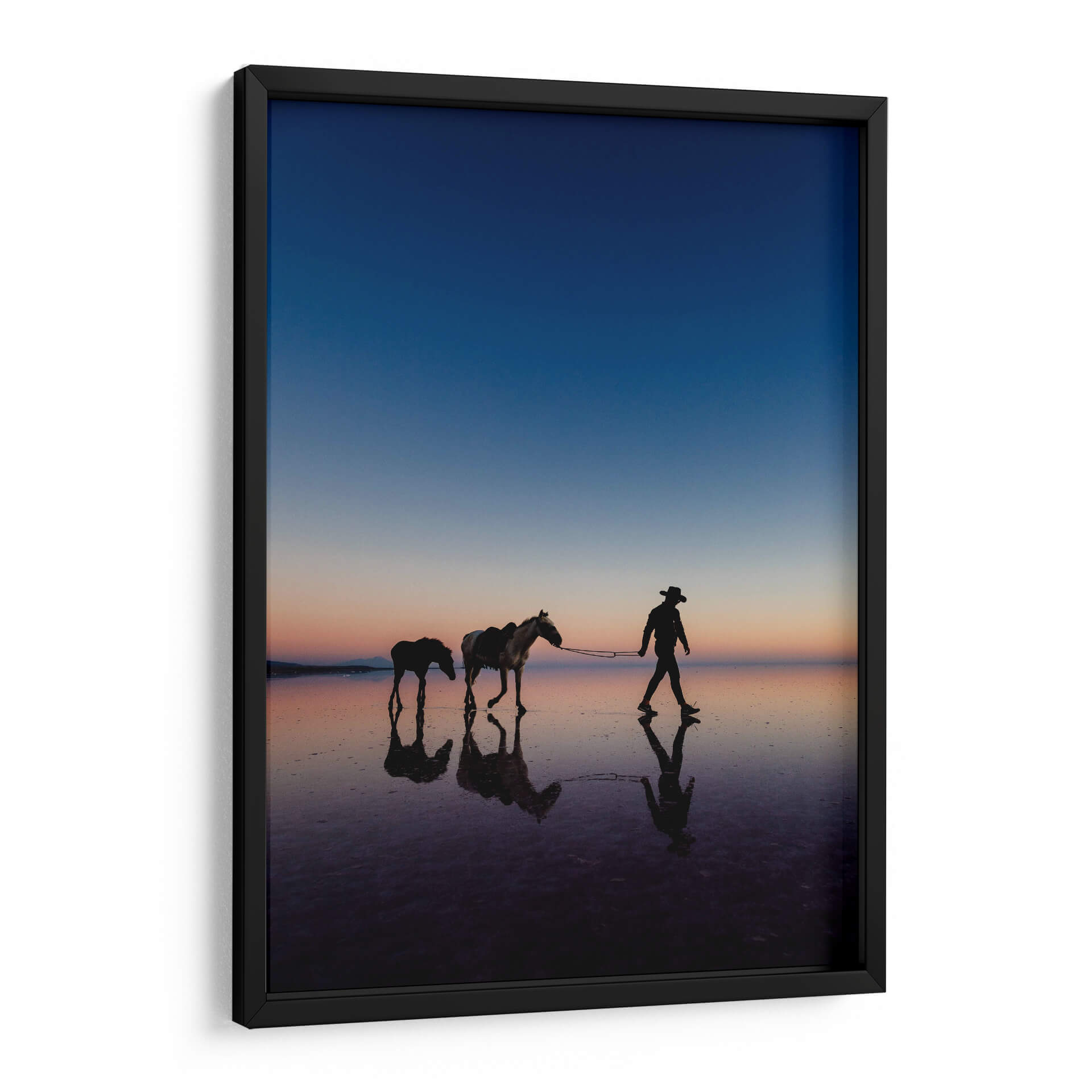 Sumérgete en la serenidad de "De pie sobre el horizonte", una obra de arte cautivadora de M. Emre Erol. Esta pieza captura un momento etéreo al amanecer o atardecer, donde la figura de un hombre, acompañado por dos caballos, camina sobre un espejo de agua cristalina que refleja el cielo en degradado. Los tonos cálidos del horizonte, que van desde el naranja hasta el azul profundo del cielo, crean una atmósfera de paz y contemplación. La composición minimalista, con las siluetas nítidas contra el vasto paisaje, invita a la reflexión sobre la conexión entre el hombre, la naturaleza y el infinito. Este cuadro decorativo es ideal para espacios que buscan evocar tranquilidad y una conexión espiritual, como dormitorios, salas de meditación o estudios. Su atmósfera introspectiva lo convierte en un punto focal sublime para cualquier ambiente, aportando una sensación de calma y aventura. La obra "De pie sobre el horizonte" es una invitación a contemplar la belleza efímera de los momentos, perfecta para quienes aprecian el arte que inspira y eleva el espíritu.