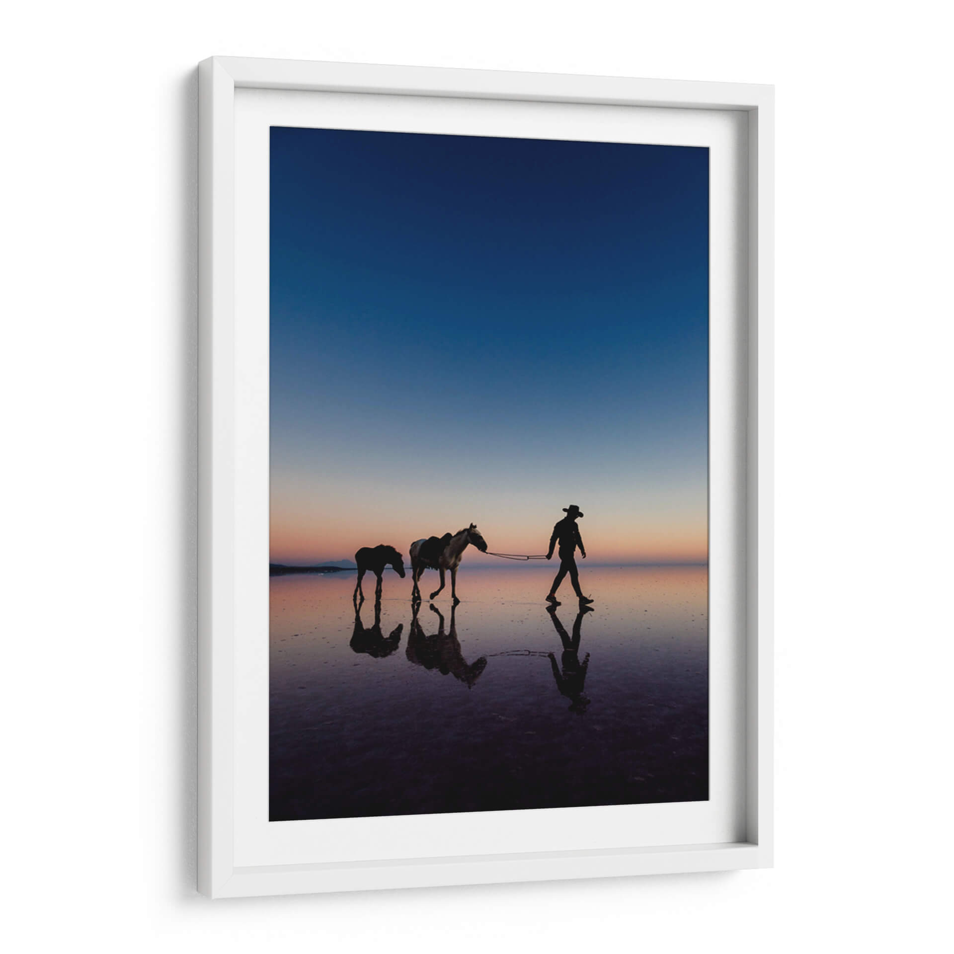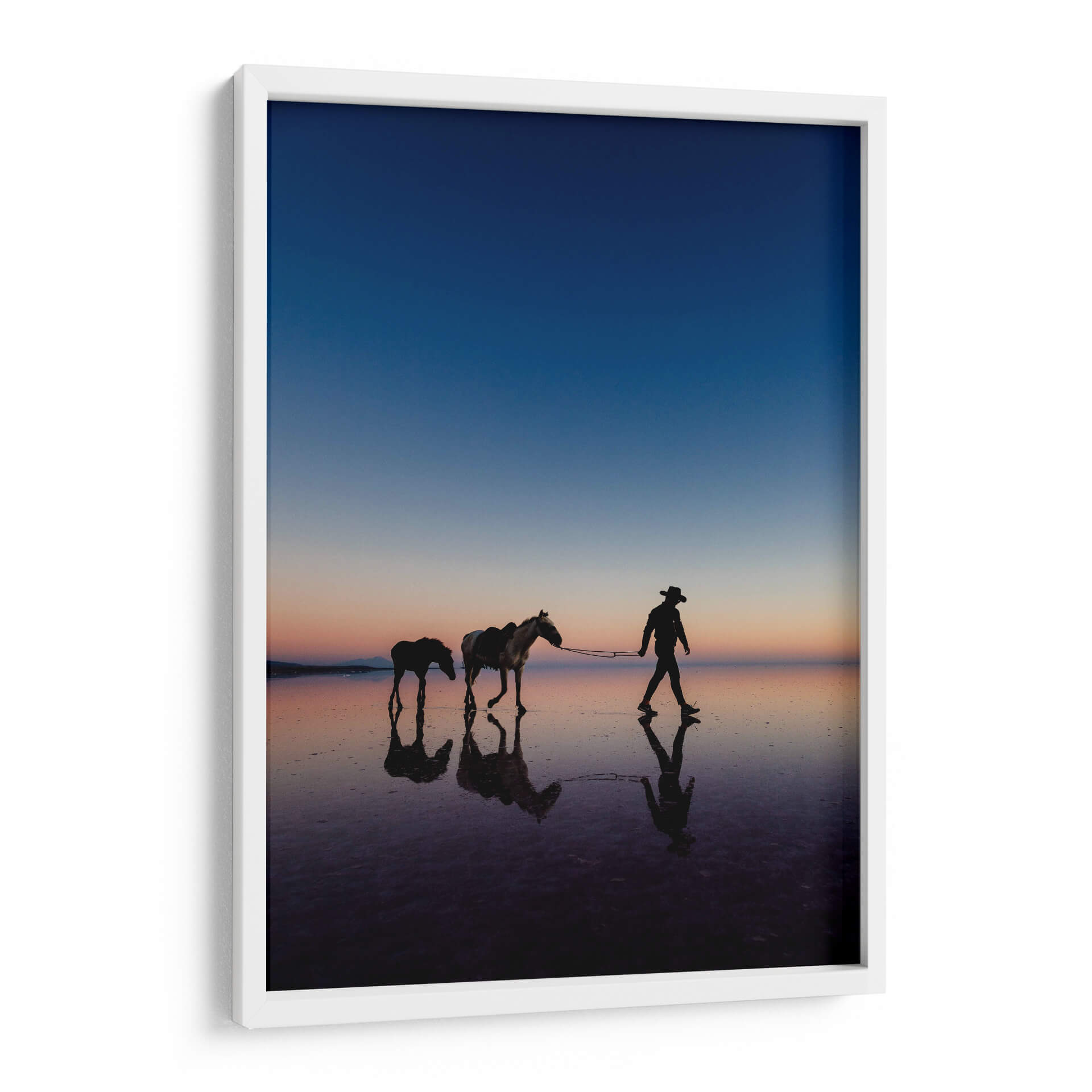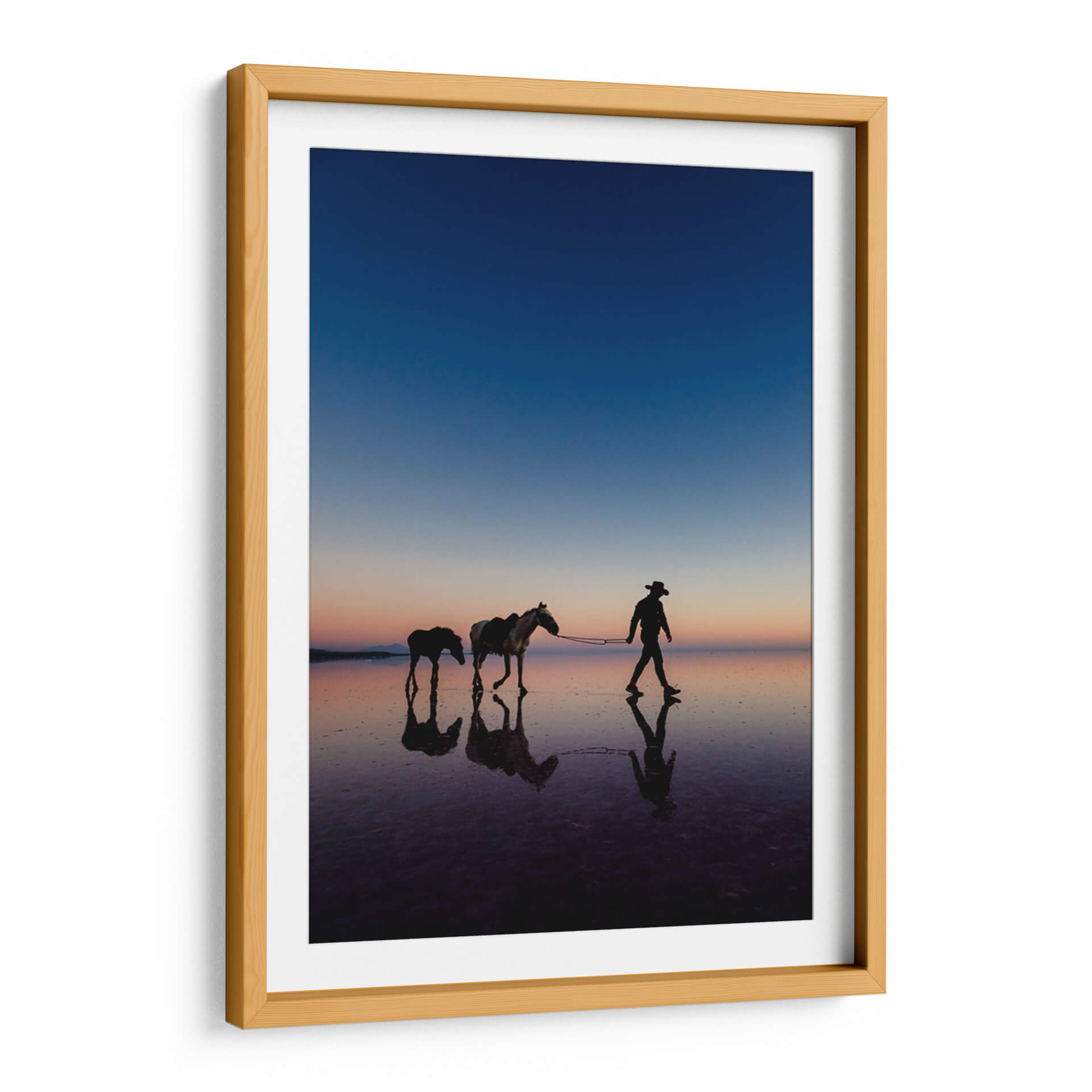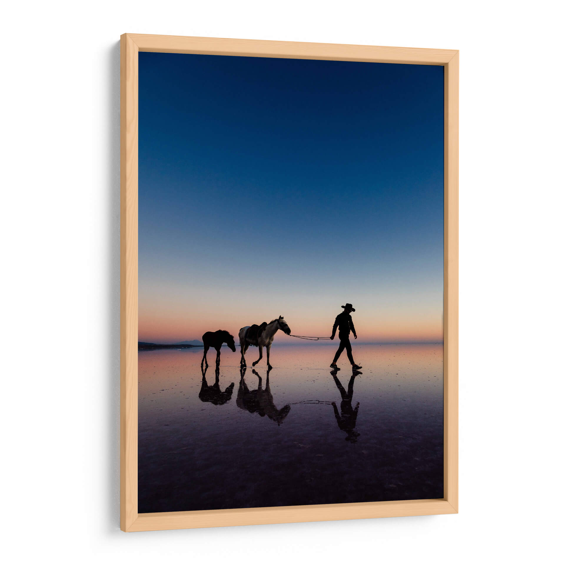 Sumérgete en la serenidad de "De pie sobre el horizonte", una obra de arte cautivadora de M. Emre Erol. Esta pieza captura un momento etéreo al amanecer o atardecer, donde la figura de un hombre, acompañado por dos caballos, camina sobre un espejo de agua cristalina que refleja el cielo en degradado. Los tonos cálidos del horizonte, que van desde el naranja hasta el azul profundo del cielo, crean una atmósfera de paz y contemplación. La composición minimalista, con las siluetas nítidas contra el vasto paisaje, invita a la reflexión sobre la conexión entre el hombre, la naturaleza y el infinito. Este cuadro decorativo es ideal para espacios que buscan evocar tranquilidad y una conexión espiritual, como dormitorios, salas de meditación o estudios. Su atmósfera introspectiva lo convierte en un punto focal sublime para cualquier ambiente, aportando una sensación de calma y aventura. La obra "De pie sobre el horizonte" es una invitación a contemplar la belleza efímera de los momentos, perfecta para quienes aprecian el arte que inspira y eleva el espíritu.