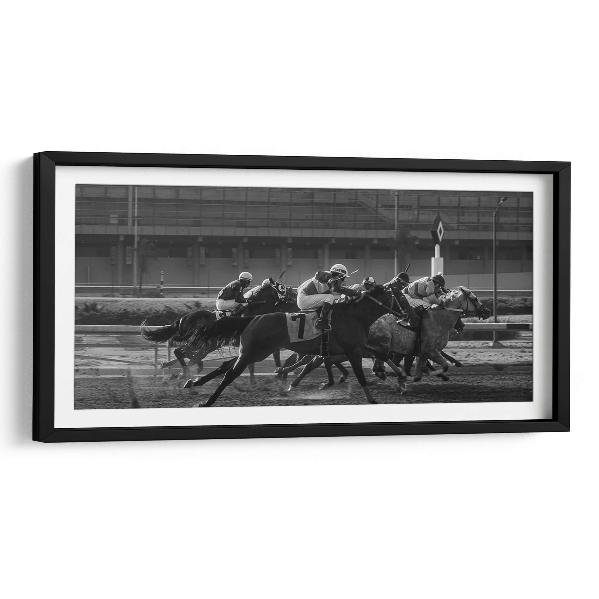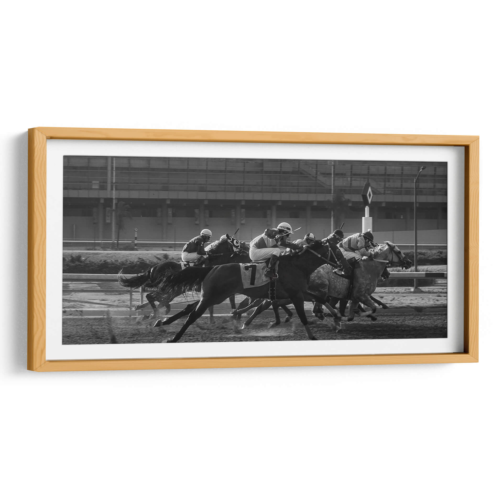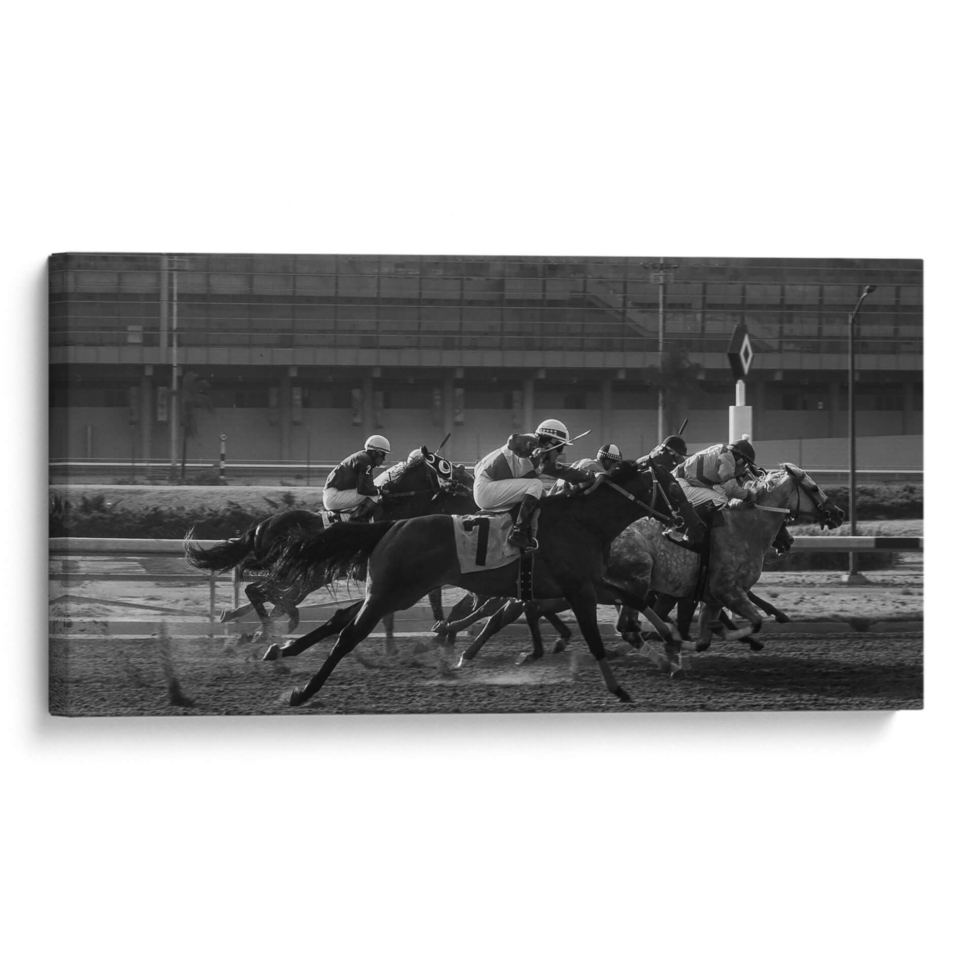 Sumérgete en la intensidad y la emoción de la carrera con este impactante cuadro decorativo en blanco y negro, titulado 'El 7 es de la suerte' del artista Christian Castro. La obra captura el momento cumbre de una carrera de caballos, donde la velocidad, la potencia y la determinación de los jinetes y sus equinos se entrelazan en una danza de competición. La paleta monocromática resalta la textura del polvo levantado por las pezuñas y el dinamismo de los cuerpos en pleno galope, creando una atmósfera de adrenalina y esfuerzo palpable. Cada detalle, desde los músculos tensos de los caballos hasta la concentración en los rostros de los jinetes, es capturado con una maestría que invita a la contemplación. Este cuadro decorativo es perfecto para añadir un toque de energía y sofisticación a cualquier espacio, ya sea una sala de estar moderna, un estudio o una oficina. Ideal para amantes del deporte ecuestre y para quienes aprecian el arte que transmite fuerza y movimiento. El estilo fotográfico y la composición audaz hacen de esta pieza un elemento focal que no pasará desapercibido, evocando la emoción del triunfo y la pasión por la victoria.