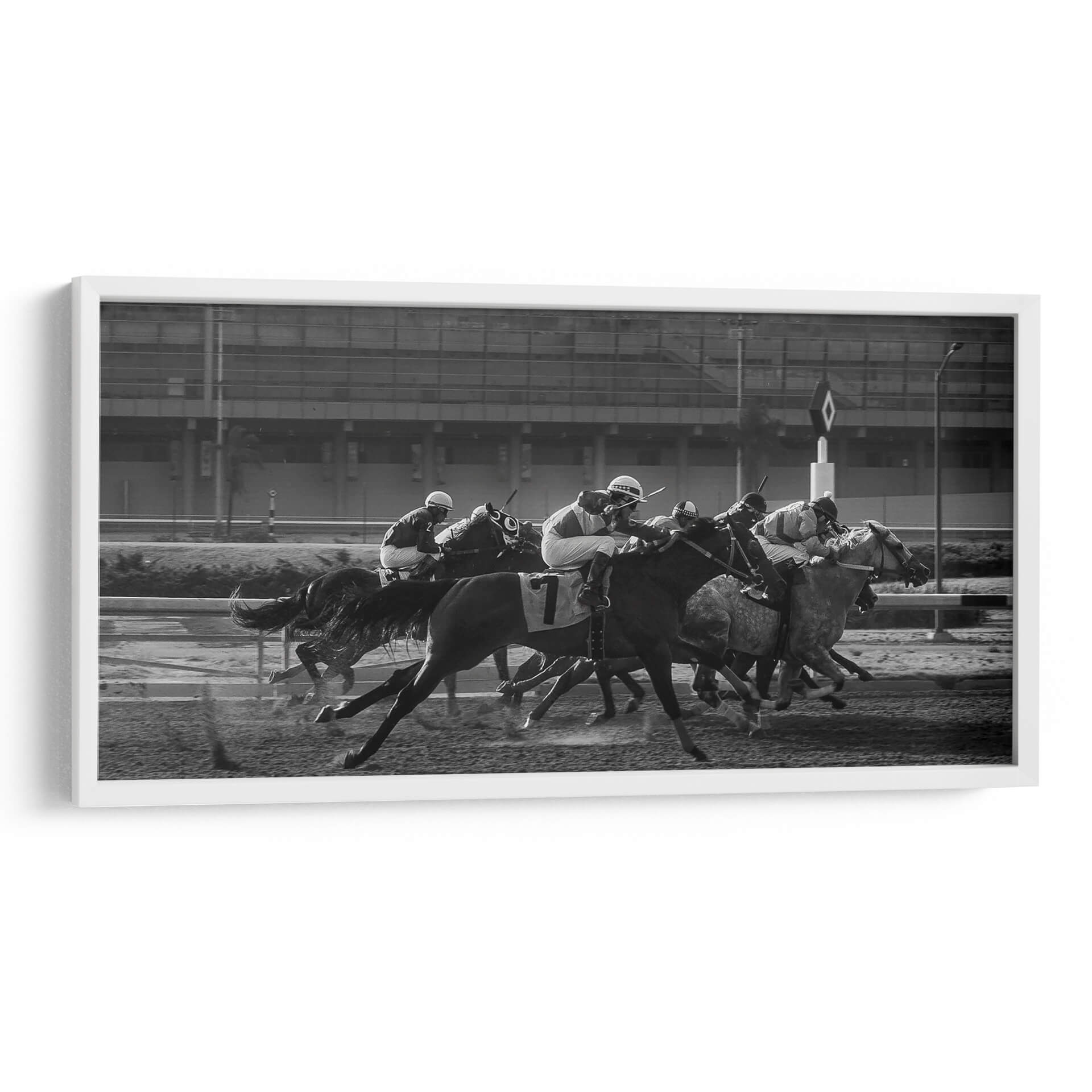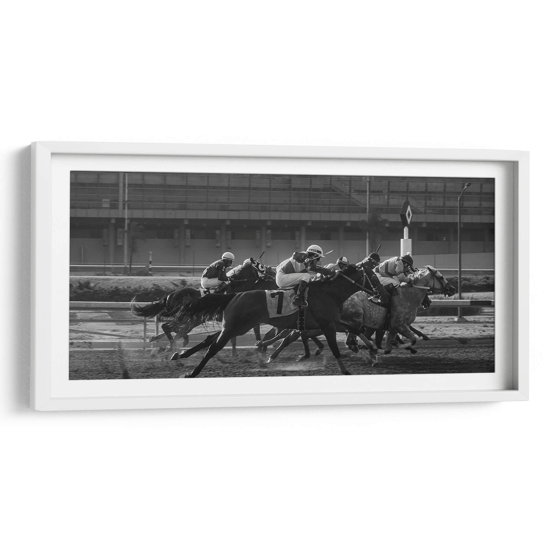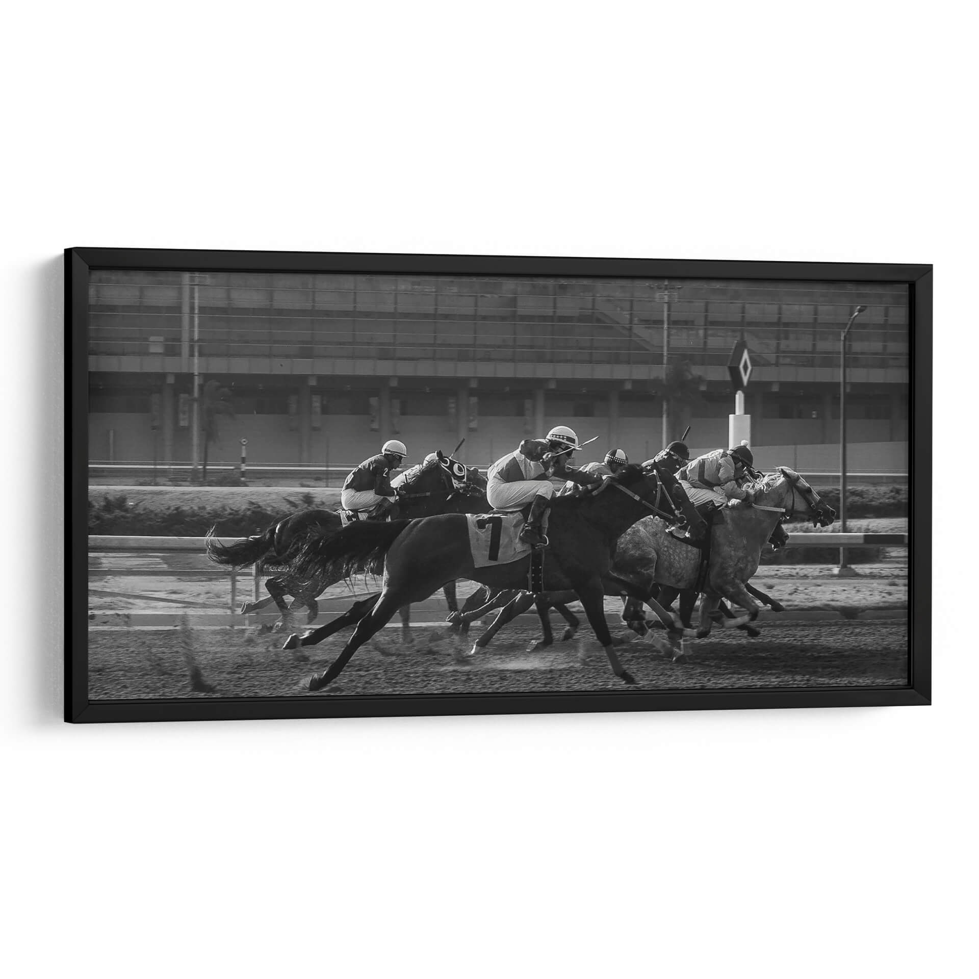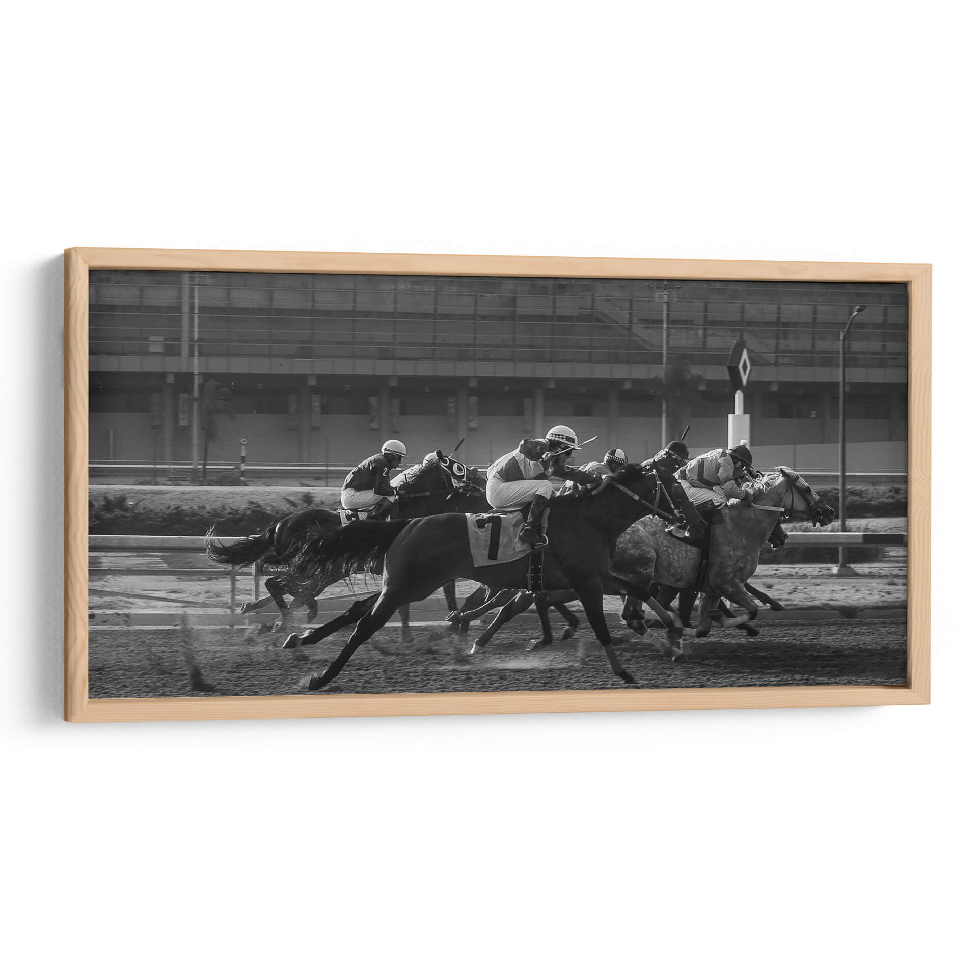Sumérgete en la intensidad y la emoción de la carrera con este impactante cuadro decorativo en blanco y negro, titulado 'El 7 es de la suerte' del artista Christian Castro. La obra captura el momento cumbre de una carrera de caballos, donde la velocidad, la potencia y la determinación de los jinetes y sus equinos se entrelazan en una danza de competición. La paleta monocromática resalta la textura del polvo levantado por las pezuñas y el dinamismo de los cuerpos en pleno galope, creando una atmósfera de adrenalina y esfuerzo palpable. Cada detalle, desde los músculos tensos de los caballos hasta la concentración en los rostros de los jinetes, es capturado con una maestría que invita a la contemplación. Este cuadro decorativo es perfecto para añadir un toque de energía y sofisticación a cualquier espacio, ya sea una sala de estar moderna, un estudio o una oficina. Ideal para amantes del deporte ecuestre y para quienes aprecian el arte que transmite fuerza y movimiento. El estilo fotográfico y la composición audaz hacen de esta pieza un elemento focal que no pasará desapercibido, evocando la emoción del triunfo y la pasión por la victoria.