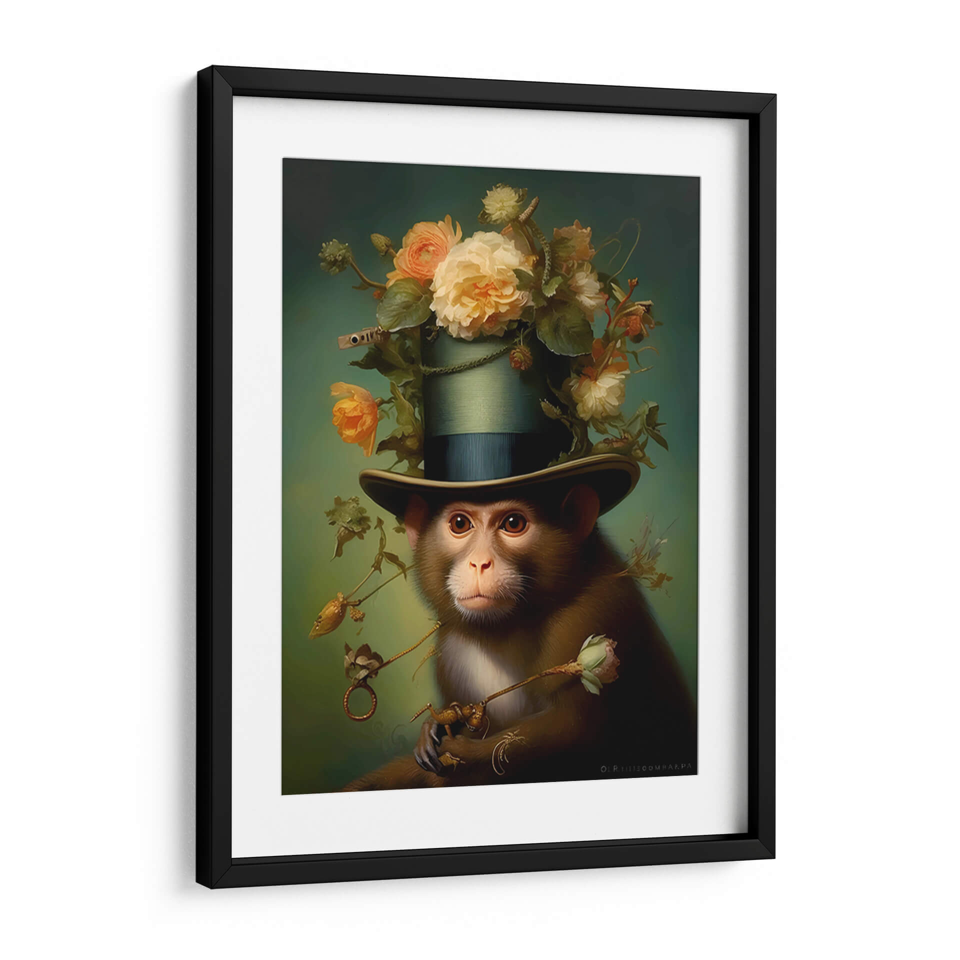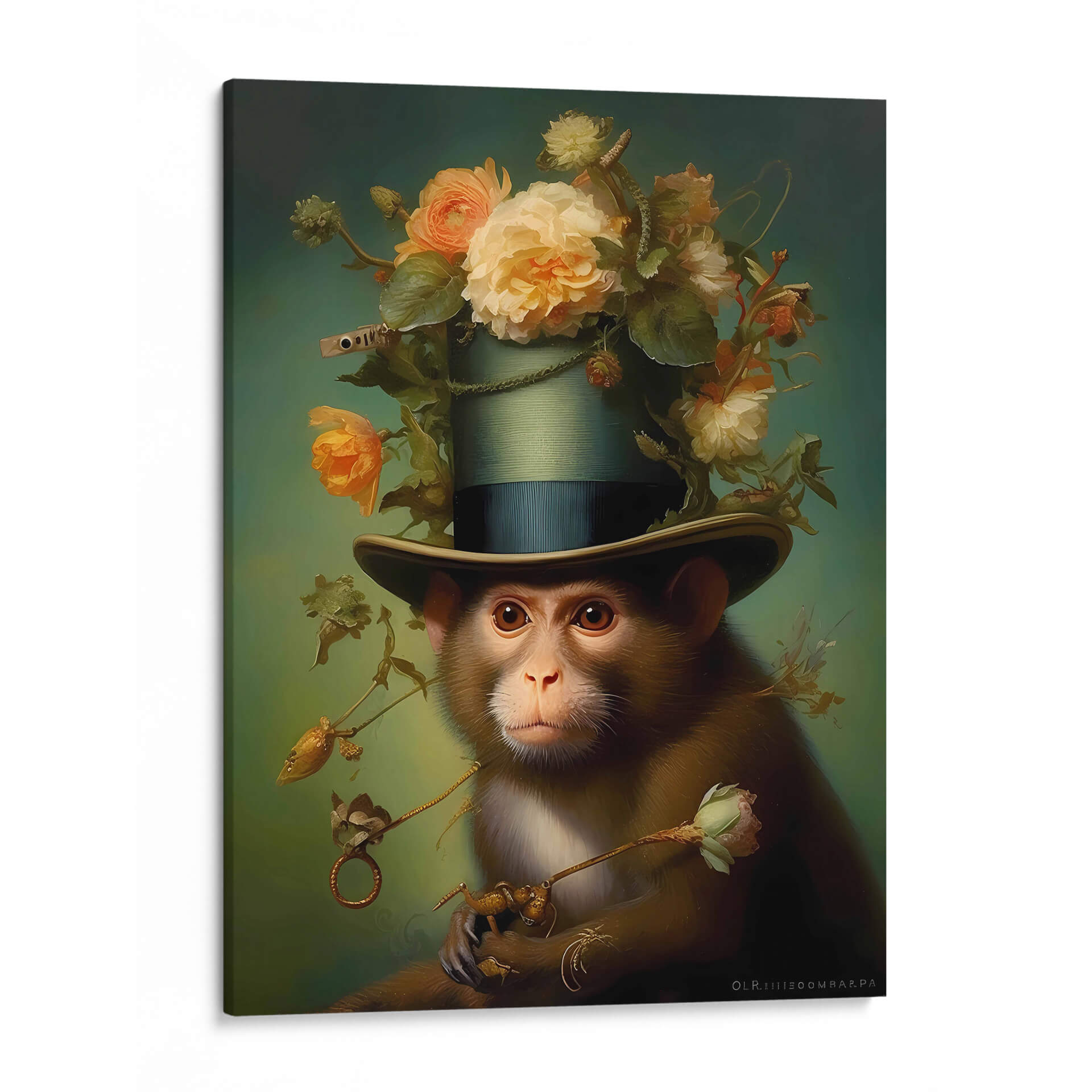 Sumérgete en el fascinante mundo de "El Mono", una obra de arte contemporáneo que desafía las convenciones y cautiva la imaginación. Esta pieza, creada por la talentosa artista Jessica CA, presenta un mono con un aire de distinción, ataviado con un elegante sombrero de copa adornado con un exuberante ramillete de flores en tonos pastel y ocres. La mirada penetrante del primate, combinada con la delicadeza floral, crea un contraste intrigante que invita a la reflexión. La paleta de colores, dominada por verdes profundos y toques cálidos de melocotón y crema, establece una atmósfera serena pero enigmática. El estilo realista, con toques surrealistas y un acabado detallado, resalta la maestría técnica del artista. Este cuadro decorativo es ideal para añadir un toque de originalidad y sofisticación a cualquier espacio, ya sea una sala de estar moderna, un estudio creativo o una oficina que busque inspirar conversación. "El Mono" no es solo una pieza decorativa, sino una invitación a explorar la dualidad entre lo salvaje y lo civilizado, lo natural y lo artificial, convirtiéndose en un punto focal memorable y un tema de conversación asegurado en tu hogar u oficina.