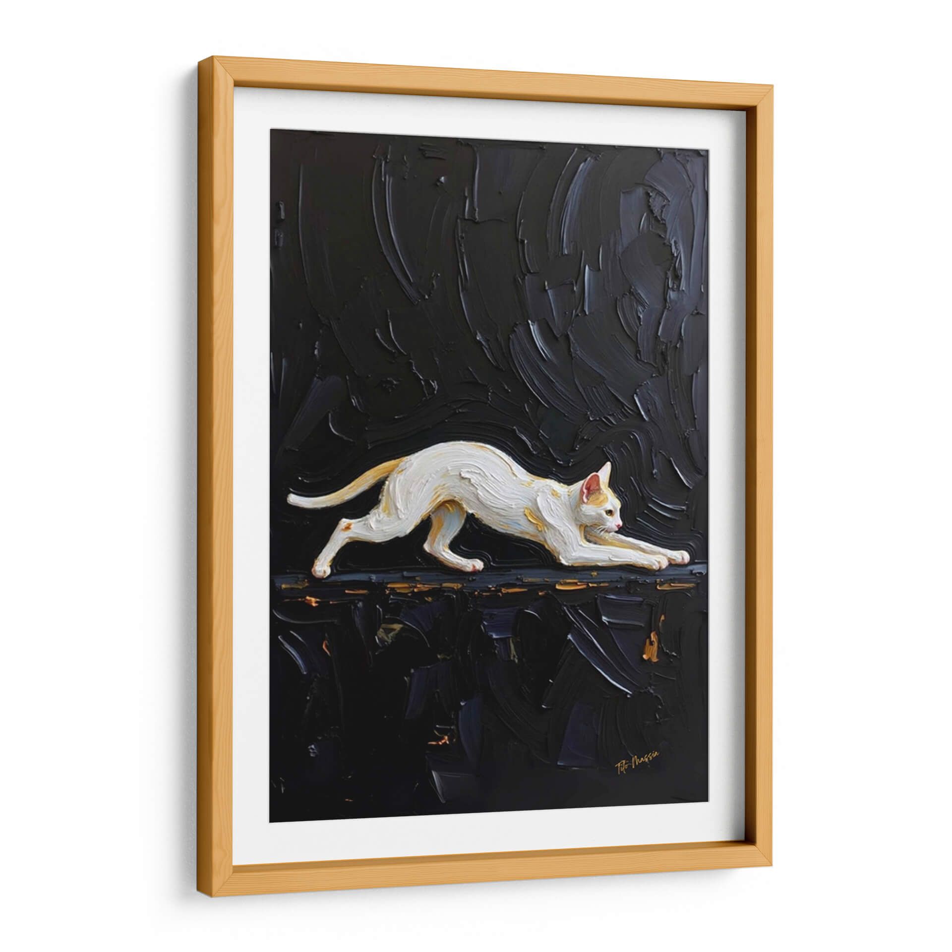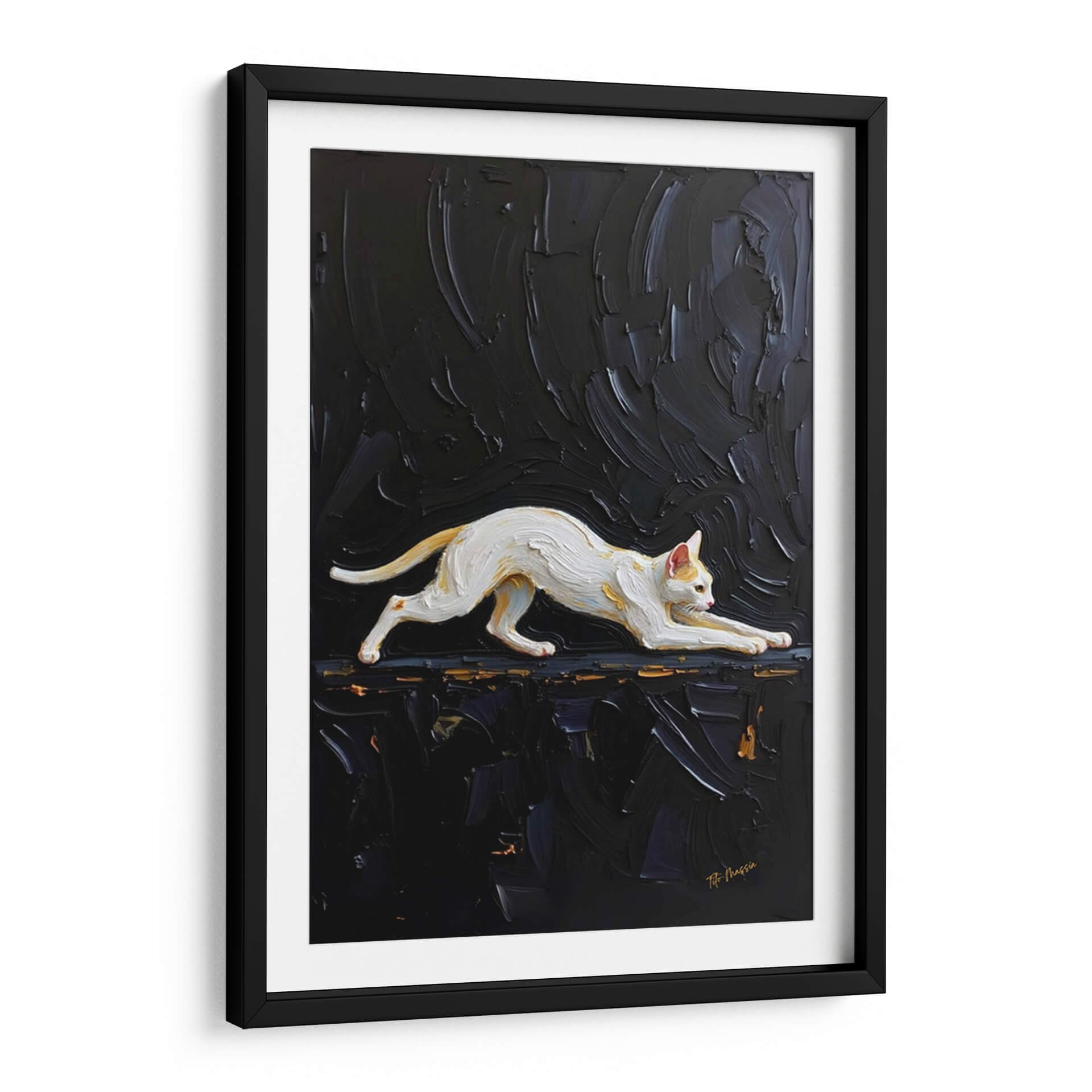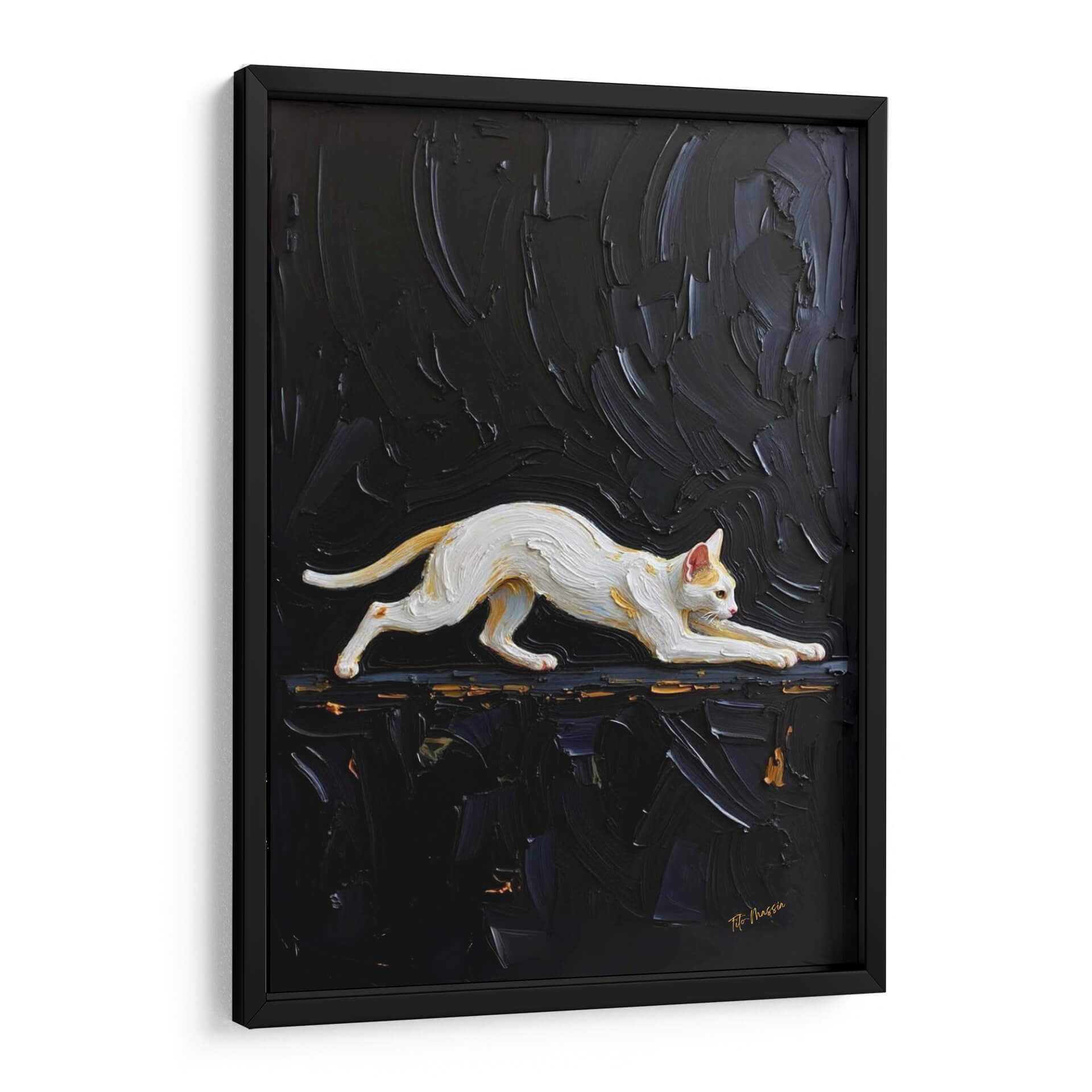 Sumérgete en la enigmática belleza de 'En la Penumbra', una obra maestra del artista Tito Massia que captura la gracia felina en su máxima expresión. Este cuadro decorativo se caracteriza por su audaz contraste entre la figura de un gato blanco y anaranjado, detalladamente texturizado, y un fondo oscuro y dinámico, lleno de pinceladas audaces que sugieren movimiento y profundidad. La paleta de colores se centra en negros profundos, grises sutiles y toques cálidos de blanco y dorado, creando una atmósfera de misterio y elegancia. La técnica empastada añade una dimensión táctil y visual única, invitando al espectador a contemplar la sutileza de las formas y la intensidad de la luz. 'En la Penumbra' es ideal para añadir un toque de sofisticación y un punto de interés intrigante a cualquier espacio, desde una sala de estar moderna hasta un estudio o una oficina. Su estilo contemporáneo y su tema universal lo convierten en una pieza versátil que resonará con amantes del arte y de los animales por igual, aportando un aire de tranquilidad y contemplación a tu decoración.