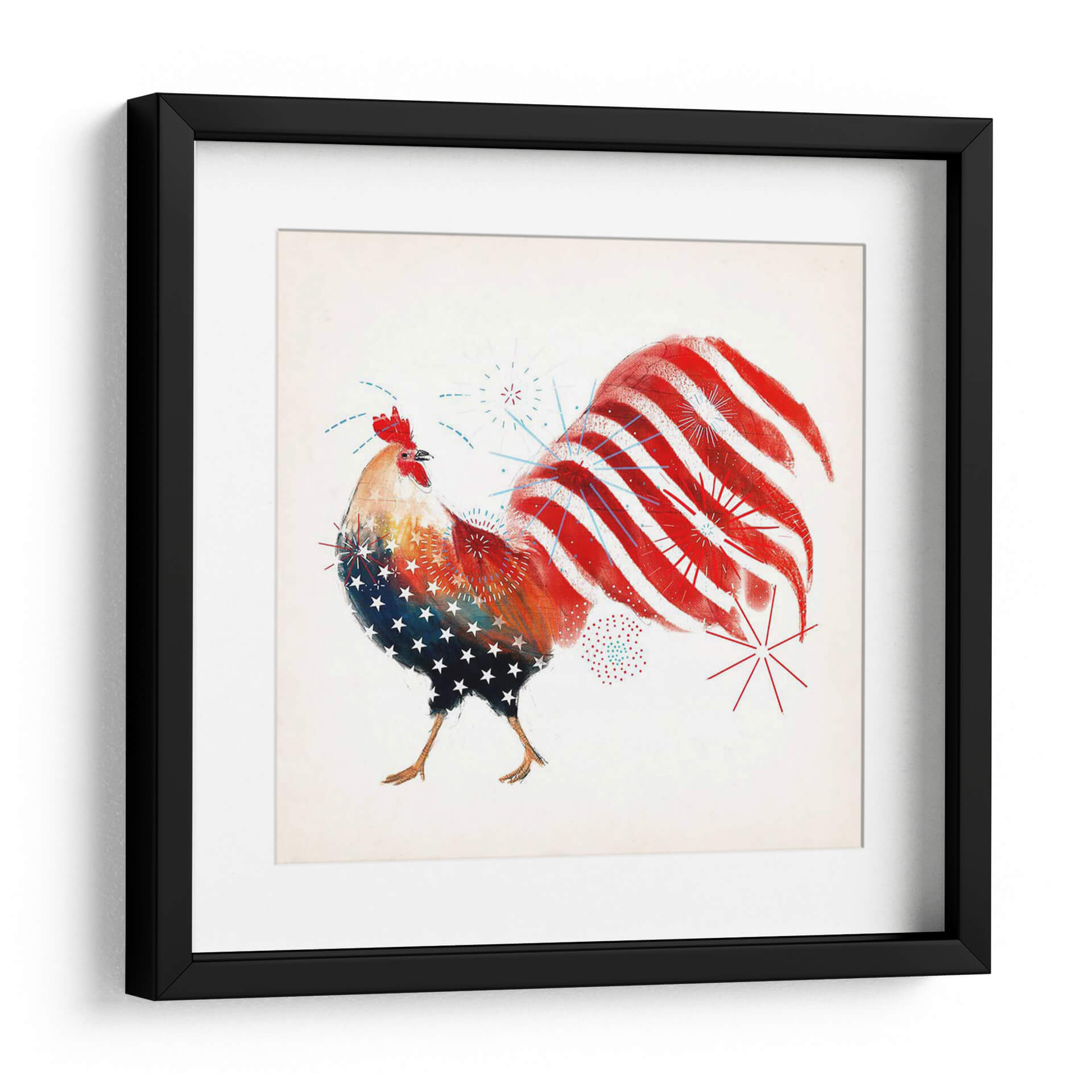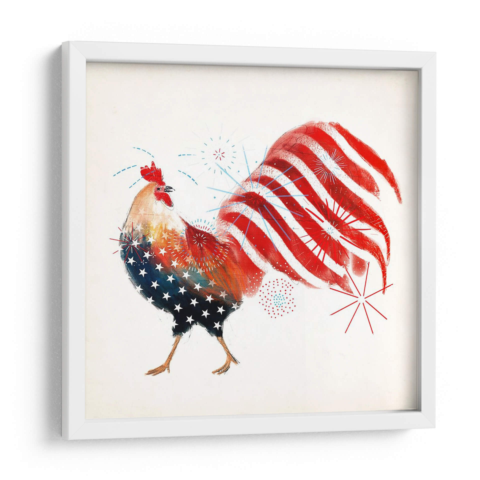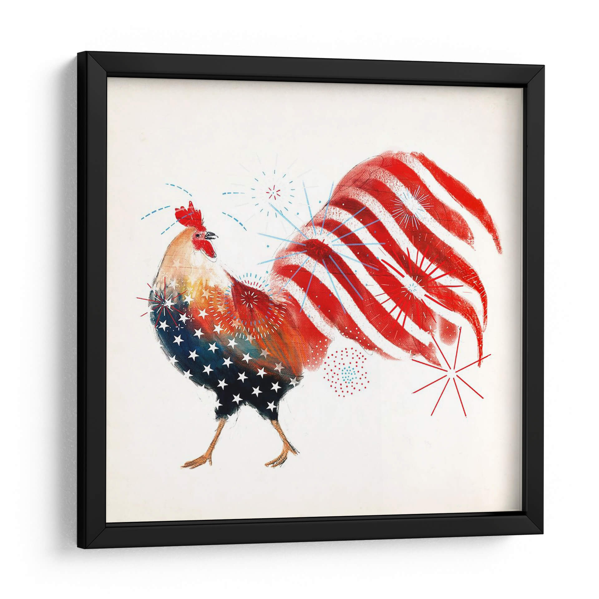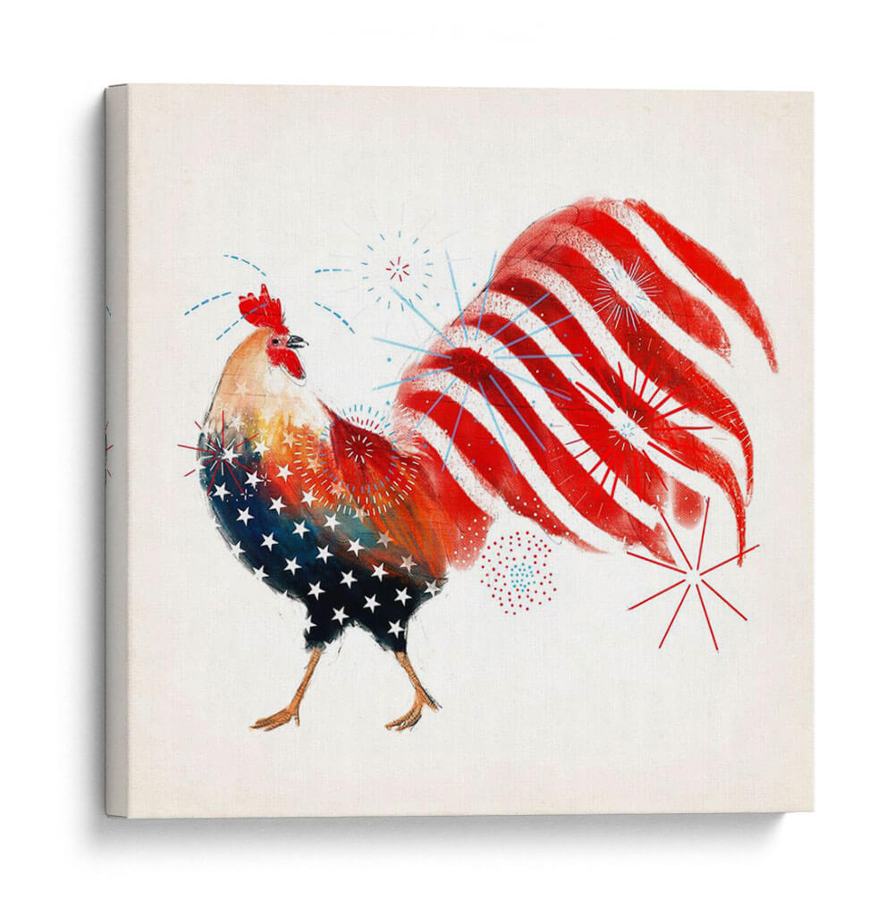 Celebra el espíritu patriótico con el cuadro decorativo "Gallo Fuegos Artificiales I" de Victoria Borges. Esta vibrante obra captura la esencia de la celebración y el orgullo nacional a través de la audaz representación de un gallo. La obra presenta un gallo estilizado, cuyo cuerpo está adornado con un patrón de estrellas blancas sobre un fondo azul, evocando la bandera estadounidense, mientras que su cola se despliega en vibrantes franjas rojas y blancas, simulando fuegos artificiales que explotan en el cielo nocturno. Pequeños detalles de fuegos artificiales azules y rojos salpican el lienzo, añadiendo un toque dinámico y festivo. La paleta de colores se centra en el rojo, blanco y azul, con toques de amarillo y naranja en el cuerpo del gallo, creando un contraste enérgico y cautivador. El estilo artístico, aunque figurativo, posee una cualidad artística y texturizada, sugiriendo una técnica mixta o digital con pinceladas expresivas. Esta pieza es perfecta para infundir un sentido de alegría y patriotismo en cualquier espacio, ideal para una sala de estar, un comedor, o incluso una oficina que busque un punto focal lleno de carácter y energía. "Gallo Fuegos Artificiales I" no es solo una decoración, sino una declaración de espíritu festivo y orgullo.