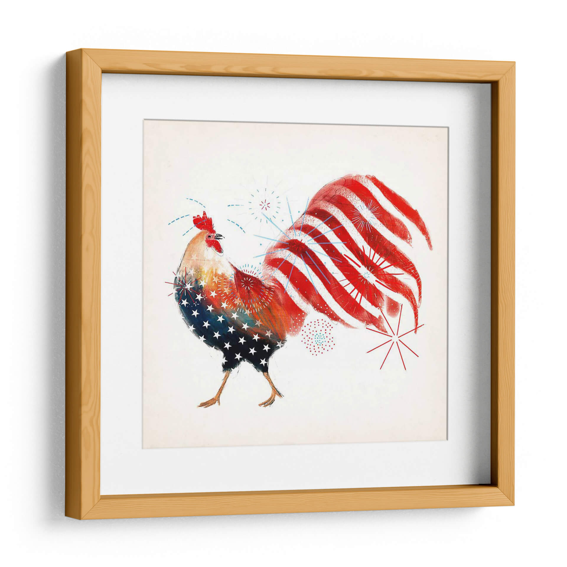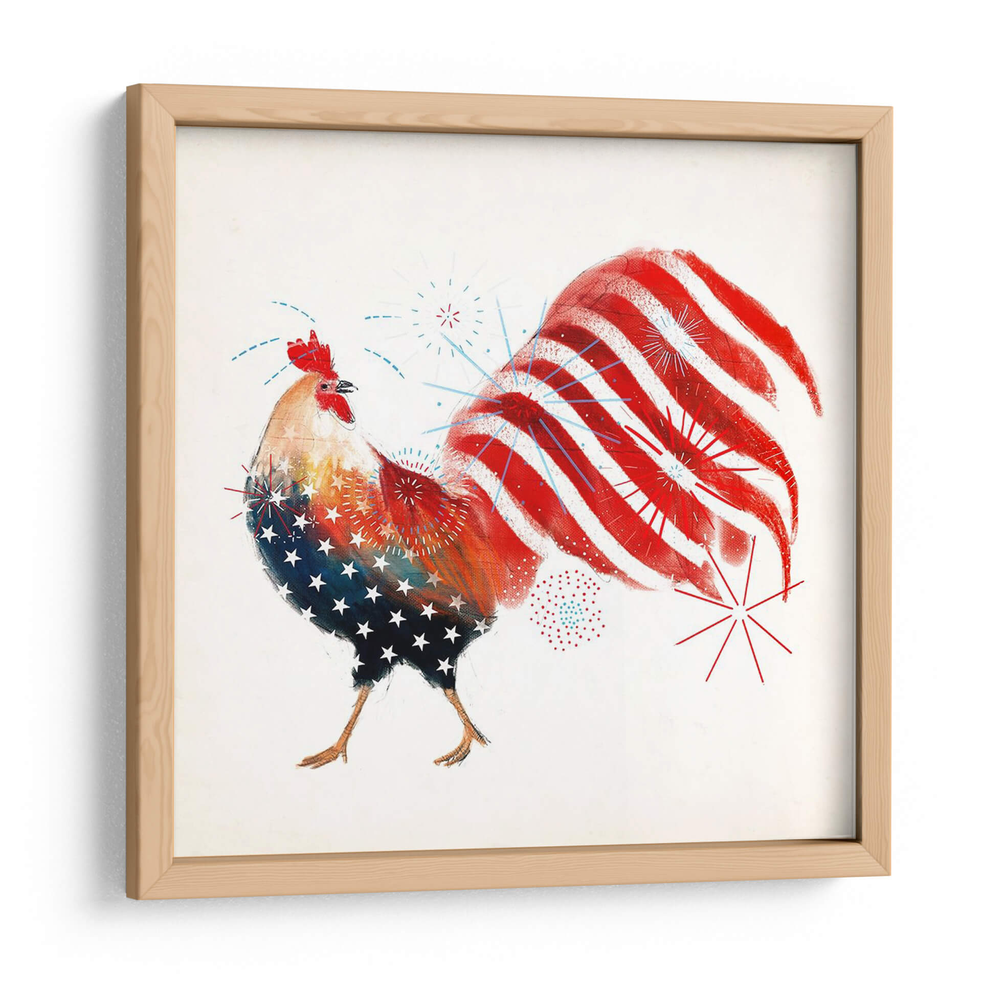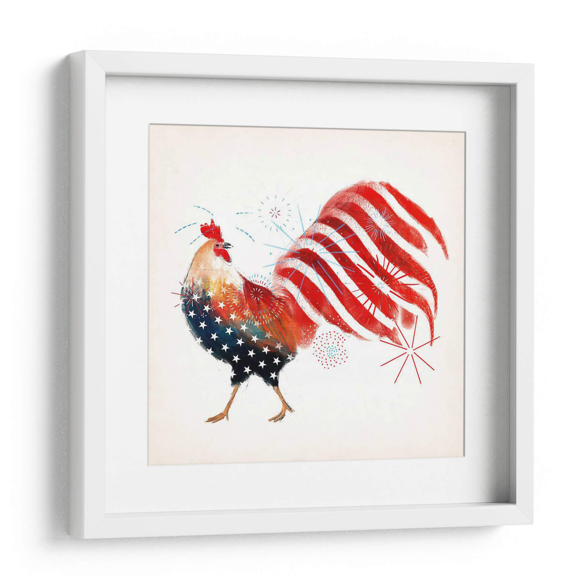 Celebra el espíritu patriótico con el cuadro decorativo "Gallo Fuegos Artificiales I" de Victoria Borges. Esta vibrante obra captura la esencia de la celebración y el orgullo nacional a través de la audaz representación de un gallo. La obra presenta un gallo estilizado, cuyo cuerpo está adornado con un patrón de estrellas blancas sobre un fondo azul, evocando la bandera estadounidense, mientras que su cola se despliega en vibrantes franjas rojas y blancas, simulando fuegos artificiales que explotan en el cielo nocturno. Pequeños detalles de fuegos artificiales azules y rojos salpican el lienzo, añadiendo un toque dinámico y festivo. La paleta de colores se centra en el rojo, blanco y azul, con toques de amarillo y naranja en el cuerpo del gallo, creando un contraste enérgico y cautivador. El estilo artístico, aunque figurativo, posee una cualidad artística y texturizada, sugiriendo una técnica mixta o digital con pinceladas expresivas. Esta pieza es perfecta para infundir un sentido de alegría y patriotismo en cualquier espacio, ideal para una sala de estar, un comedor, o incluso una oficina que busque un punto focal lleno de carácter y energía. "Gallo Fuegos Artificiales I" no es solo una decoración, sino una declaración de espíritu festivo y orgullo.