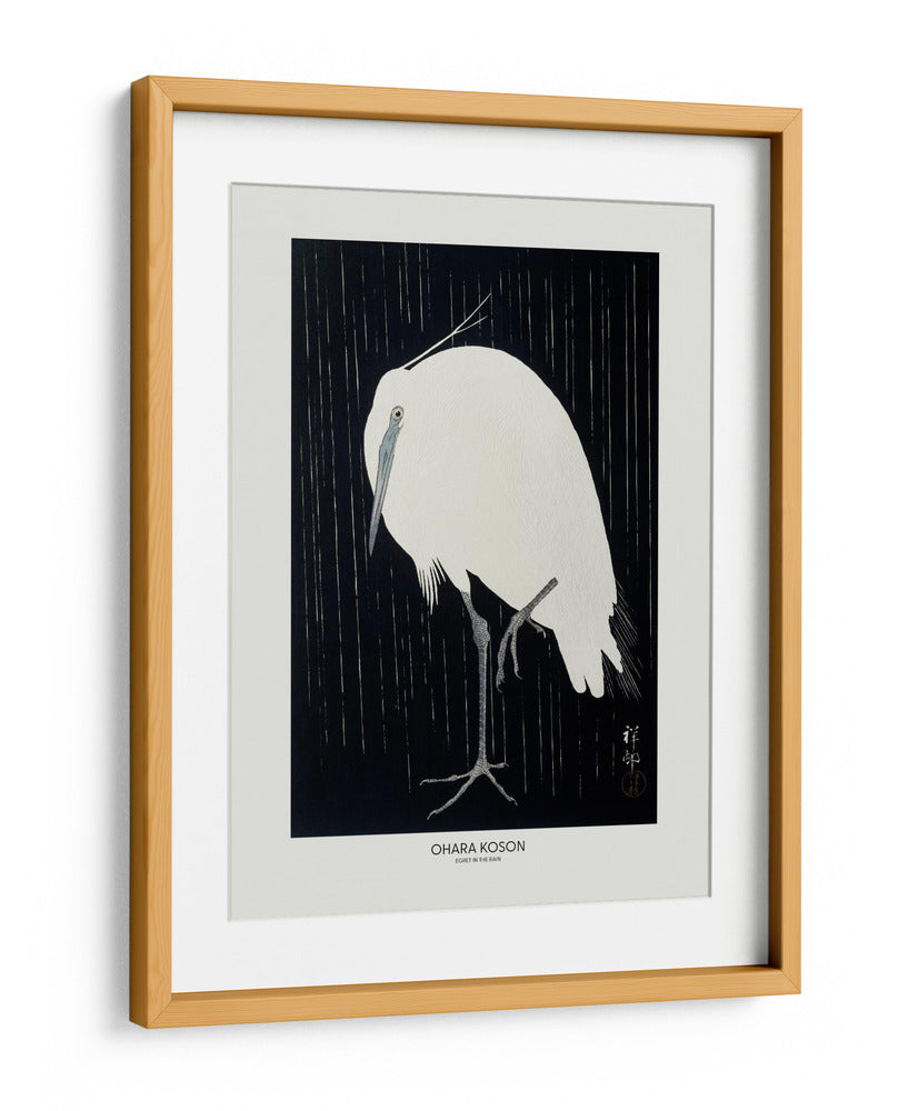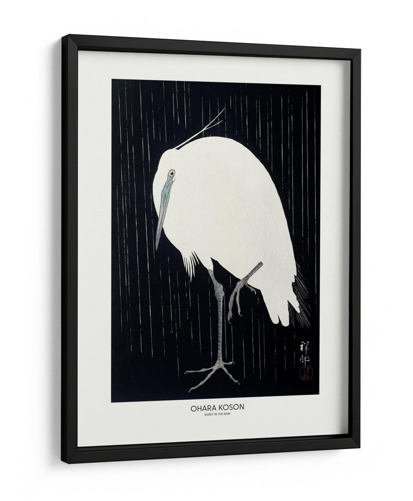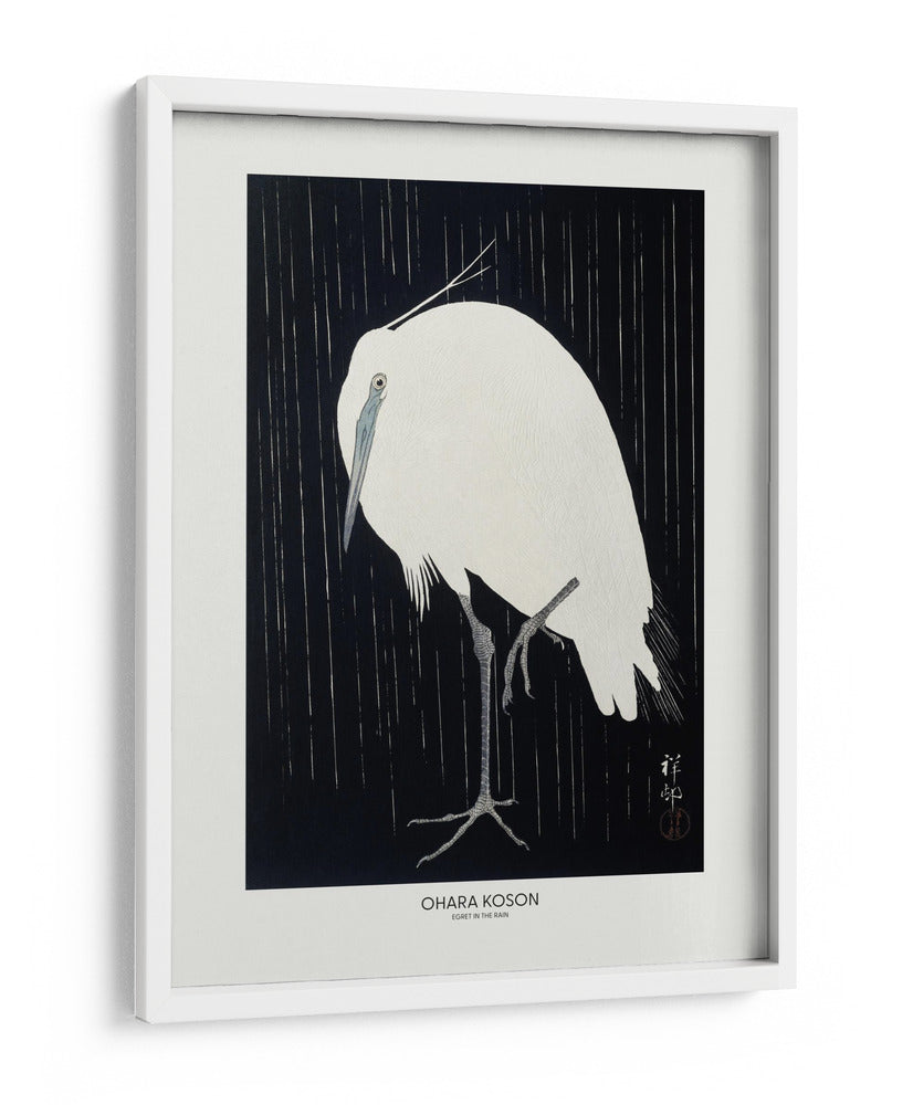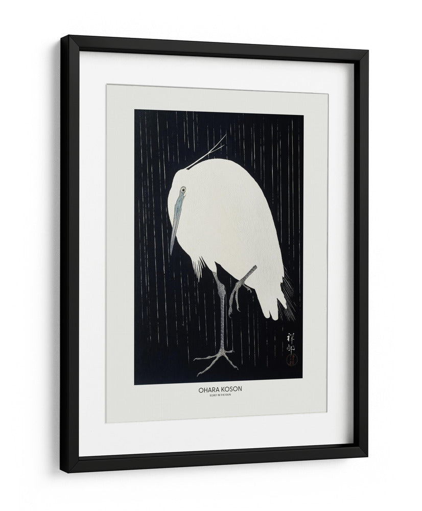Sumérgete en la serenidad de 'Garceta en la Lluvia', una obra maestra de Ohara Koson que captura la quietud y la elegancia en medio de un aguacero. Este cuadro decorativo presenta una garceta blanca, inmóvil y serena, con su plumaje de un blanco puro contrastando dramáticamente contra un fondo oscuro y texturizado que evoca las gotas de lluvia cayendo. La composición es simple pero poderosa, centrada en la figura solitaria de la ave, cuya delicada silueta y el plumaje detallado transmiten una sensación de paz profunda y contemplación. Los sutiles tonos azules y grises en el pico y las patas de la garceta añaden un toque de color que realza su presencia sin romper la armonía monocromática. El estilo, inspirado en el arte tradicional japonés, aporta una estética atemporal y sofisticada. Esta pieza es ideal para añadir un toque de calma y refinamiento a cualquier espacio, ya sea un dormitorio tranquilo, un estudio meditativo o una sala de estar minimalista. Imagina la atmósfera de paz que este cuadro aportará a tu hogar, invitando a la reflexión y al disfrute de la belleza serena de la naturaleza. Un verdadero tesoro visual que conecta con la tranquilidad interior.