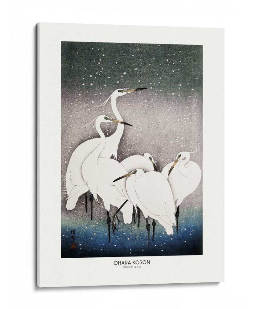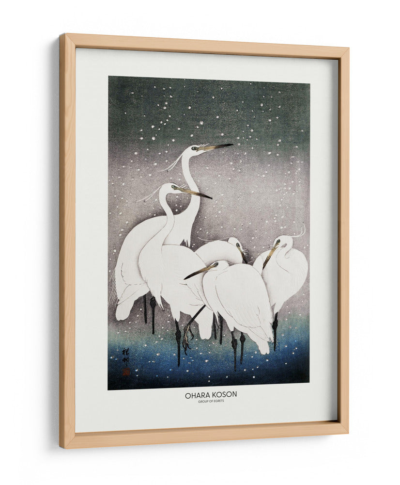 Sumérgete en la serena belleza de "Grupo de Garzas", una obra maestra del renombrado artista Ohara Koson. Este cautivador cuadro decorativo captura un momento de tranquilidad invernal, con un grupo de elegantes garzas blancas reunidas bajo un cielo salpicado de estrellas o copos de nieve. La paleta de colores, dominada por blancos puros, azules profundos y grises sutiles, crea una atmósfera de paz y contemplación. Los detalles finos en el plumaje de las aves y la textura del entorno sugieren la maestría del artista en evocar la naturaleza con delicadeza. Este cuadro es ideal para quienes buscan infundir calma y sofisticación en sus espacios, ya sea en un dormitorio, un estudio o una sala de estar. Su composición equilibrada y su tema atemporal lo convierten en una adición versátil y elegante a cualquier decoración, aportando un toque de arte japonés tradicional con un enfoque contemporáneo. Una pieza que invita a la reflexión y eleva el ambiente de cualquier hogar u oficina.