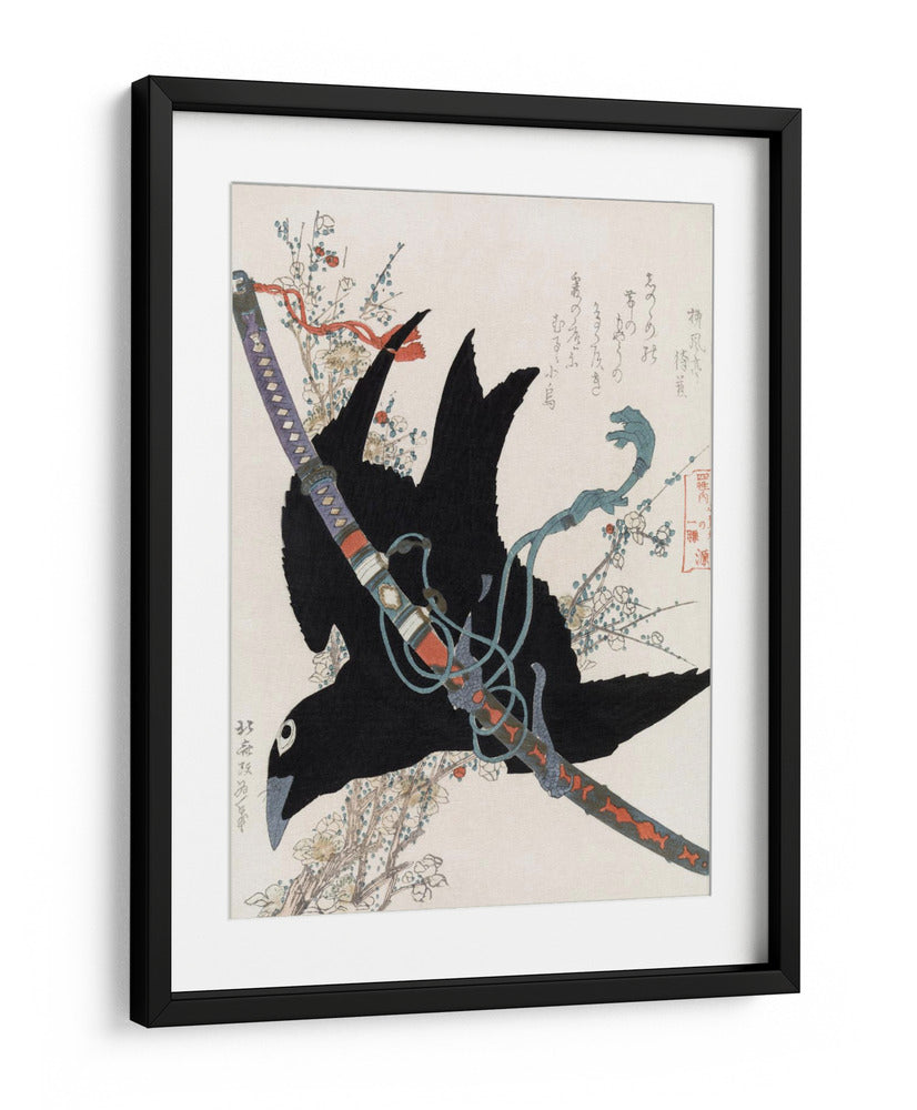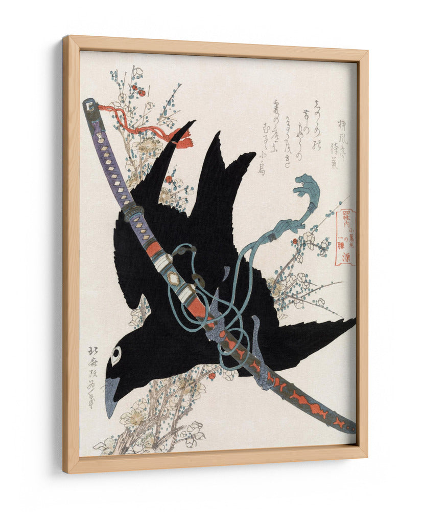 Sumérgete en la enigmática belleza de "Hokusai: Una comparación de poemas Genroku y conchas" de Fluidys, una obra que evoca la majestuosidad y el misterio. Esta impactante pieza presenta un cuervo negro como figura central, con sus alas extendidas y una espada de samurái estratégicamente colocada sobre su silueta, creando un contraste visual fascinante. La delicadeza de las ramas florales y los pequeños frutos que rodean al cuervo aportan un toque de naturaleza y serenidad, contrastando con la fuerza implícita del guerrero. La paleta de colores, dominada por el negro profundo del ave, el morado y rojo vibrante de la katana, y los tonos suaves y terrosos del fondo y la vegetación, crea una atmósfera equilibrada y cautivadora. El estilo evoca la tradición del ukiyo-e japonés, con líneas definidas y una composición dinámica que invita a la contemplación. Este cuadro decorativo es ideal para aquellos que buscan añadir un elemento de sofisticación, intriga y conexión con la cultura japonesa a sus espacios. Perfecto para salones modernos, estudios o cualquier lugar donde se desee un punto focal audaz y con carácter.