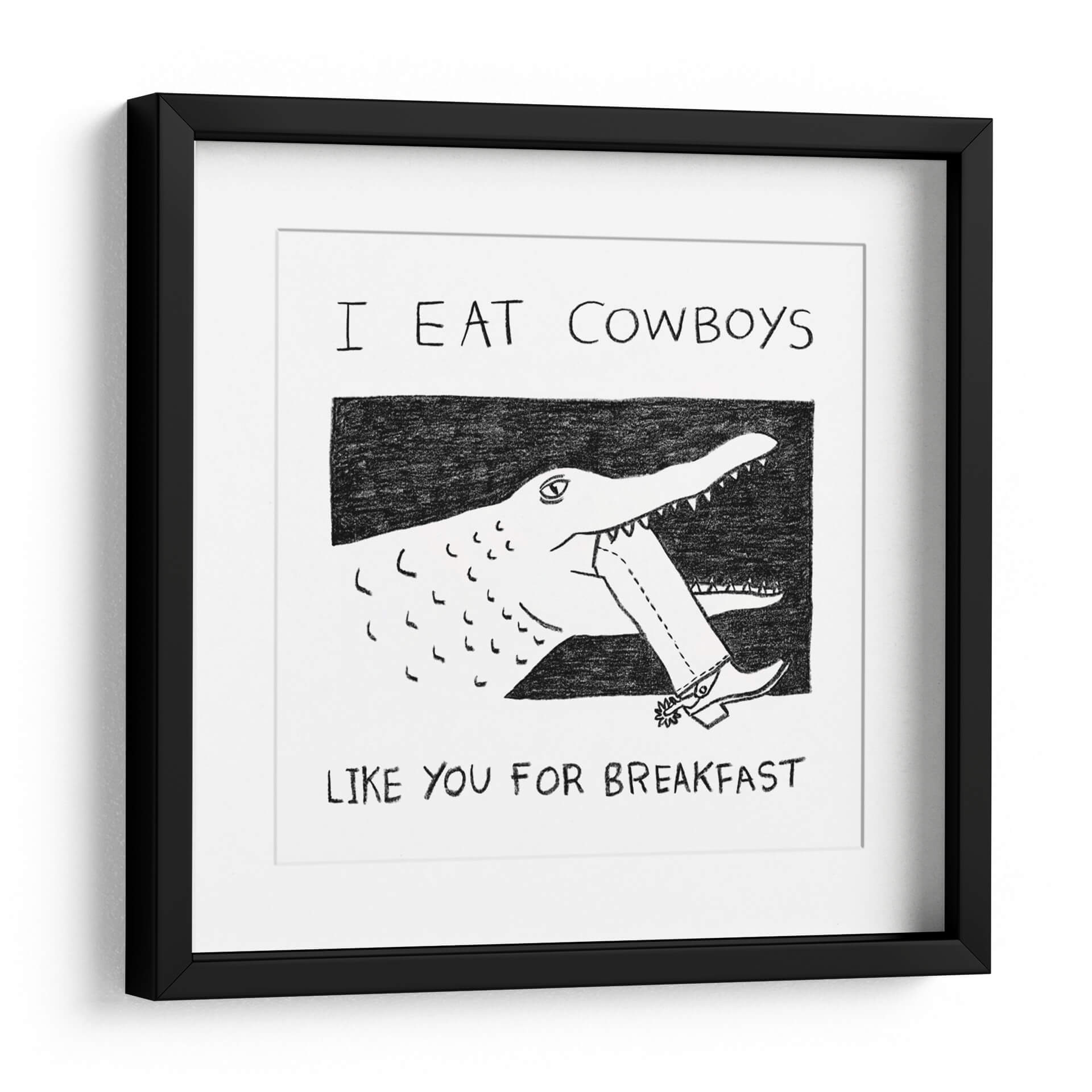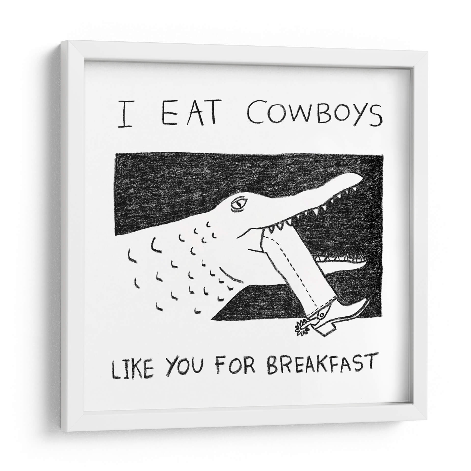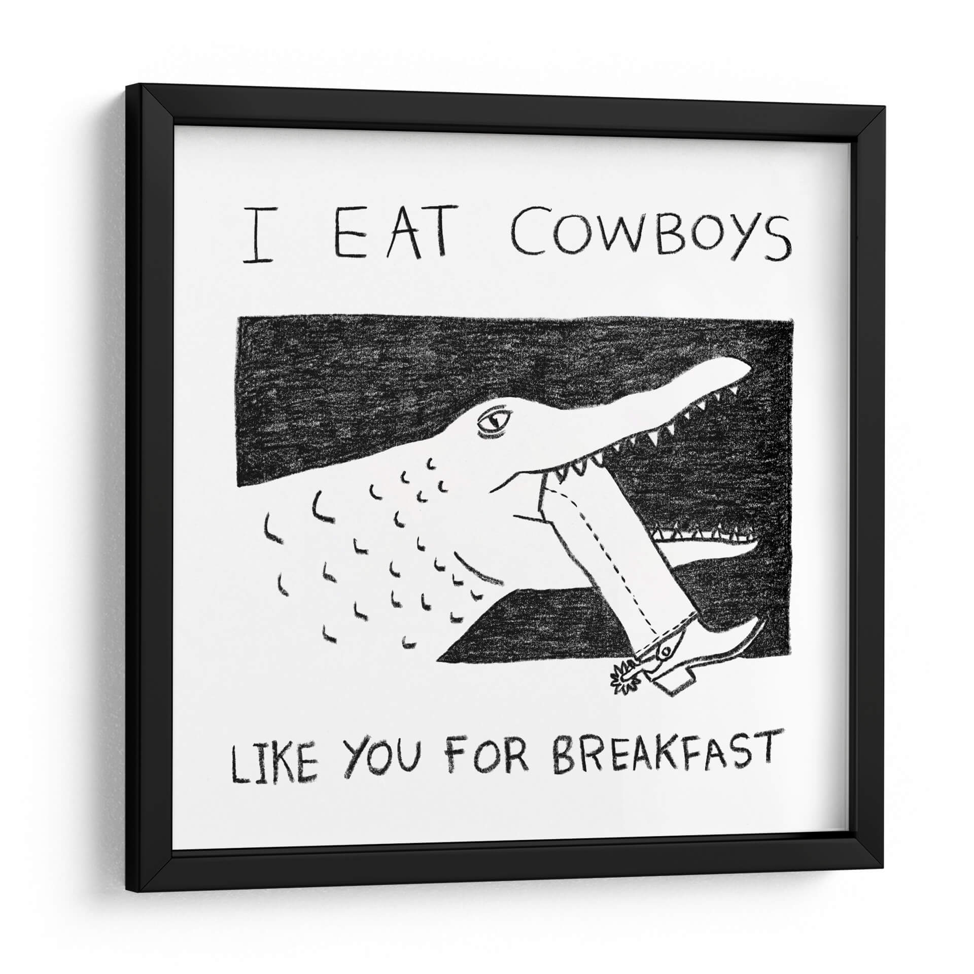 Despierta la conversación y el humor en tu espacio con el cuadro decorativo "I Eat Cowboys Like You for Breakfast". Esta obra de arte única presenta una ilustración audaz y minimalista en blanco y negro, donde un cocodrilo de trazo expresivo muerde el pantalón de un cowboy, desafiando las convenciones con una estética irreverente. La composición, centrada en esta acción surrealista, utiliza líneas sencillas pero efectivas para crear una imagen impactante y memorable. La paleta monocromática, con contrastes marcados entre el negro y el blanco, otorga a la pieza una modernidad y versatilidad excepcionales, permitiéndole integrarse fácilmente en cualquier esquema de decoración. Ideal para quienes buscan un toque de carácter y originalidad, este cuadro es perfecto para salas de estar, estudios o espacios de ocio que deseen reflejar una personalidad audaz y un sentido del humor peculiar. Añade un punto focal inesperado y lleno de personalidad a tu hogar u oficina con esta pieza que seguro no pasará desapercibida, invitando a la reflexión y a la sonrisa.