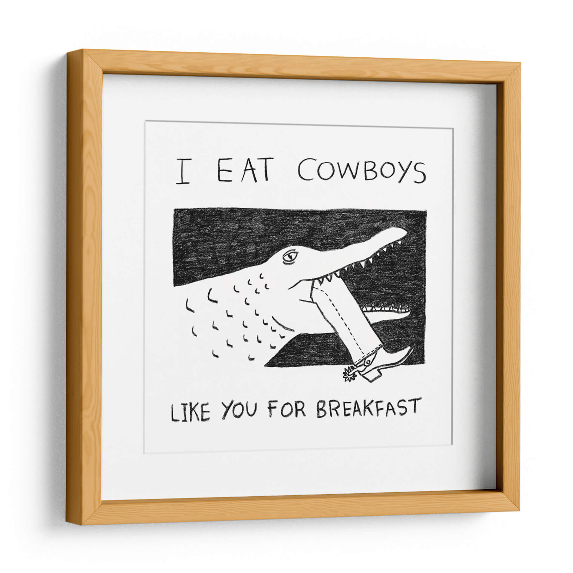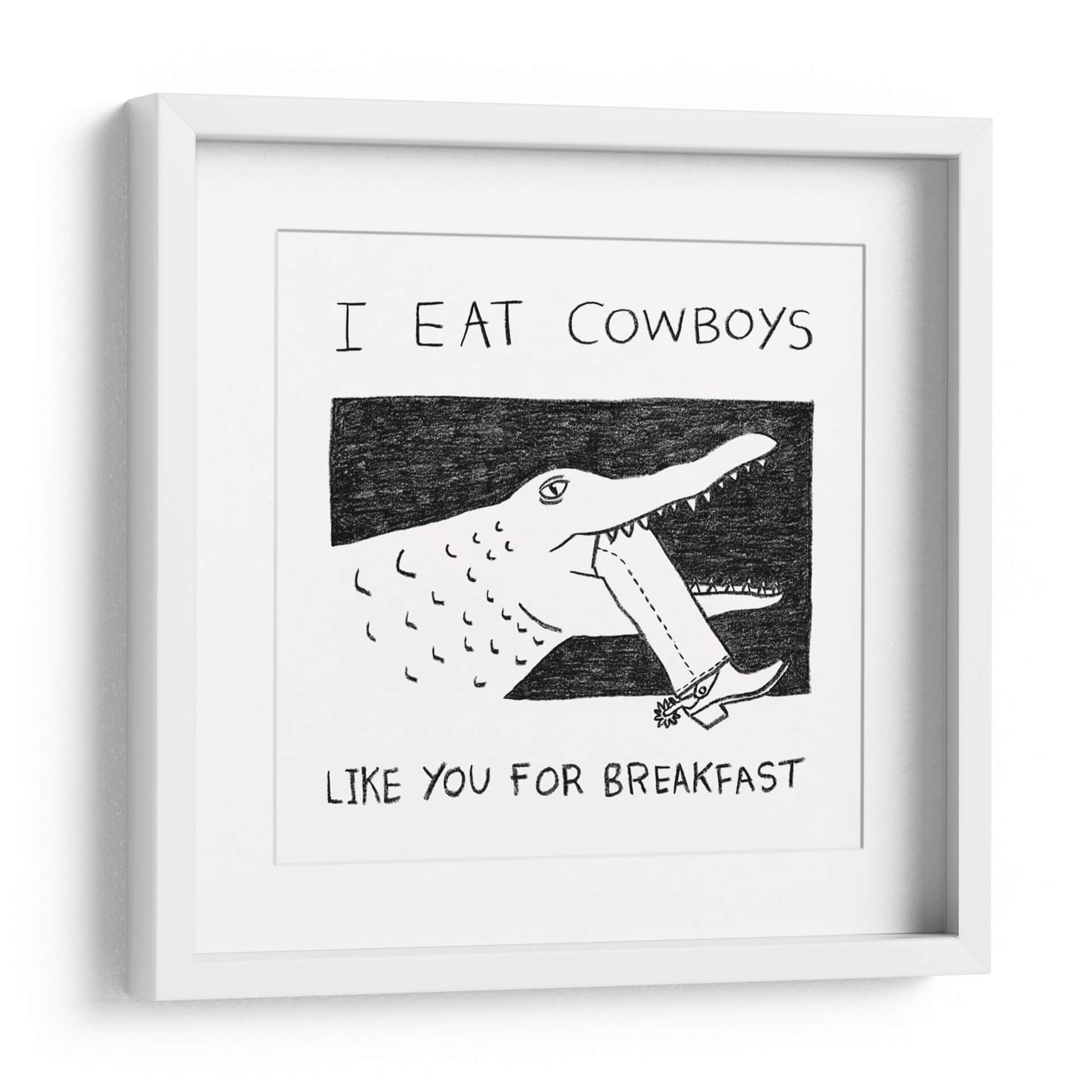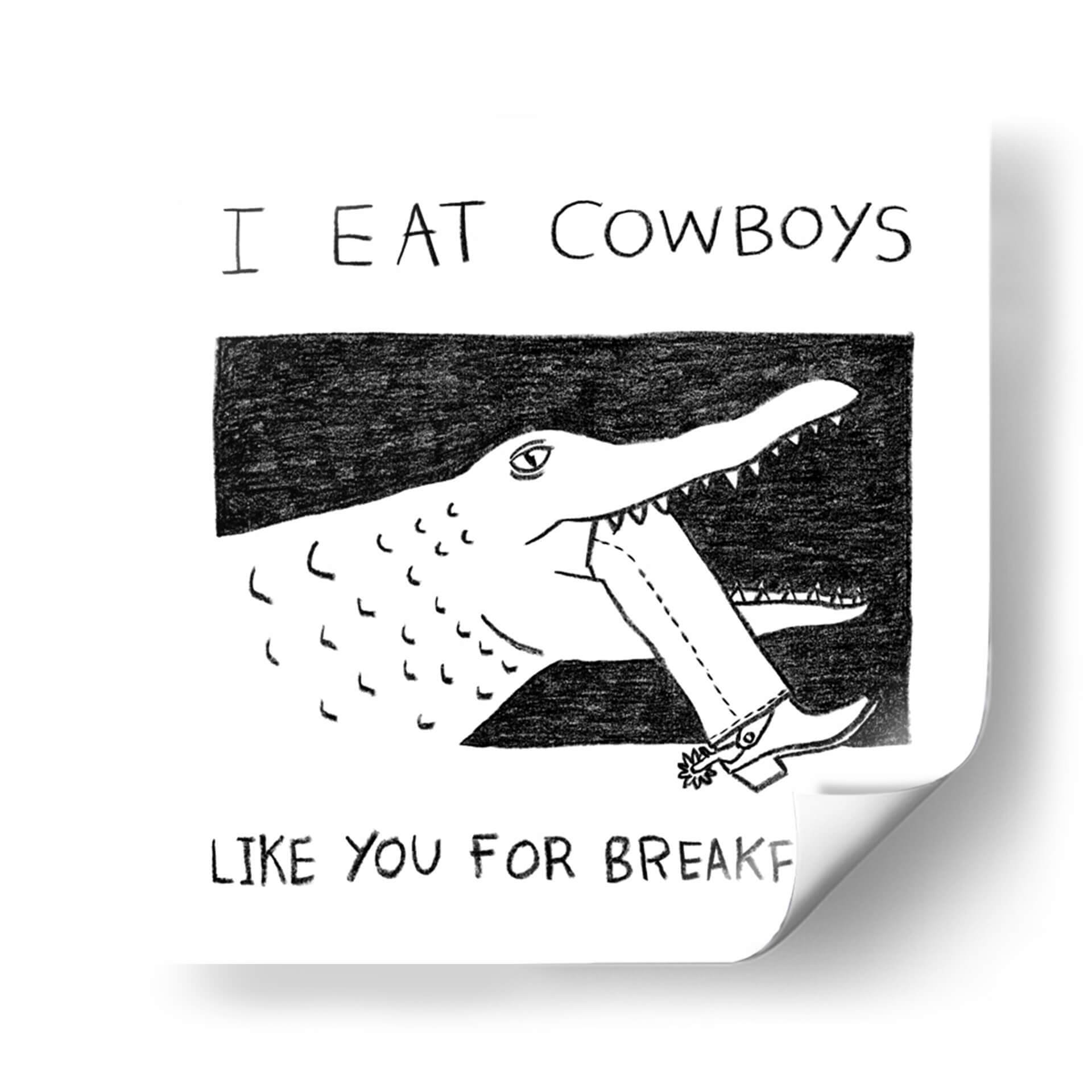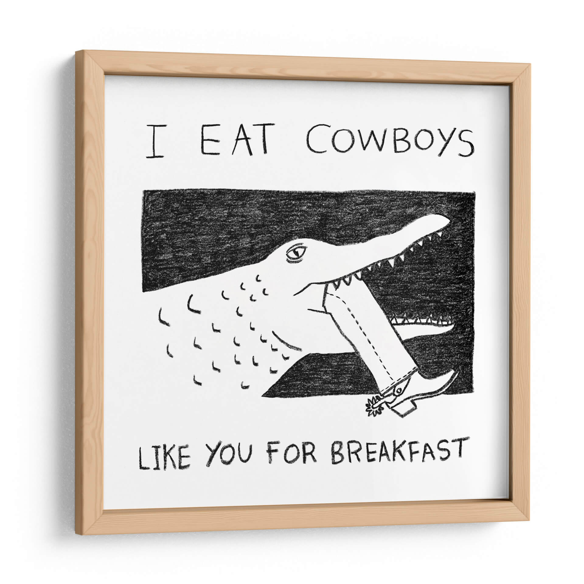 Despierta la conversación y el humor en tu espacio con el cuadro decorativo "I Eat Cowboys Like You for Breakfast". Esta obra de arte única presenta una ilustración audaz y minimalista en blanco y negro, donde un cocodrilo de trazo expresivo muerde el pantalón de un cowboy, desafiando las convenciones con una estética irreverente. La composición, centrada en esta acción surrealista, utiliza líneas sencillas pero efectivas para crear una imagen impactante y memorable. La paleta monocromática, con contrastes marcados entre el negro y el blanco, otorga a la pieza una modernidad y versatilidad excepcionales, permitiéndole integrarse fácilmente en cualquier esquema de decoración. Ideal para quienes buscan un toque de carácter y originalidad, este cuadro es perfecto para salas de estar, estudios o espacios de ocio que deseen reflejar una personalidad audaz y un sentido del humor peculiar. Añade un punto focal inesperado y lleno de personalidad a tu hogar u oficina con esta pieza que seguro no pasará desapercibida, invitando a la reflexión y a la sonrisa.