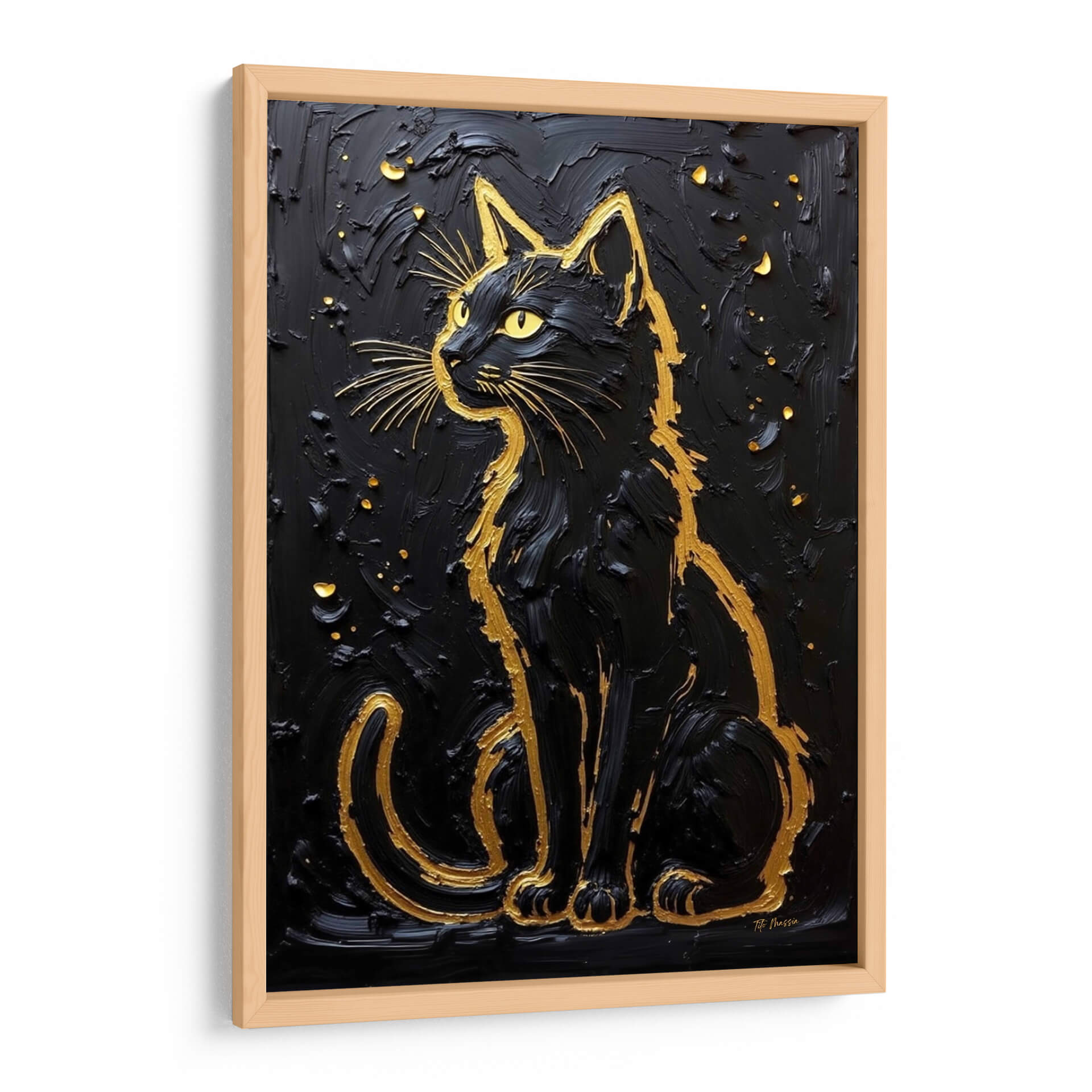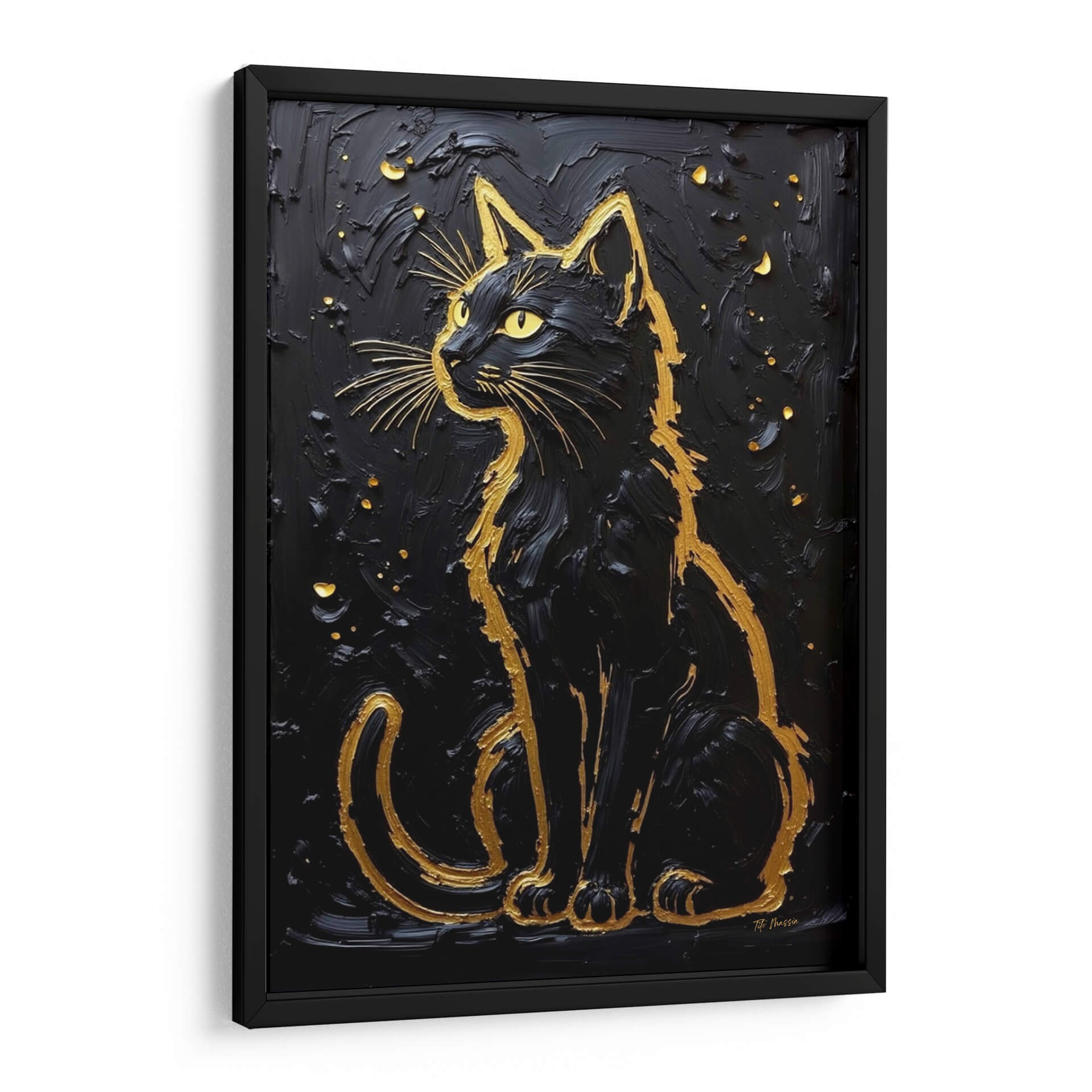 Este cautivador cuadro decorativo, titulado 'Ícono Felino' del artista Tito Massia, presenta un majestuoso gato negro delineado en vibrante oro sobre un fondo texturizado y profundo. La obra de arte captura la elegancia y el misterio inherentes a estos enigmáticos felinos, utilizando un contraste audaz de negro y dorado que evoca lujo y sofisticación. La aplicación de la pintura, con sus pinceladas audaces y relieves, añade una dimensión táctil y visual que invita a la contemplación, similar a una escultura tridimensional. Las sutiles salpicaduras doradas dispersas en el fondo simulan un cielo estrellado o un brillo etéreo, realzando la figura central y creando una atmósfera de ensueño y magia. Este 'Ícono Felino' es una pieza versátil, perfecta para añadir un toque de elegancia contemporánea y un aire de misterio a cualquier sala de estar, dormitorio, oficina o incluso un espacio comercial. Su diseño impactante y su paleta de colores atemporal lo convierten en un punto focal ideal para interiores modernos, minimalistas o con un estilo ecléctico, ofreciendo una declaración de estilo audaz y refinada que sin duda atraerá miradas y generará conversación.