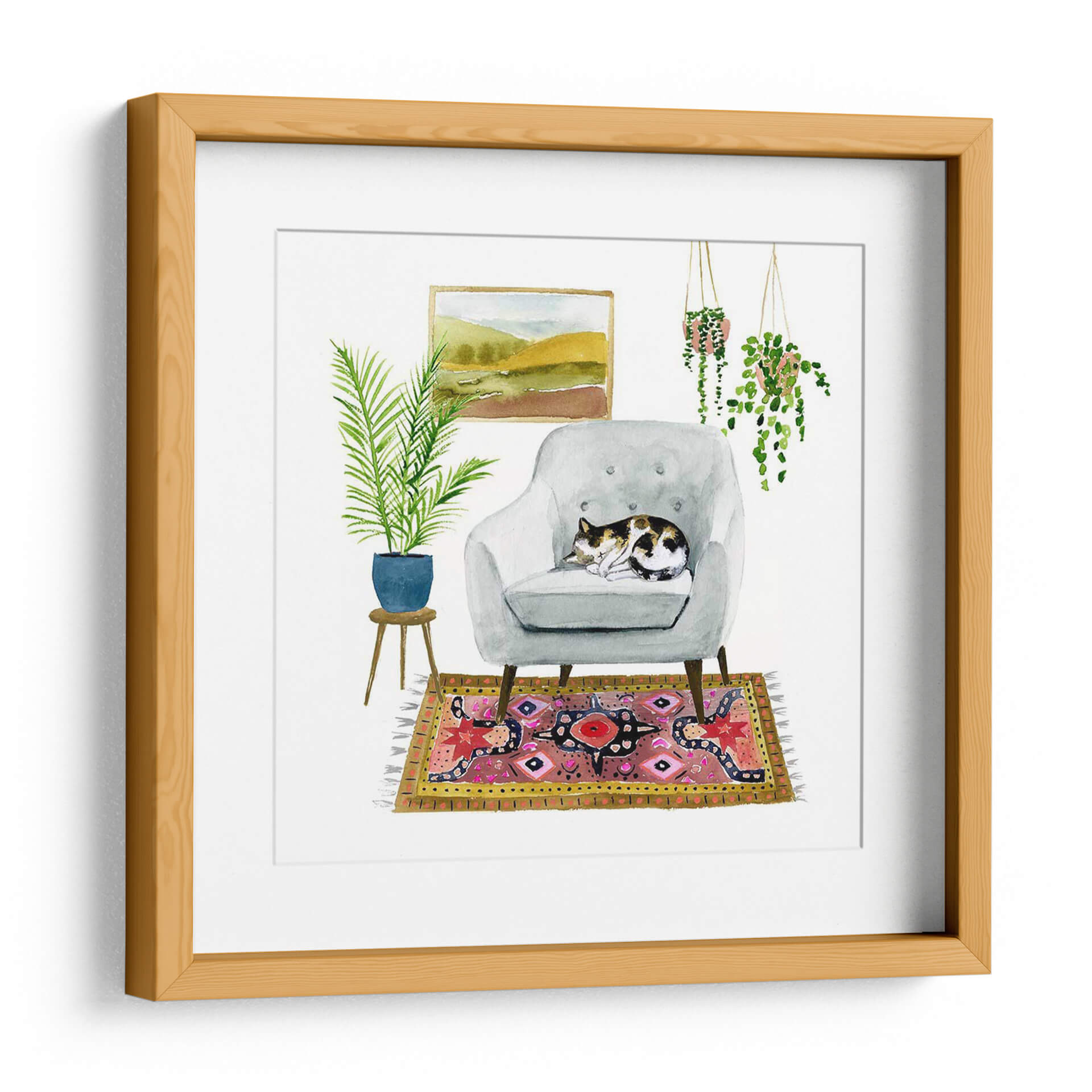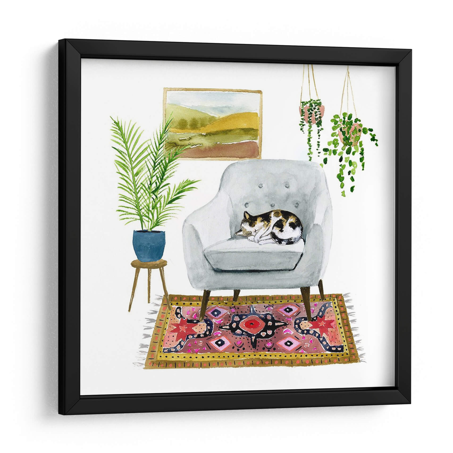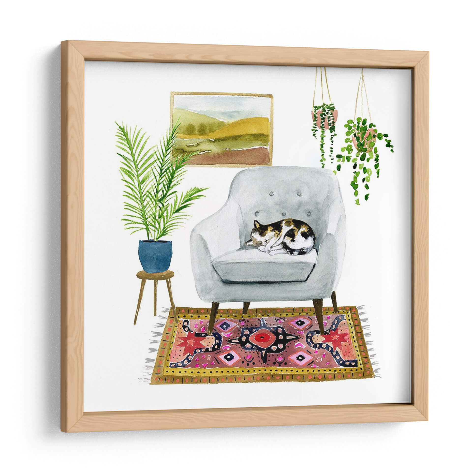 Captura la esencia de la tranquilidad y el confort hogareño con "Iniciobody Ii" de Victoria Borges, una obra de arte que evoca la serenidad de un momento de descanso. Esta pieza, realizada con una delicada técnica de acuarela, presenta un gato atigrado dormitando plácidamente en un sillón gris suave, rodeado de elementos que invitan a la calma. Un cuadro de paisaje sutil con tonos tierra y verdes se asoma en la pared, mientras que dos plantas colgantes añaden un toque de vitalidad natural al ambiente. La alfombra geométrica, con sus vibrantes patrones en tonos rosados y ocres, ancla la composición y aporta un aire bohemio y acogedor. La paleta de colores, dominada por tonos suaves y terrosos, crea una atmósfera de paz y recogimiento, perfecta para espacios donde se busca la relajación. Este cuadro decorativo es ideal para añadir un punto de calidez y personalidad a tu sala de estar, dormitorio o estudio. La habilidad de Borges para capturar la intimidad de la escena y la dulzura del animal lo convierte en una adición encantadora a cualquier hogar, aportando una sensación de bienestar y un refugio visual. Transforma tu pared en un oasis de serenidad con esta hermosa representación de la vida cotidiana.