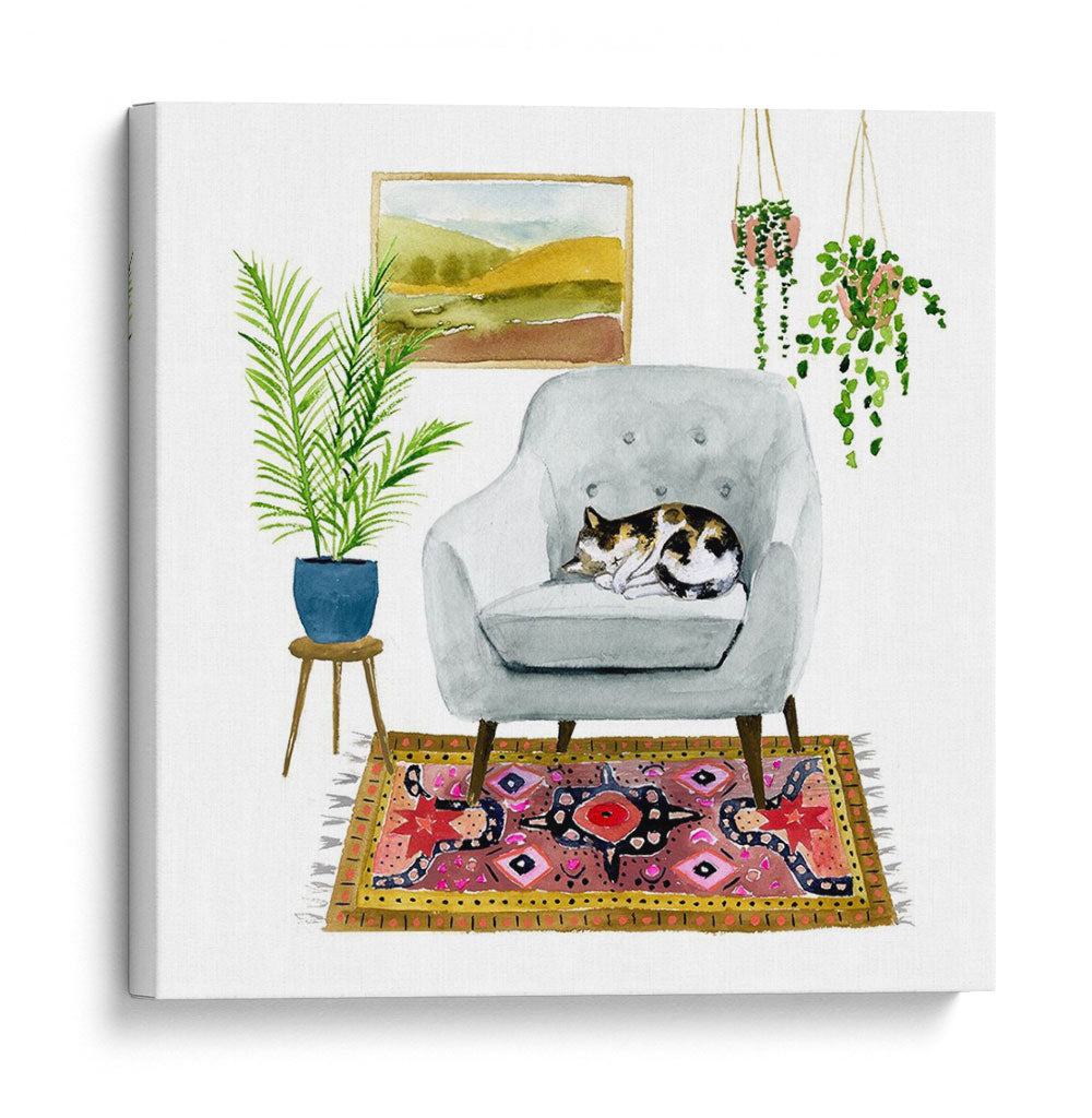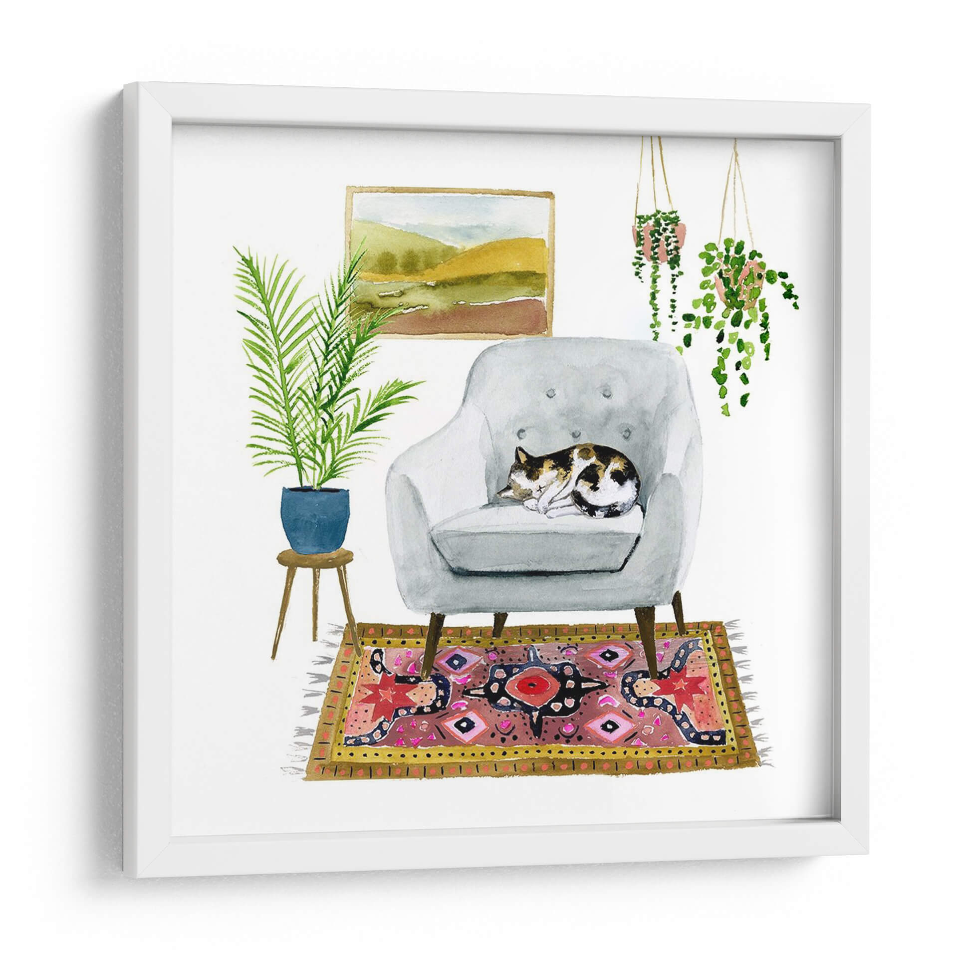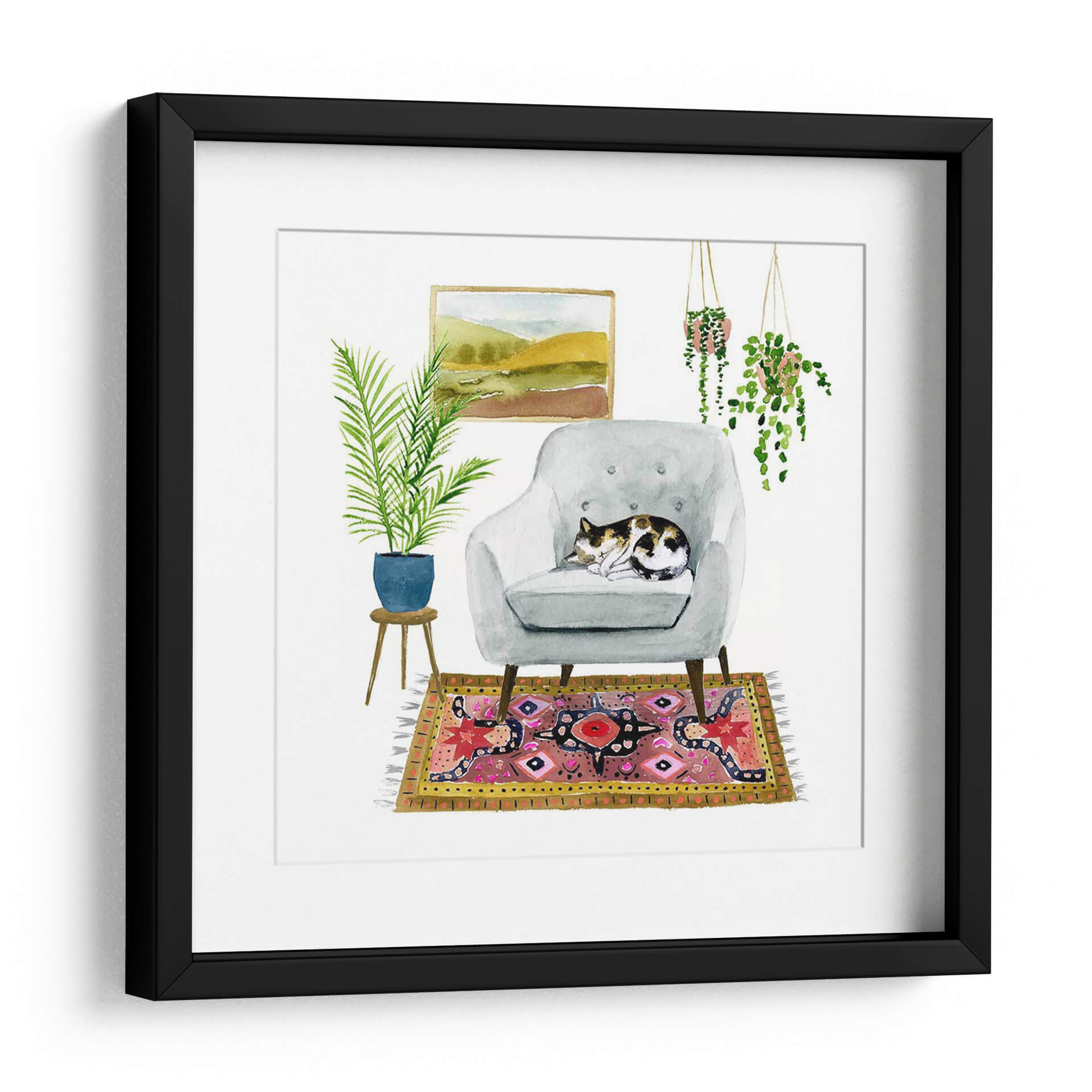 Captura la esencia de la tranquilidad y el confort hogareño con "Iniciobody Ii" de Victoria Borges, una obra de arte que evoca la serenidad de un momento de descanso. Esta pieza, realizada con una delicada técnica de acuarela, presenta un gato atigrado dormitando plácidamente en un sillón gris suave, rodeado de elementos que invitan a la calma. Un cuadro de paisaje sutil con tonos tierra y verdes se asoma en la pared, mientras que dos plantas colgantes añaden un toque de vitalidad natural al ambiente. La alfombra geométrica, con sus vibrantes patrones en tonos rosados y ocres, ancla la composición y aporta un aire bohemio y acogedor. La paleta de colores, dominada por tonos suaves y terrosos, crea una atmósfera de paz y recogimiento, perfecta para espacios donde se busca la relajación. Este cuadro decorativo es ideal para añadir un punto de calidez y personalidad a tu sala de estar, dormitorio o estudio. La habilidad de Borges para capturar la intimidad de la escena y la dulzura del animal lo convierte en una adición encantadora a cualquier hogar, aportando una sensación de bienestar y un refugio visual. Transforma tu pared en un oasis de serenidad con esta hermosa representación de la vida cotidiana.