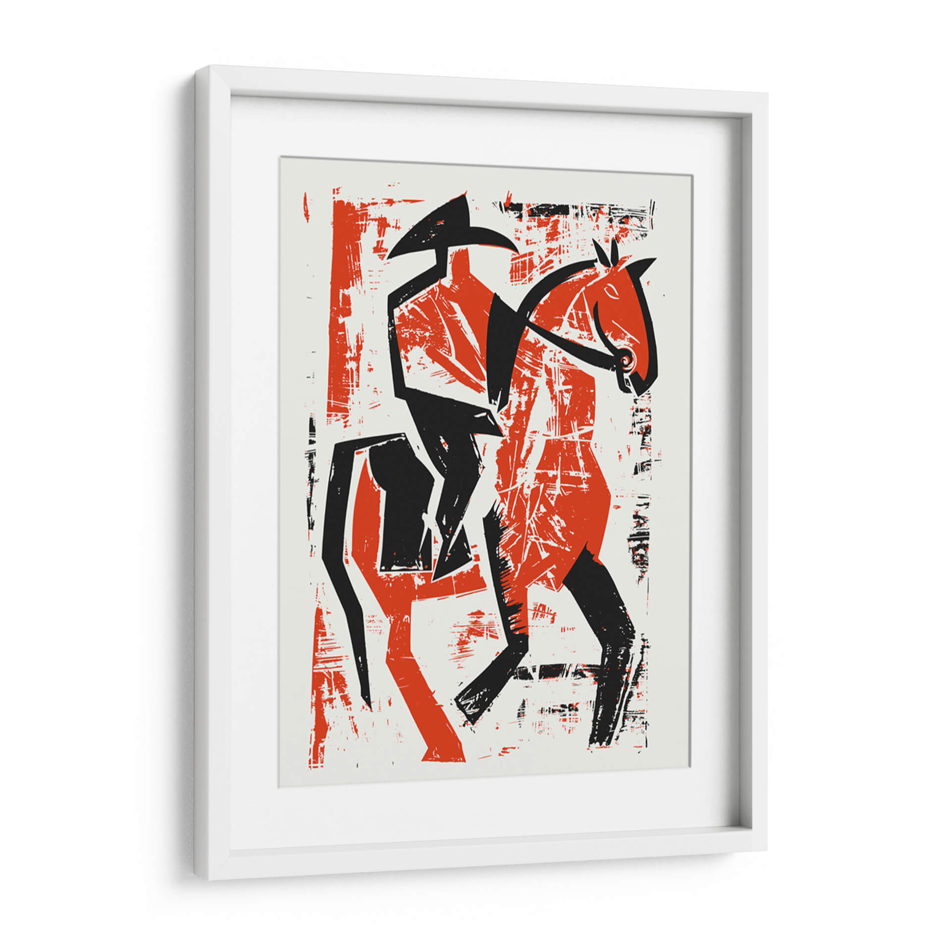 Embárcate en un viaje visual con nuestro cautivador cuadro decorativo 'Jinete de caballo abstracto' de Andreas Magnusson. Esta obra maestra moderna irradia una energía audaz y dinámica, capturando la esencia del movimiento y la libertad a través de formas estilizadas y una paleta de colores vibrante. Predominan el rojo intenso y el negro profundo, contrastando sobre un fondo neutro que permite que la figura central cobre vida. El estilo abstracto, con sus texturas evocadoras y trazos enérgicos, sugiere la fuerza y la elegancia de un jinete en pleno galope. La composición, aunque simplificada, transmite una sensación de velocidad y poder, convirtiéndose en un punto focal impactante para cualquier espacio. Ideal para salas de estar contemporáneas, estudios o oficinas que buscan un toque de distinción y carácter. Este cuadro abstracto no solo decora, sino que también inspira, añadiendo un elemento de sofisticación artística y una narrativa visual única a tu entorno. Transforma tu hogar u oficina en una galería personal con esta pieza excepcional que evoca pasión y aventura.