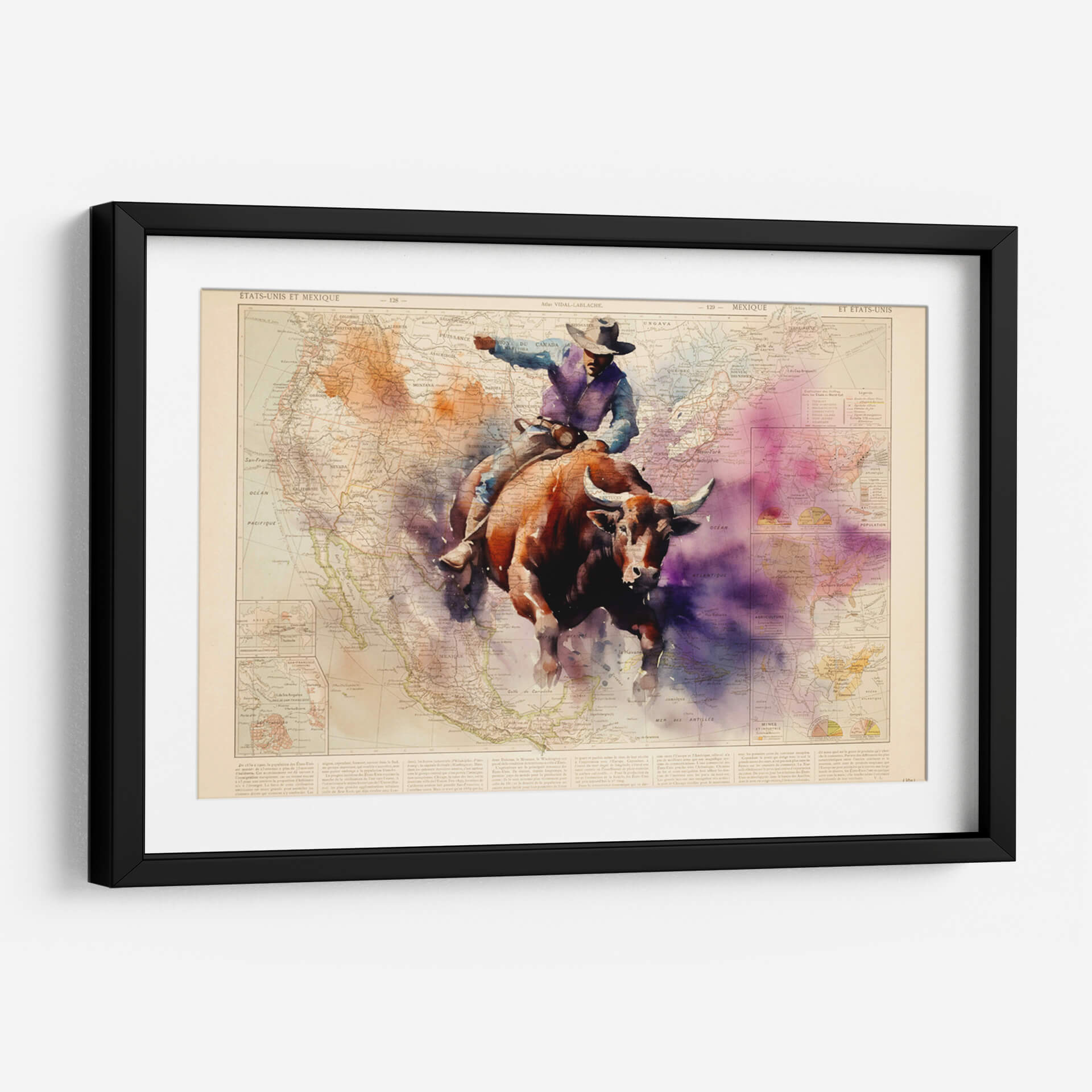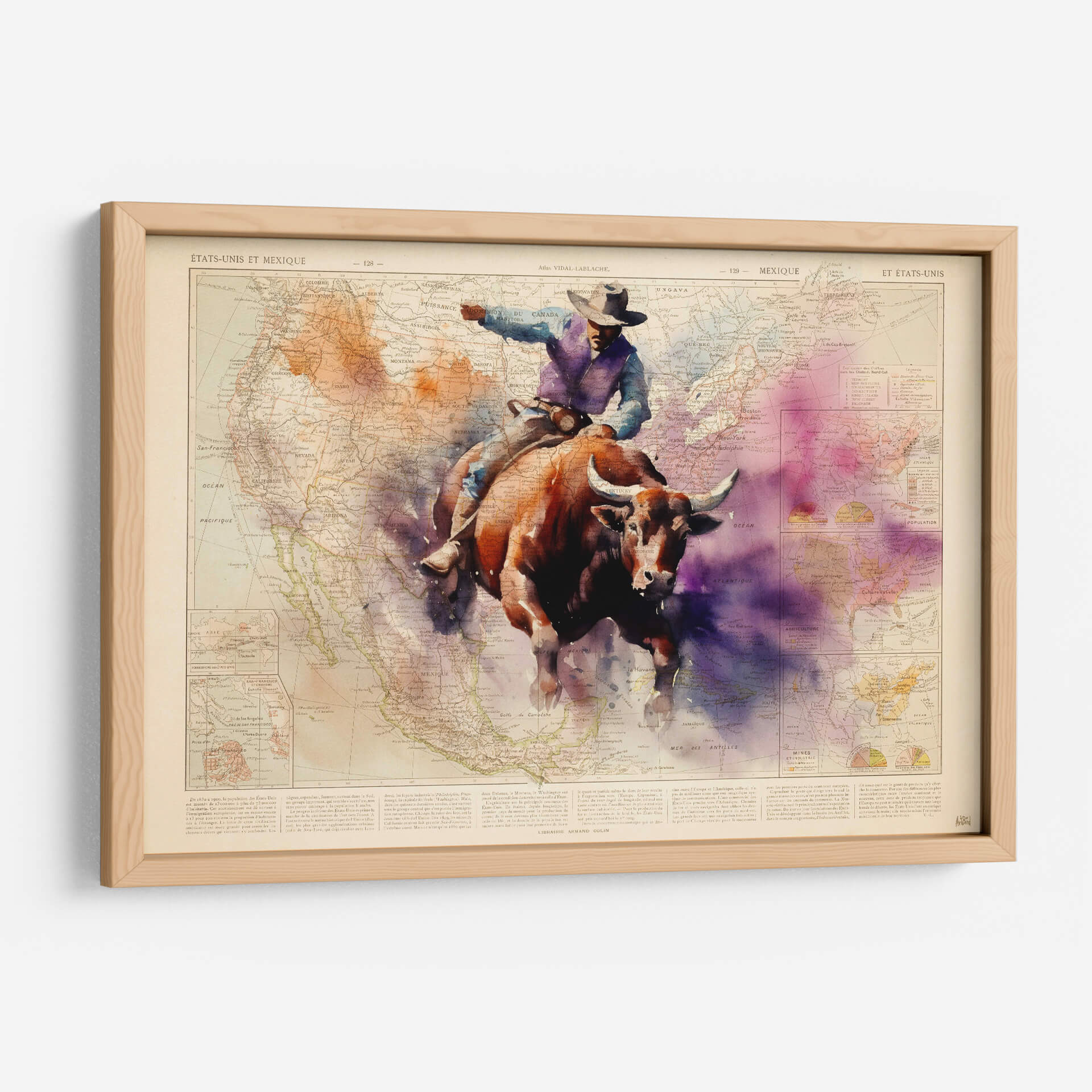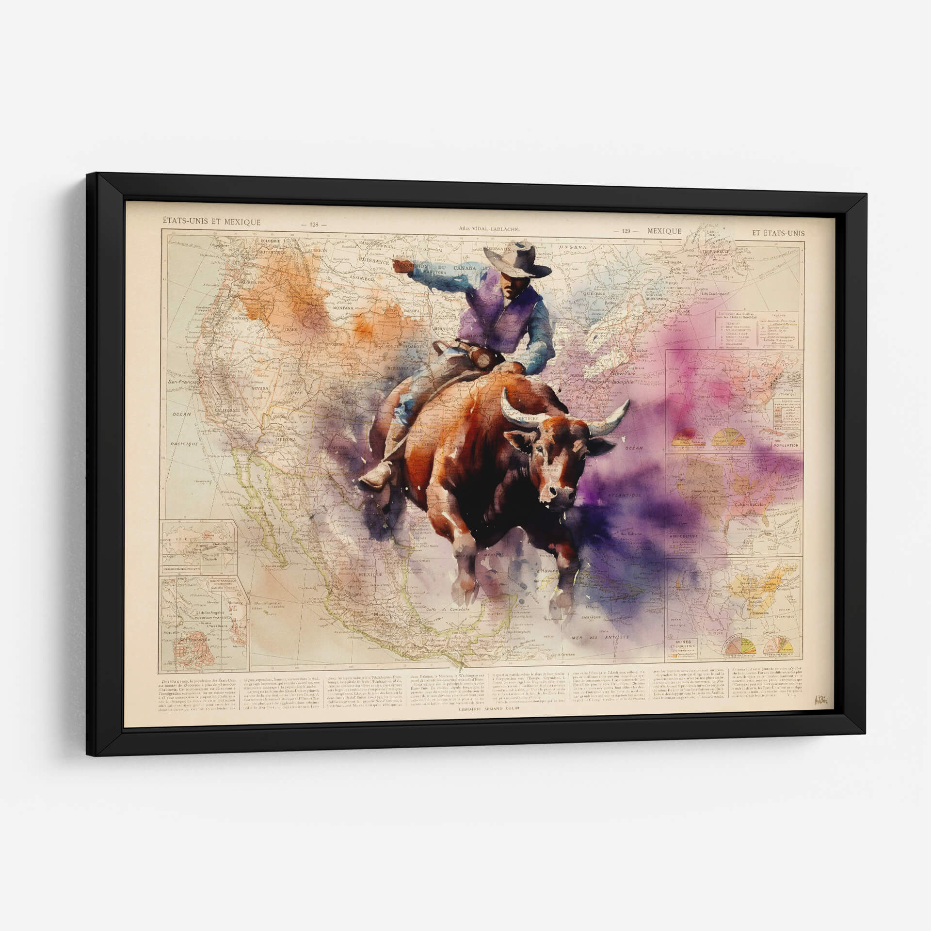 Sumérgete en la intensidad y la tradición con este cautivador cuadro decorativo, 'Jinete de toro', del artista Thomas Chedeville. Esta obra maestra evoca la fuerza y la valentía del rodeo, una práctica con profundas raíces culturales, especialmente en Norteamérica. La composición presenta a un jinete audaz sobre un toro en pleno movimiento, capturando un instante de pura energía y desafío. La paleta de colores, que fusiona tonos terrosos con vibrantes toques de púrpura y naranja, añade una dimensión dramática y emocional a la pieza, creando un contraste dinámico que atrae la mirada. El fondo, sutilmente superpuesto con un mapa antiguo, añade una capa de profundidad histórica y geográfica, sugiriendo la vasta extensión y la aventura inherentes a la cultura del oeste. Este cuadro decorativo es perfecto para añadir un punto focal lleno de carácter a tu sala de estar, estudio u oficina, inspirando conversaciones y transmitiendo un espíritu indomable. La habilidad de Chedeville para capturar la acción y la emoción es evidente, haciendo de esta obra una adición memorable a cualquier colección de arte contemporáneo, ideal para quienes buscan piezas con narrativa y un fuerte impacto visual.