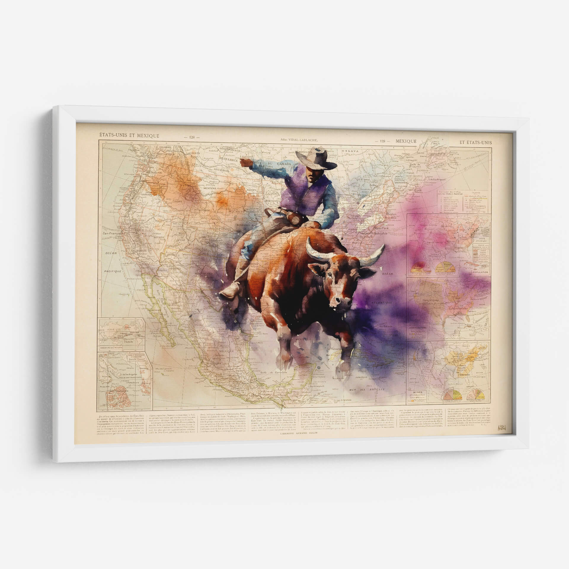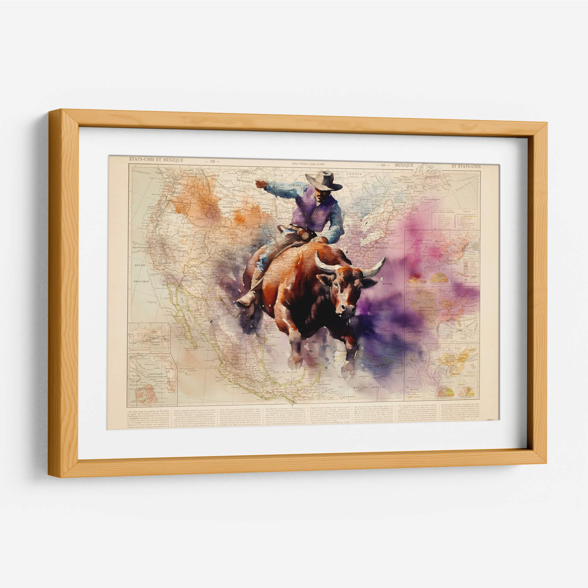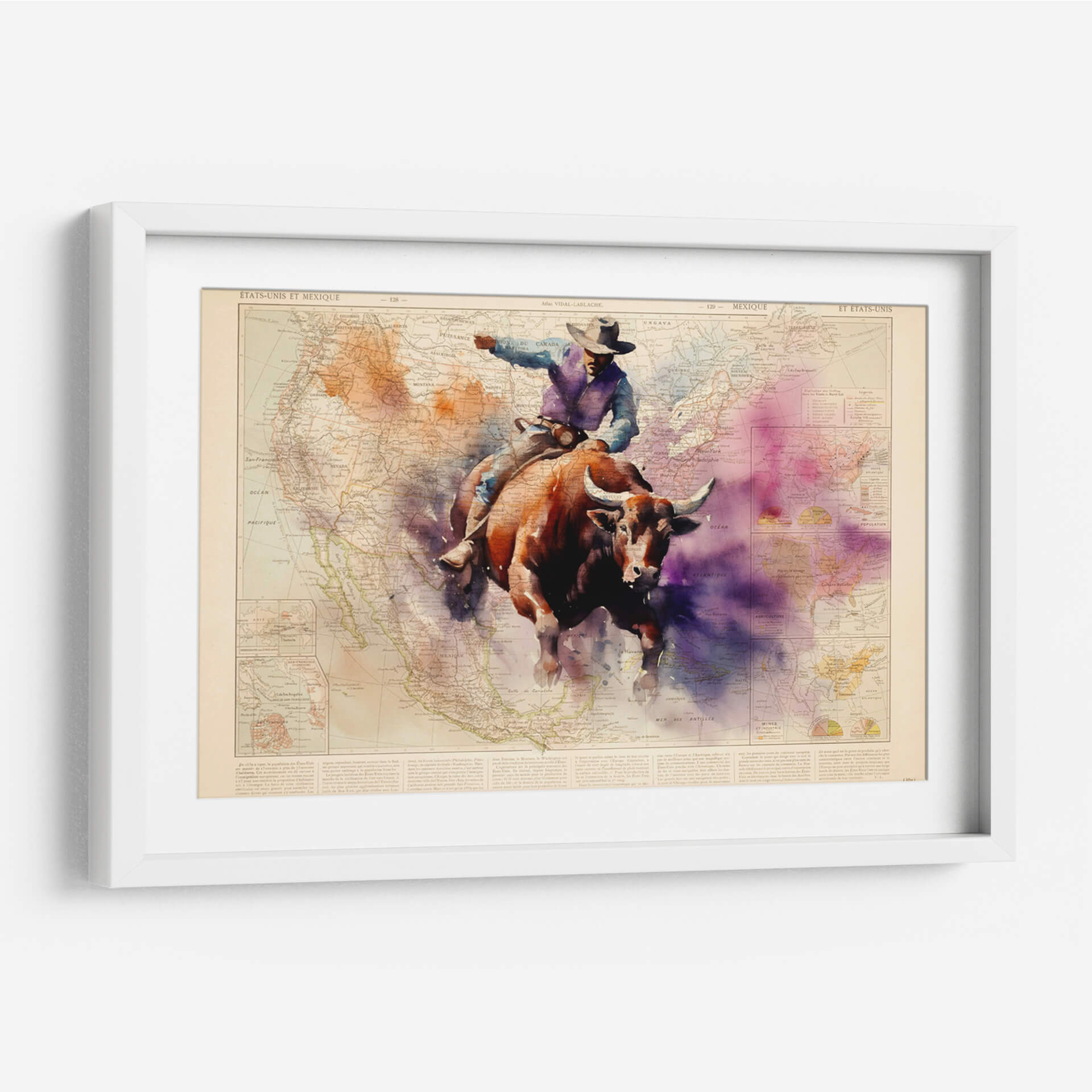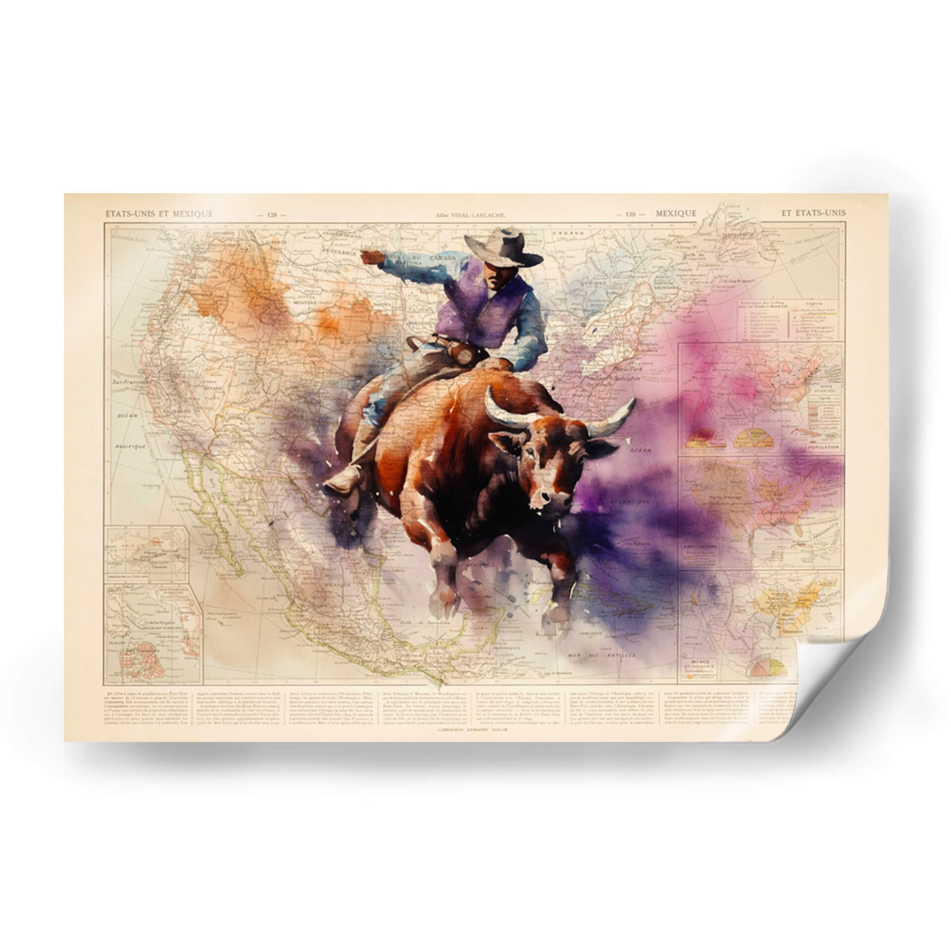 Sumérgete en la intensidad y la tradición con este cautivador cuadro decorativo, 'Jinete de toro', del artista Thomas Chedeville. Esta obra maestra evoca la fuerza y la valentía del rodeo, una práctica con profundas raíces culturales, especialmente en Norteamérica. La composición presenta a un jinete audaz sobre un toro en pleno movimiento, capturando un instante de pura energía y desafío. La paleta de colores, que fusiona tonos terrosos con vibrantes toques de púrpura y naranja, añade una dimensión dramática y emocional a la pieza, creando un contraste dinámico que atrae la mirada. El fondo, sutilmente superpuesto con un mapa antiguo, añade una capa de profundidad histórica y geográfica, sugiriendo la vasta extensión y la aventura inherentes a la cultura del oeste. Este cuadro decorativo es perfecto para añadir un punto focal lleno de carácter a tu sala de estar, estudio u oficina, inspirando conversaciones y transmitiendo un espíritu indomable. La habilidad de Chedeville para capturar la acción y la emoción es evidente, haciendo de esta obra una adición memorable a cualquier colección de arte contemporáneo, ideal para quienes buscan piezas con narrativa y un fuerte impacto visual.