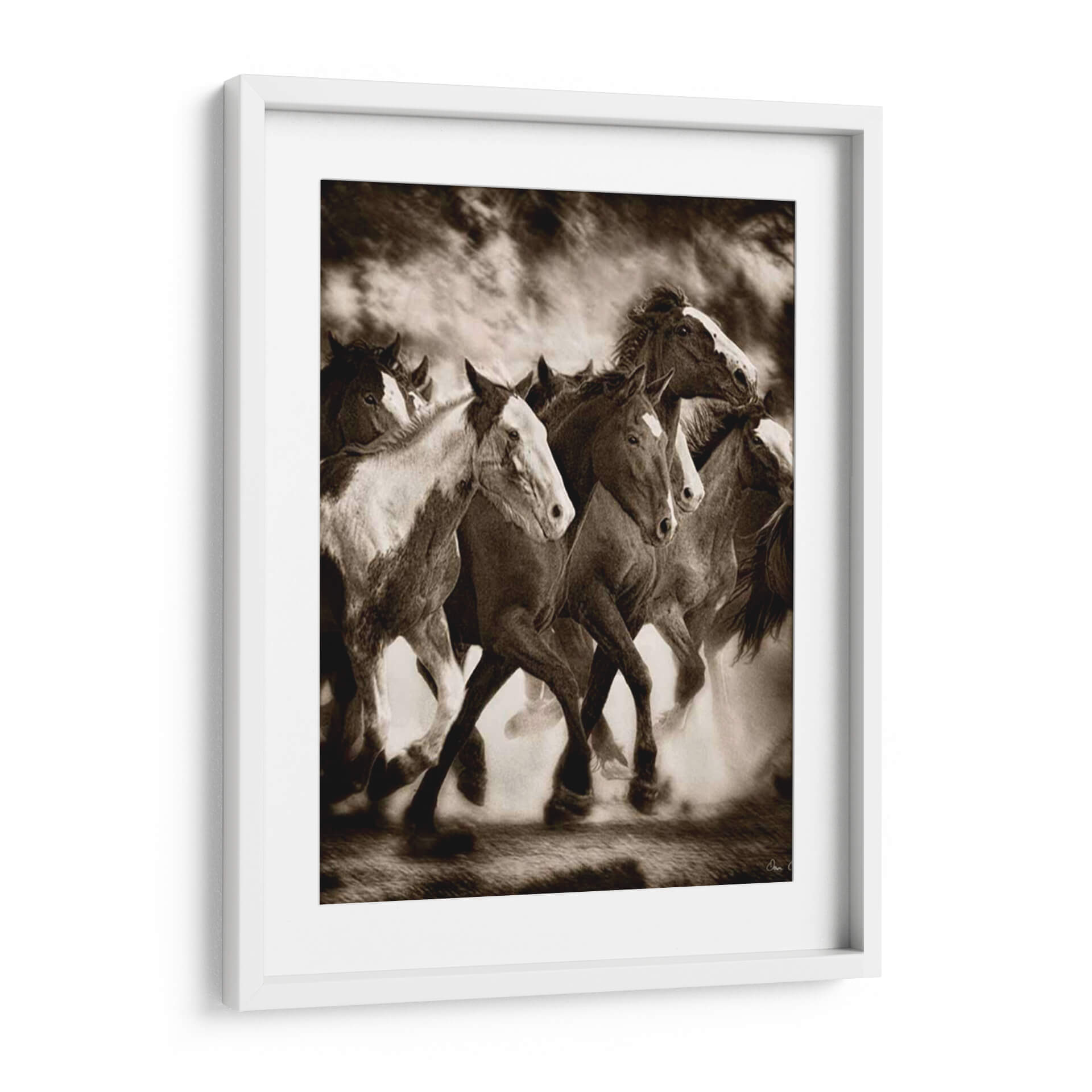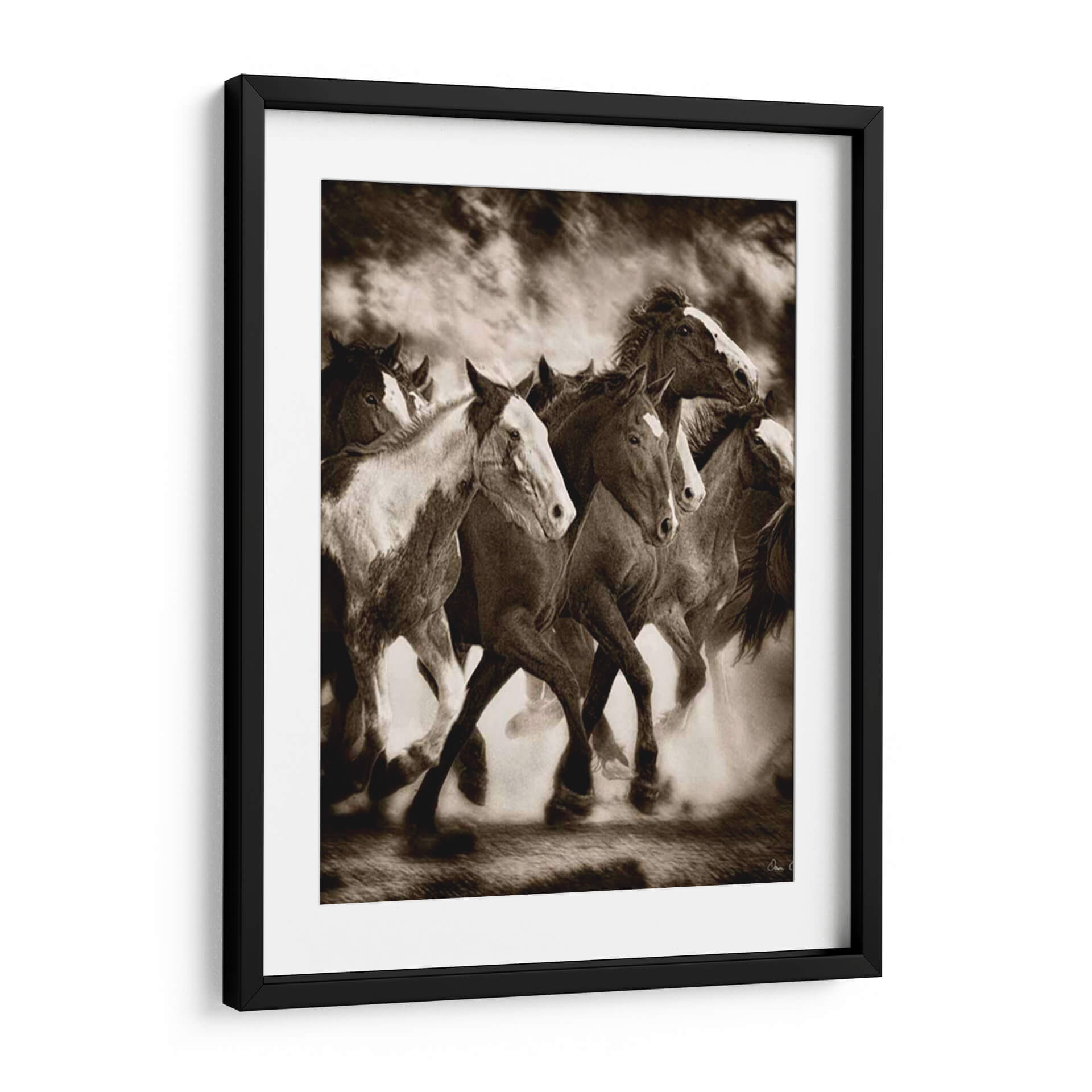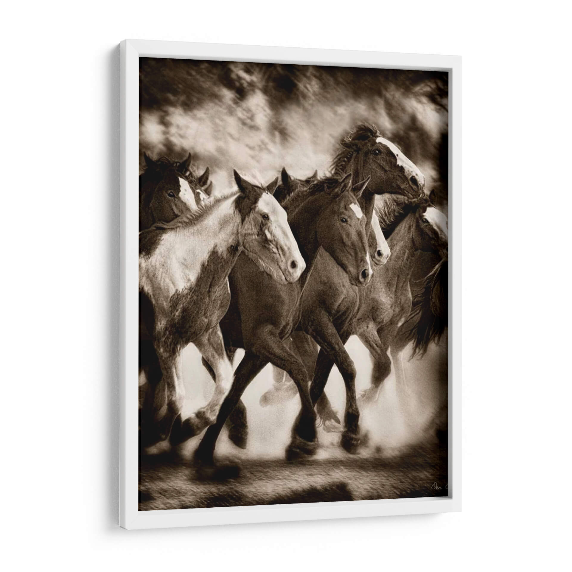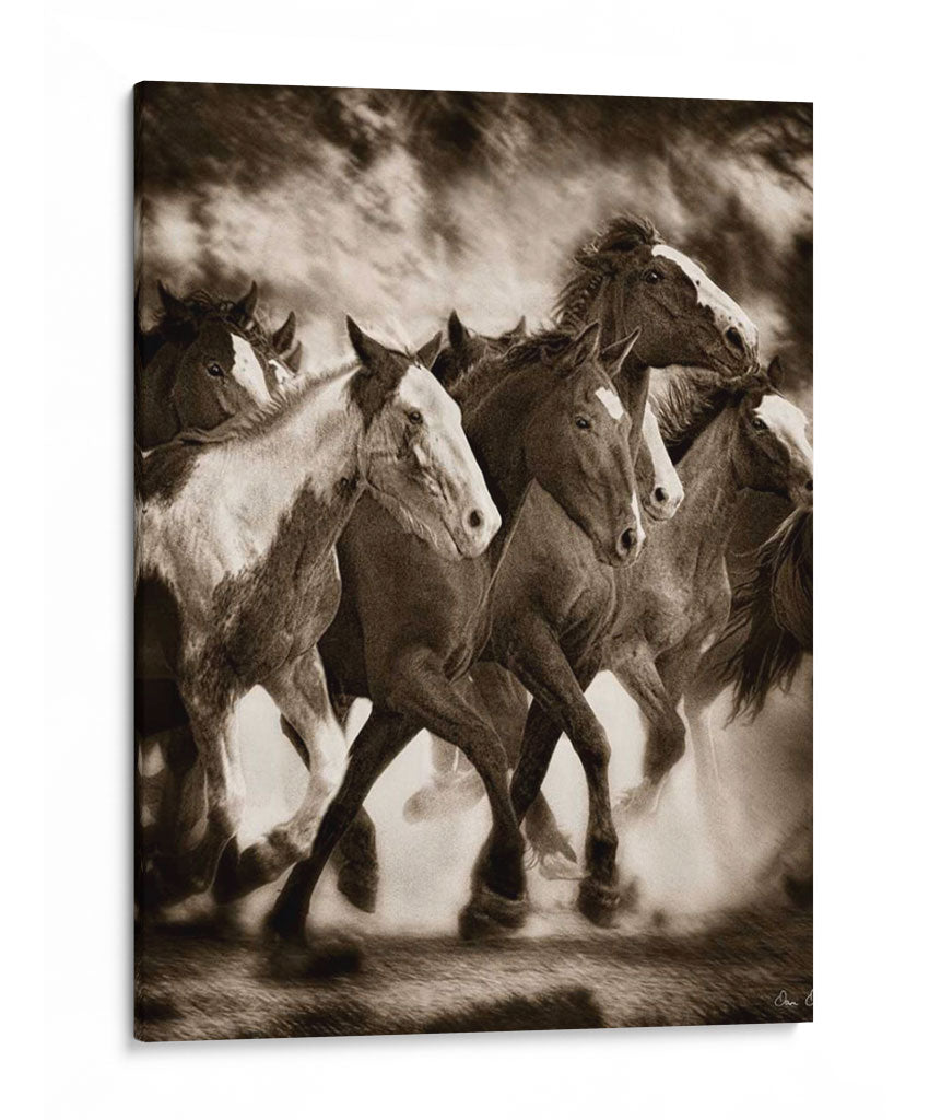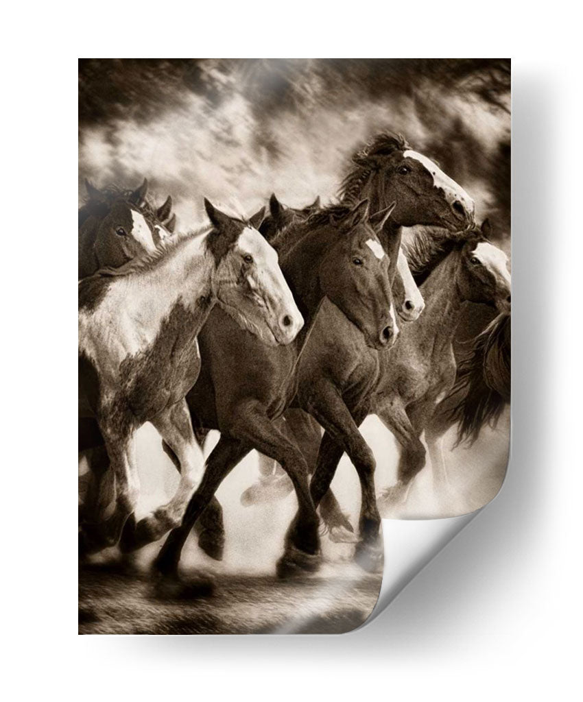 Captura la fuerza indomable y la belleza salvaje con "La Marcha", una obra maestra de David Drost que inmortaliza a una manada de caballos en pleno galope. Esta pieza evoca una sensación de libertad y poder, con los caballos levantando polvo mientras avanzan con determinación. La paleta de colores sepia, rica en tonos tierra y contrastes dramáticos, añade una profundidad atemporal y una atmósfera evocadora, perfecta para crear un punto focal en cualquier estancia. El estilo realista y la composición dinámica invitan a contemplar la majestuosidad de estos animales y la energía pura que emanan. Ideal para amantes de la naturaleza, la equitación o aquellos que buscan infundir un espíritu de aventura y audacia en su hogar u oficina. Este cuadro decorativo es una declaración de intenciones, un recordatorio de la conexión con la naturaleza y la fuerza interior. "La Marcha" transformará cualquier espacio en un santuario de inspiración y elegancia rústica, añadiendo carácter y una narrativa visual cautivadora que resonará con todos los que la contemplen.