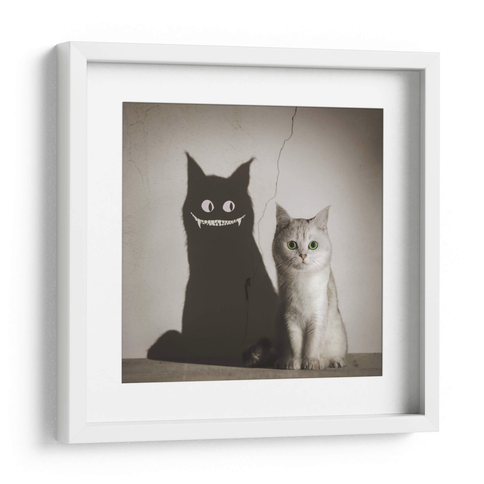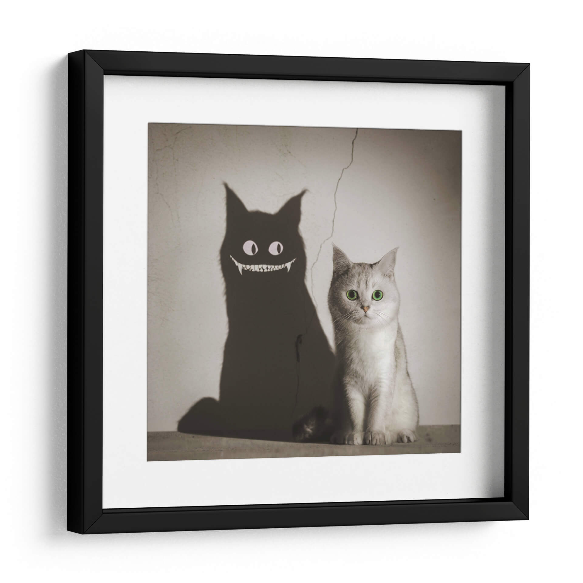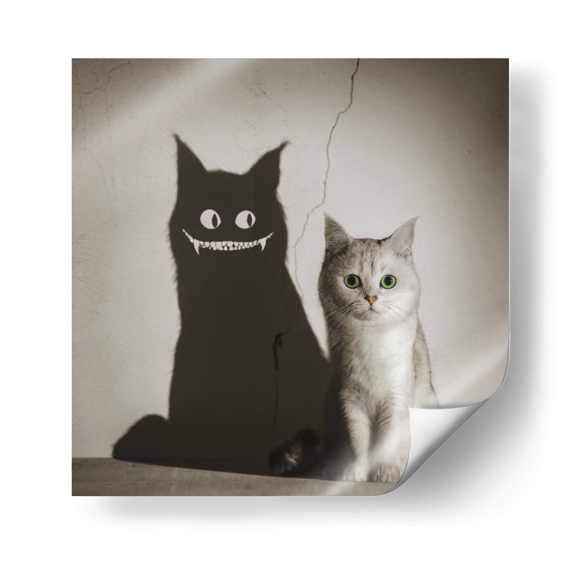 Adéntrate en el enigmático mundo de "La Sombra te Sonríe", una obra de arte digital que juega con la dualidad y la percepción. Este cautivador cuadro decorativo presenta a un tierno gato de pelaje plateado, cuyos ojos verdes brillantes contrastan con la inquietante sombra que proyecta. La sombra, transformada en una figura demoníaca con una sonrisa pícara y colmillos afilados, crea una narrativa visual fascinante que invita a la reflexión sobre las apariencias y las verdades ocultas. La paleta de colores, predominantemente en tonos sepia y grises, aporta una atmósfera vintage y misteriosa, acentuada por una grieta en la pared que añade un toque de realismo y decadencia. La composición, con el gato en primer plano y su sombra amenazante proyectándose detrás, genera un impacto visual inmediato y memorable. Esta pieza es ideal para quienes buscan añadir un toque de intriga y personalidad a sus espacios, ya sea en una sala de estar moderna, un estudio creativo o incluso una oficina. "La Sombra te Sonríe" no es solo un cuadro, es una conversación visual que desafía las expectativas y estimula la imaginación, perfecta para coleccionistas de arte contemporáneo que aprecian piezas con carácter y profundidad.