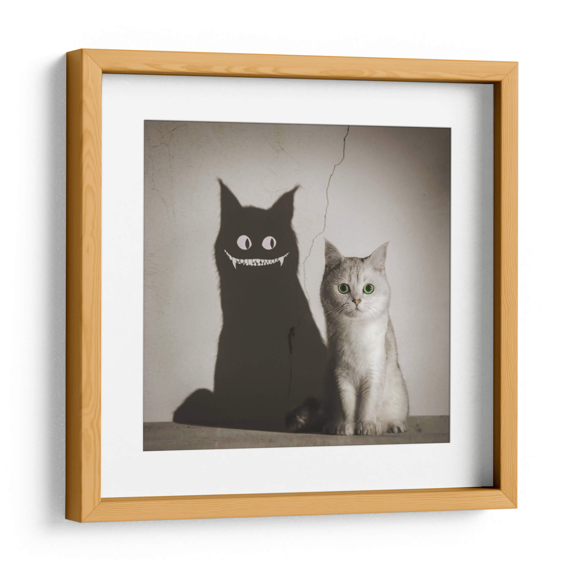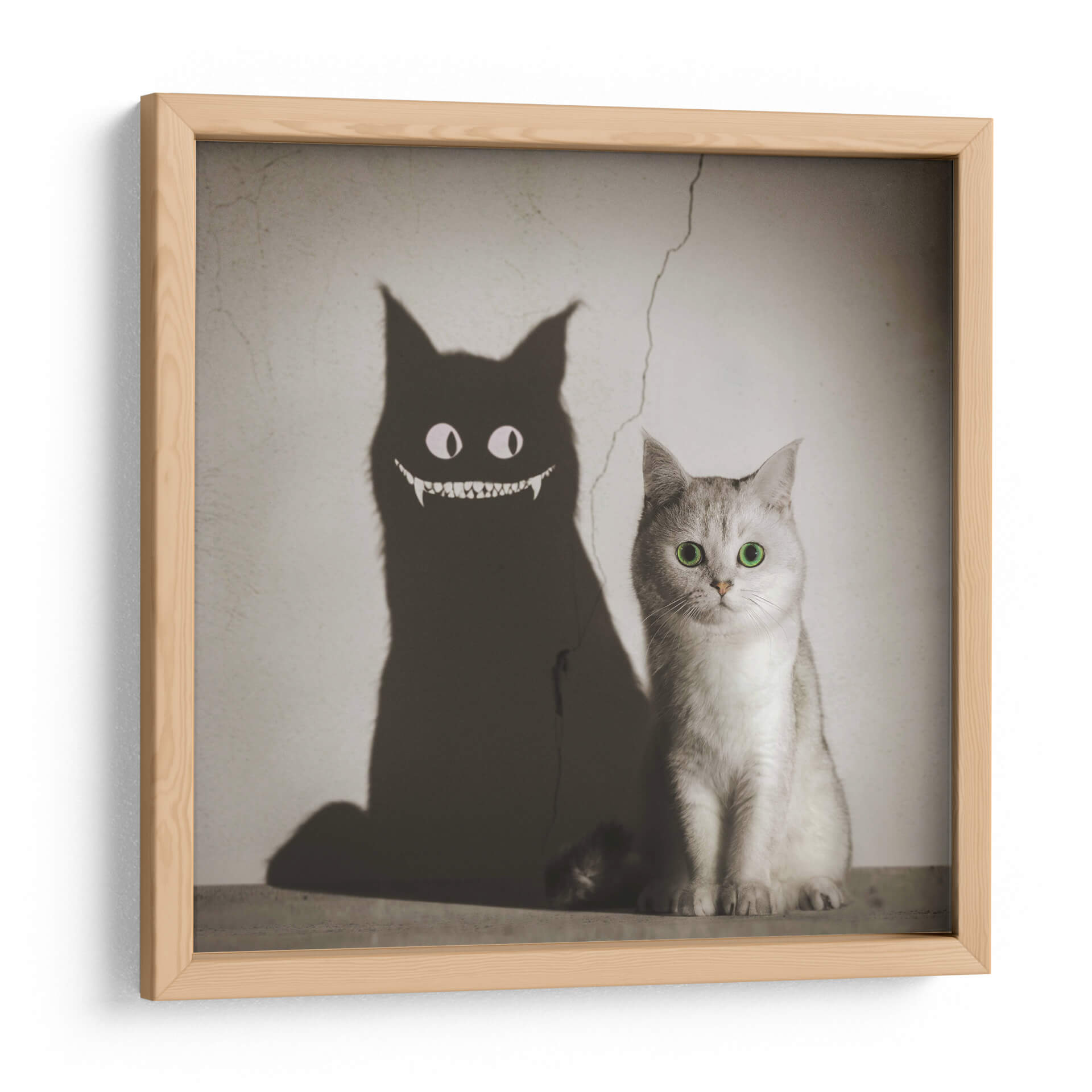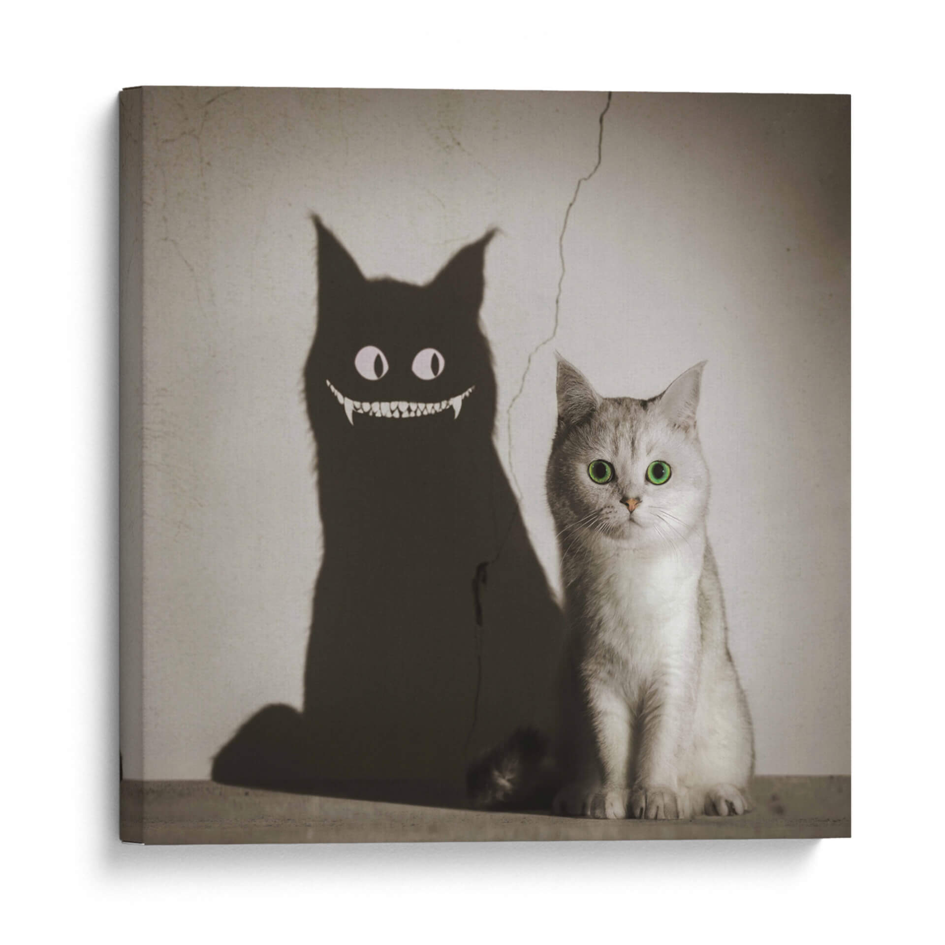 Adéntrate en el enigmático mundo de "La Sombra te Sonríe", una obra de arte digital que juega con la dualidad y la percepción. Este cautivador cuadro decorativo presenta a un tierno gato de pelaje plateado, cuyos ojos verdes brillantes contrastan con la inquietante sombra que proyecta. La sombra, transformada en una figura demoníaca con una sonrisa pícara y colmillos afilados, crea una narrativa visual fascinante que invita a la reflexión sobre las apariencias y las verdades ocultas. La paleta de colores, predominantemente en tonos sepia y grises, aporta una atmósfera vintage y misteriosa, acentuada por una grieta en la pared que añade un toque de realismo y decadencia. La composición, con el gato en primer plano y su sombra amenazante proyectándose detrás, genera un impacto visual inmediato y memorable. Esta pieza es ideal para quienes buscan añadir un toque de intriga y personalidad a sus espacios, ya sea en una sala de estar moderna, un estudio creativo o incluso una oficina. "La Sombra te Sonríe" no es solo un cuadro, es una conversación visual que desafía las expectativas y estimula la imaginación, perfecta para coleccionistas de arte contemporáneo que aprecian piezas con carácter y profundidad.