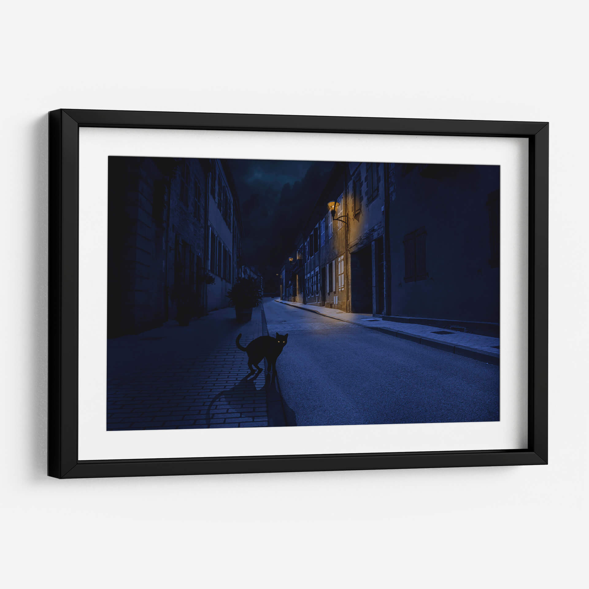 Adéntrate en la misteriosa y cautivadora atmósfera de "Le Chat Noir" de Omar Brunt. Este cuadro decorativo transporta al espectador a una calle europea al anochecer, donde las luces cálidas de las farolas y las ventanas contrastan dramáticamente con la profunda oscuridad de la noche. La silueta enigmática de un gato negro, con sus ojos penetrantes brillando en la penumbra, se convierte en el foco principal, infundiendo a la escena una sensación de misterio y sigilo. La composición, que sigue la línea de la calle empedrada y los edificios con persianas, crea una perspectiva envolvente que invita a explorar el escenario. La paleta de colores, dominada por azules profundos, negros y toques de amarillo ámbar proveniente de la iluminación, genera una atmósfera nocturna y ligeramente melancólica, pero a la vez acogedora. Ideal para aquellos que buscan añadir un toque de intriga y elegancia a su hogar u oficina, este cuadro es perfecto para salas de estar, recibidores o estudios que deseen un punto focal que despierte la imaginación y genere conversación. "Le Chat Noir" es más que una simple imagen; es una invitación a un mundo de secretos urbanos y la seductora compañía de un felino en la noche.
