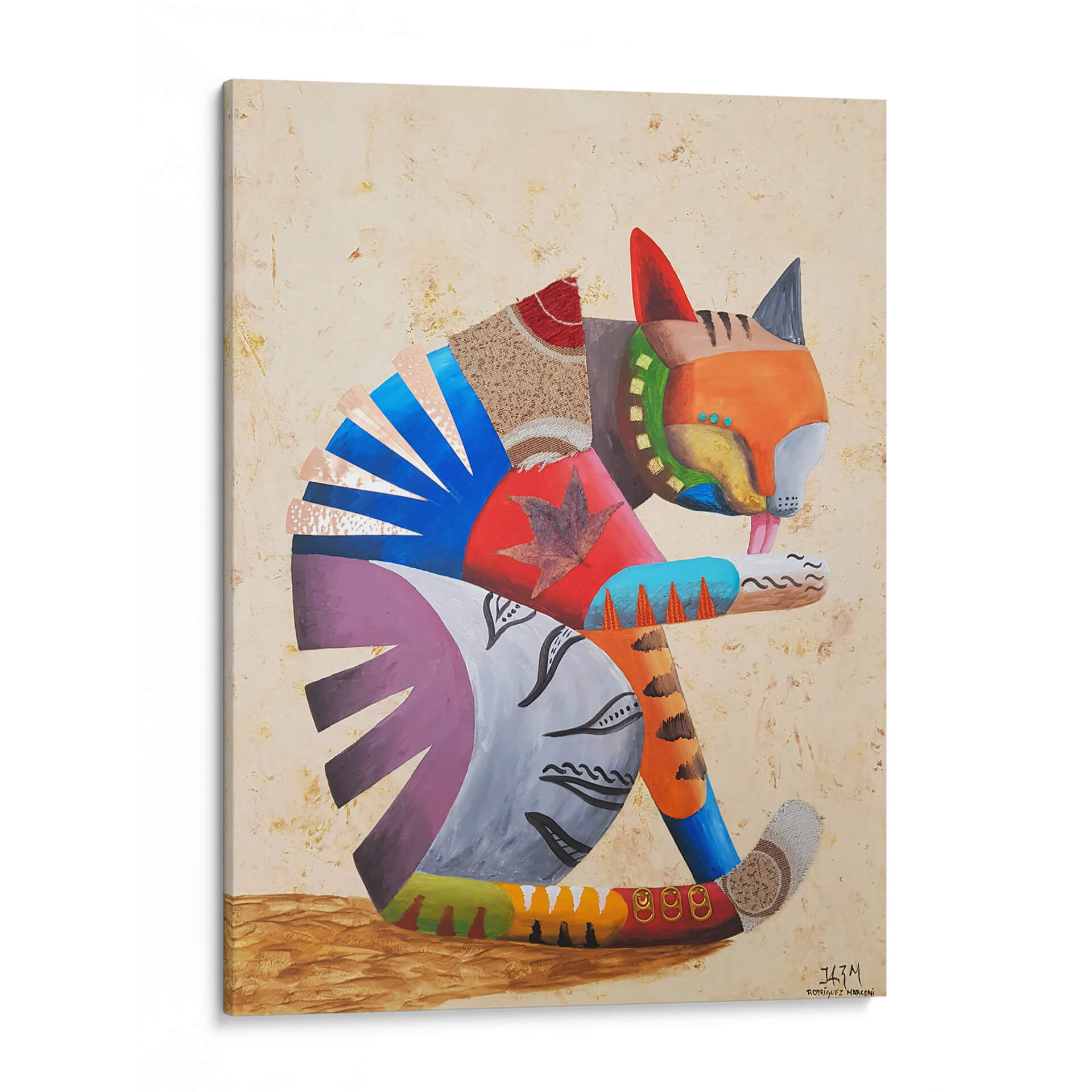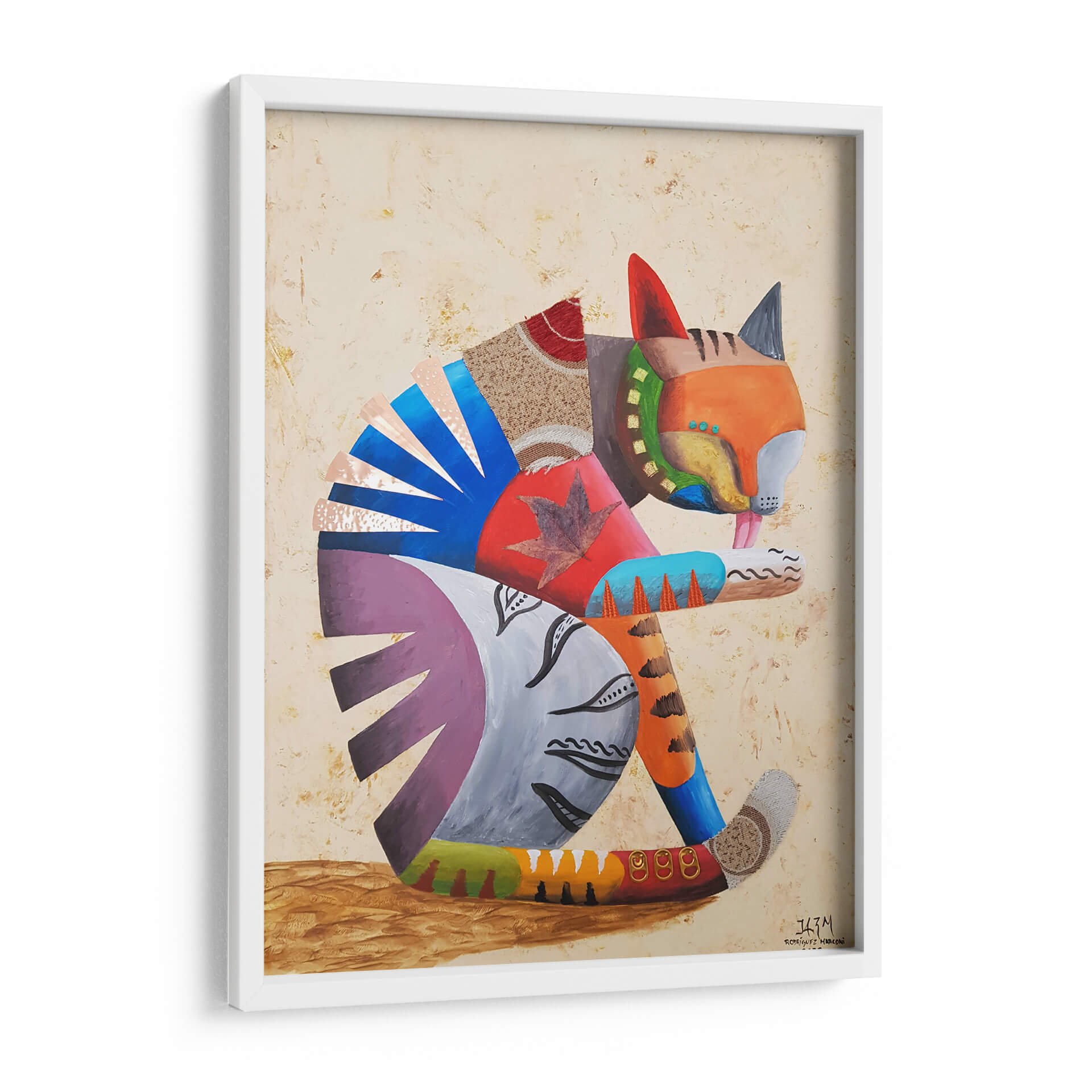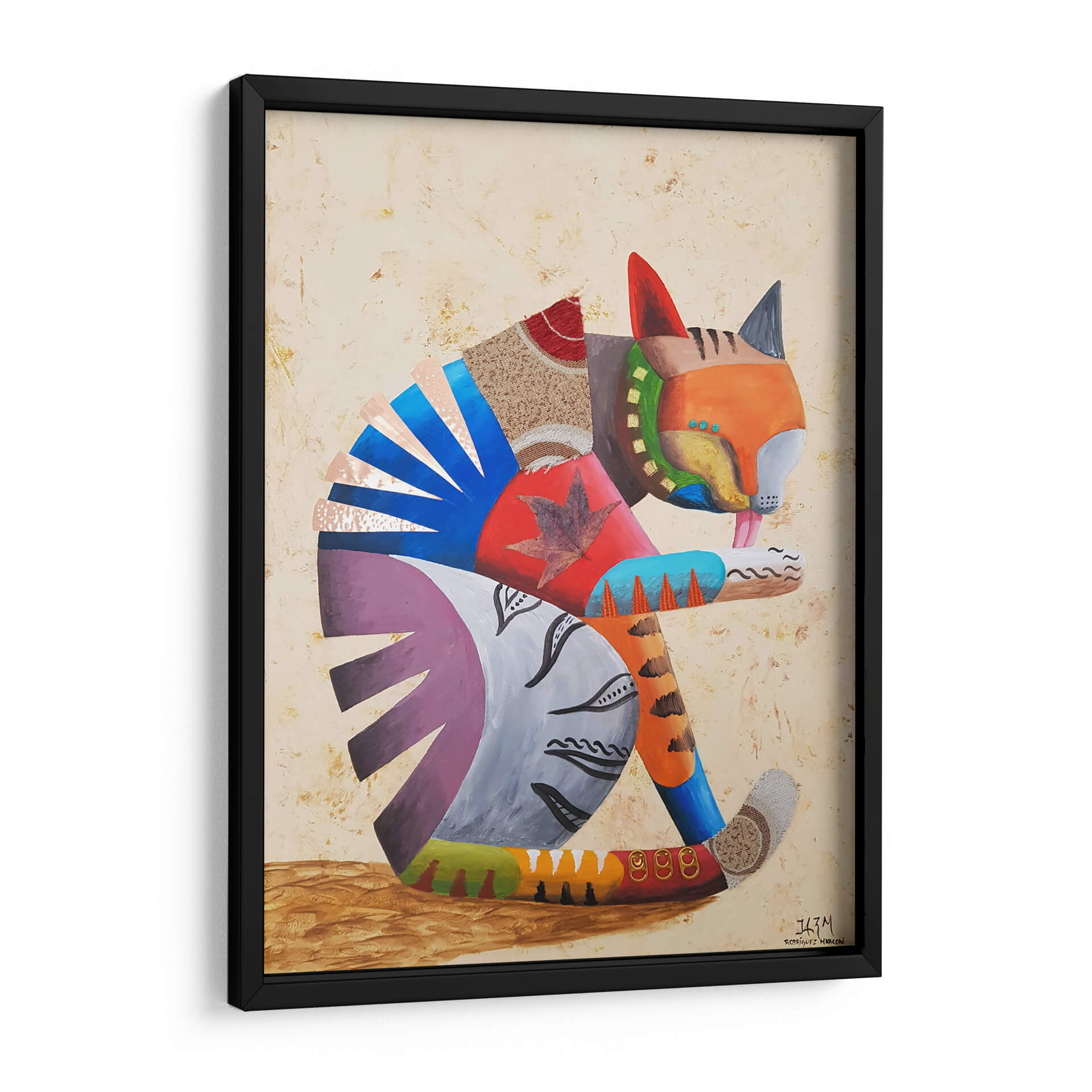 Sumérgete en la cautivadora obra de arte "Me lavo las manos" del artista Rodríguez Marconi, una pieza vibrante que celebra la alegría y la individualidad. Este cuadro decorativo presenta un felino estilizado, representado con una audaz paleta de colores y texturas mixtas, que evoca una sensación de juego y dinamismo. La composición, con su enfoque en la figura central y el uso de formas geométricas y orgánicas, crea un equilibrio visual fascinante. Los tonos cálidos y terrosos del fondo contrastan armoniosamente con los vivos azules, naranjas y púrpuras del gato, generando una atmósfera enérgica pero acogedora. Ideal para añadir un toque de personalidad y color a cualquier sala de estar, estudio u oficina, esta obra invita a la contemplación y al disfrute estético. Su estilo único, que fusiona elementos abstractos con una representación figurativa juguetona, la convierte en una pieza versátil que complementará decoraciones contemporáneas y eclécticas. "Me lavo las manos" no es solo un cuadro, es una declaración de estilo y una fuente de inspiración diaria, perfecta para quienes buscan arte que hable de vida y creatividad.