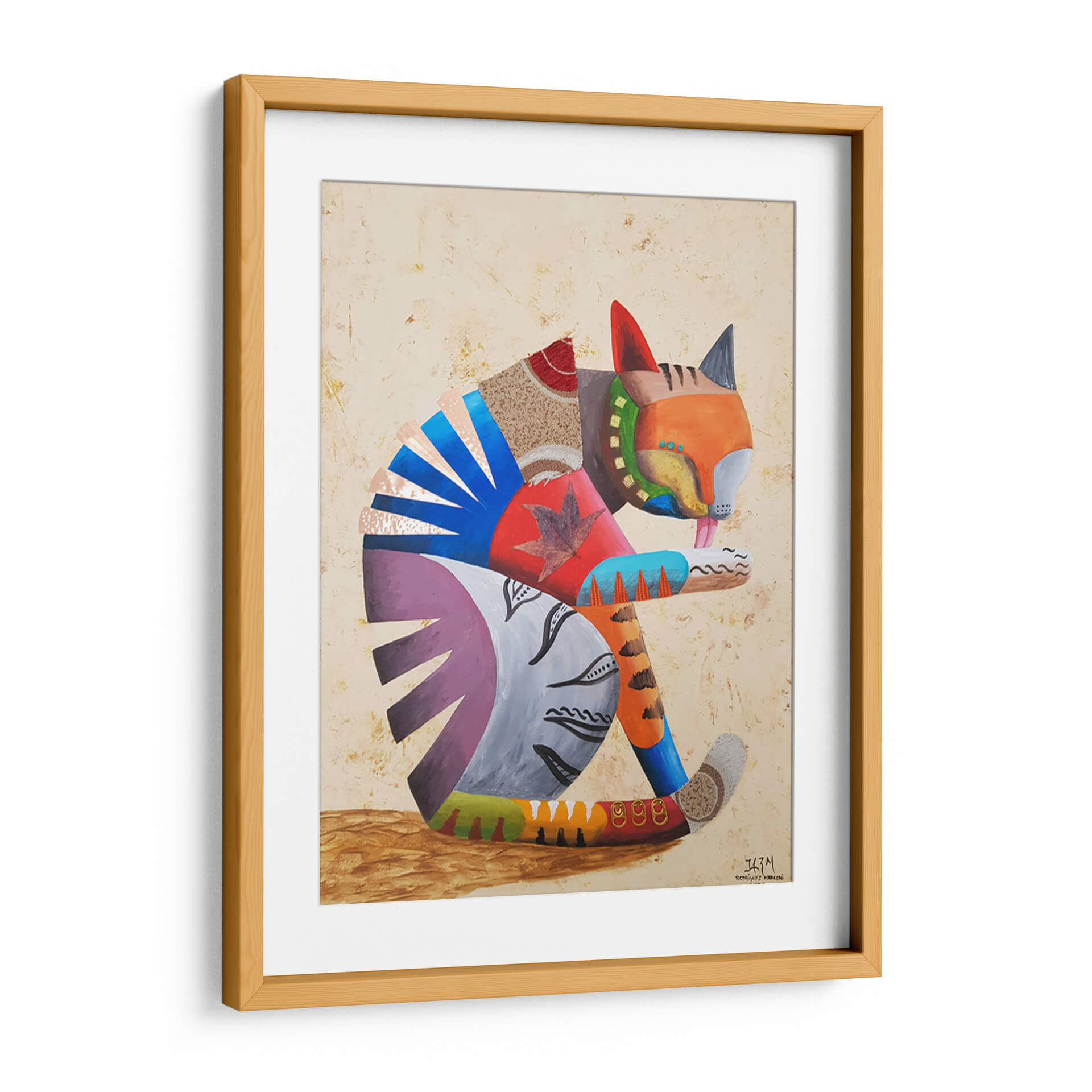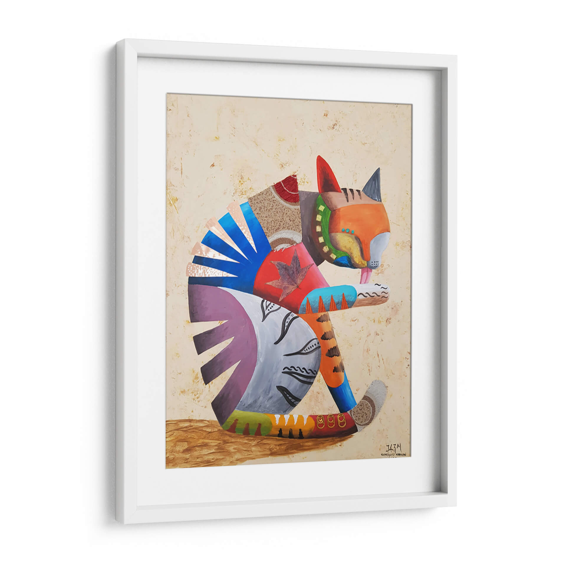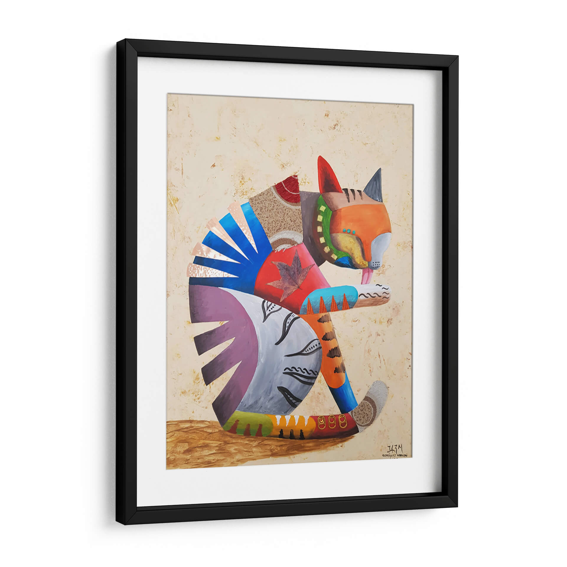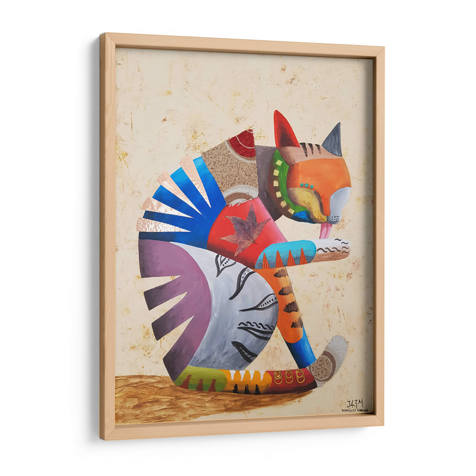 Sumérgete en la cautivadora obra de arte "Me lavo las manos" del artista Rodríguez Marconi, una pieza vibrante que celebra la alegría y la individualidad. Este cuadro decorativo presenta un felino estilizado, representado con una audaz paleta de colores y texturas mixtas, que evoca una sensación de juego y dinamismo. La composición, con su enfoque en la figura central y el uso de formas geométricas y orgánicas, crea un equilibrio visual fascinante. Los tonos cálidos y terrosos del fondo contrastan armoniosamente con los vivos azules, naranjas y púrpuras del gato, generando una atmósfera enérgica pero acogedora. Ideal para añadir un toque de personalidad y color a cualquier sala de estar, estudio u oficina, esta obra invita a la contemplación y al disfrute estético. Su estilo único, que fusiona elementos abstractos con una representación figurativa juguetona, la convierte en una pieza versátil que complementará decoraciones contemporáneas y eclécticas. "Me lavo las manos" no es solo un cuadro, es una declaración de estilo y una fuente de inspiración diaria, perfecta para quienes buscan arte que hable de vida y creatividad.