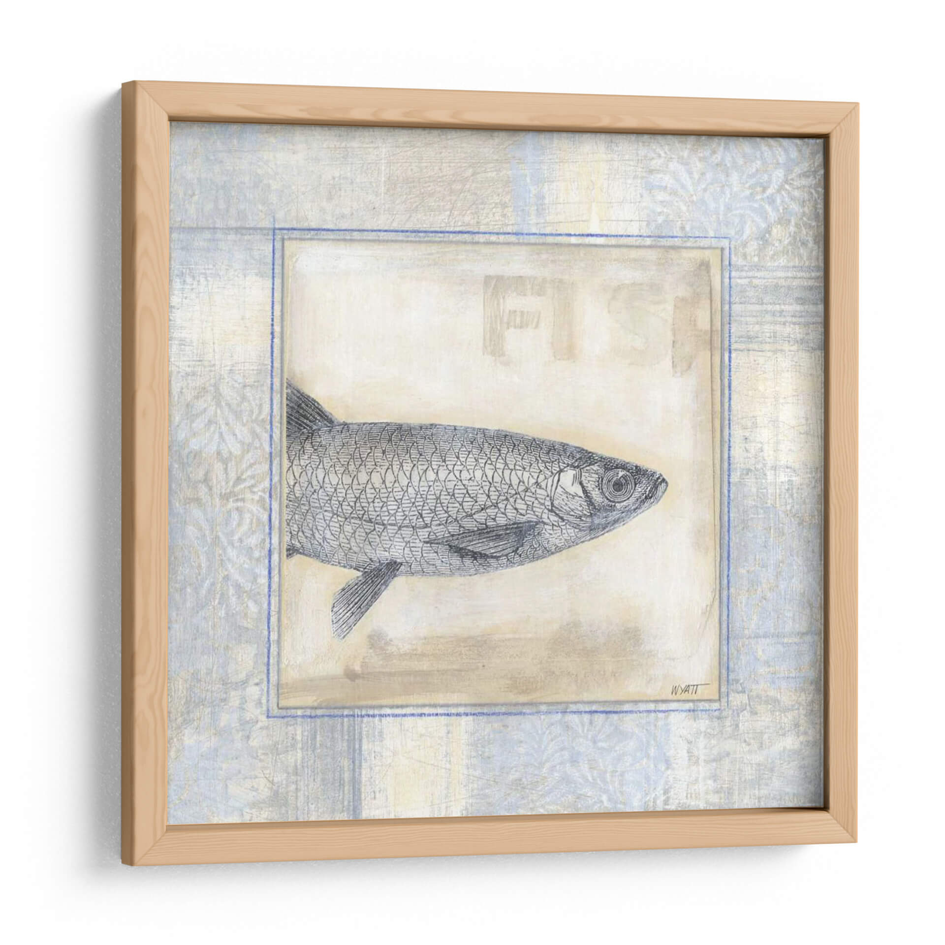 Adéntrate en el sereno mundo acuático con "Memorias De Driftwood I", una cautivadora obra de arte de Norman Wyatt Jr. Esta pieza presenta un detallado grabado de un pez plateado, capturado con una precisión exquisita que resalta su textura escamosa y su forma aerodinámica. La obra se enmarca en una estética vintage, con un fondo que evoca texturas de madera blanqueada por el sol y sutiles motivos botánicos en tonos pastel de azul y beige. La composición, centrada en el perfil del pez, transmite una sensación de calma y contemplación, ideal para espacios que buscan reflejar la tranquilidad del mar o la serenidad de la naturaleza. La delicada paleta de colores, dominada por grises plateados, beiges cálidos y toques suaves de azul, crea una atmósfera relajante y atemporal. Este cuadro decorativo es perfecto para añadir un toque de elegancia costera a tu sala de estar, dormitorio o incluso a un estudio. Su estilo evoca la belleza sutil de la vida marina y la conexión con el mar, invitando a la reflexión y al descanso. "Memorias De Driftwood I" es más que una simple imagen; es una invitación a sumergirse en un ambiente de paz y belleza natural.