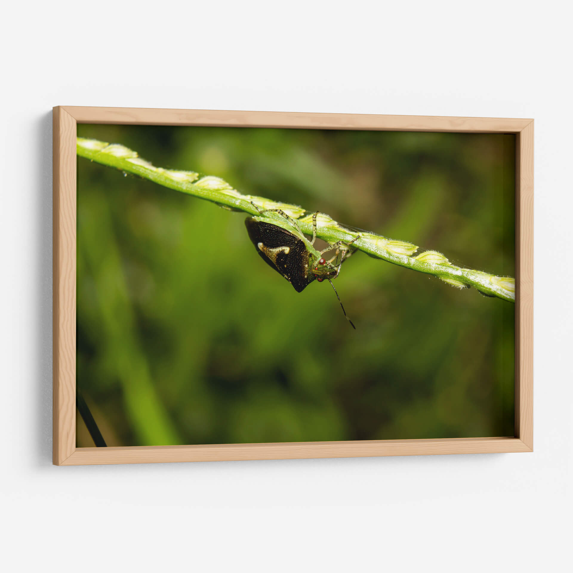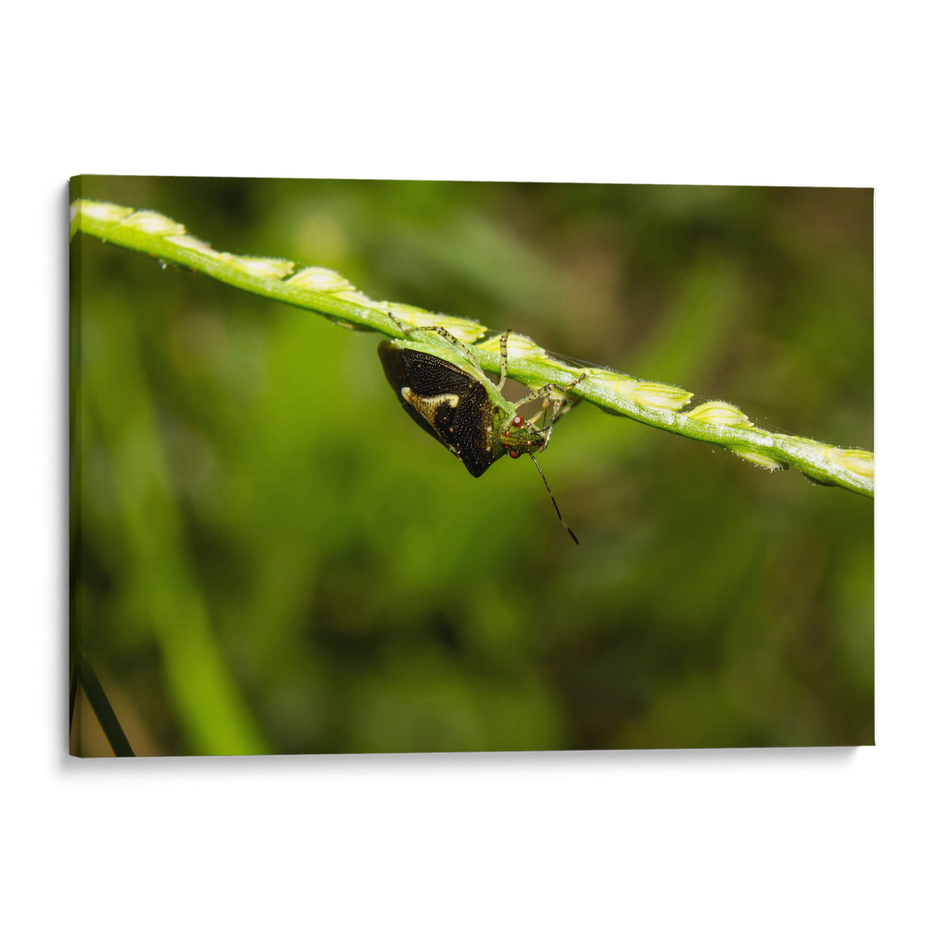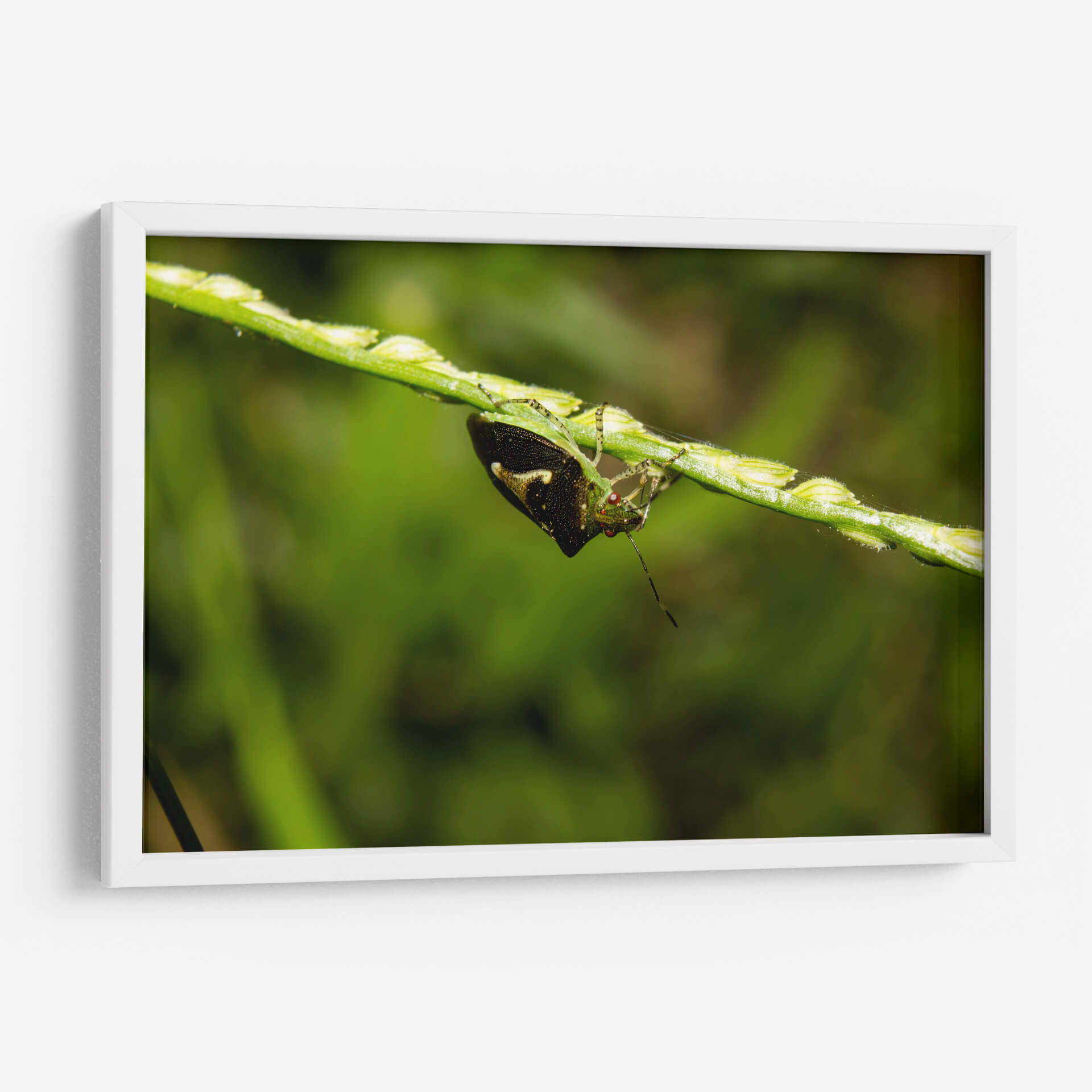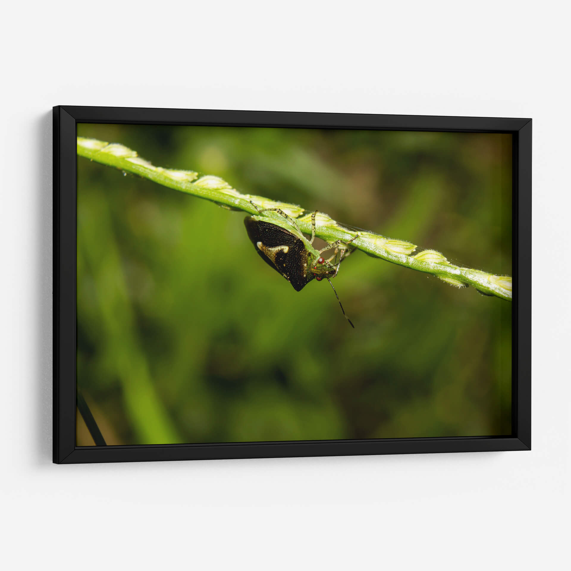Sumérgete en la intrincada belleza de la naturaleza con 'Minimundus09', una obra de arte visualmente cautivadora del artista Jiván. Este cuadro decorativo presenta un primer plano detallado de un insecto posado en un tallo de hierba, capturando la delicadeza y la vitalidad del mundo natural. La composición se centra en la textura y los vibrantes tonos verdes del entorno, con el insecto emergiendo como un punto focal de interés con sus intrincados patrones y su mirada inquisitiva. Los sutiles toques de color y el enfoque nítido sobre el sujeto contrastan maravillosamente con el fondo suavemente desenfocado, creando una sensación de profundidad y realismo. 'Minimundus09' es perfecto para añadir un toque de la serenidad y la maravilla del mundo natural a cualquier espacio, ya sea un estudio hogareño, una sala de estar o una oficina. Esta pieza evoca una sensación de calma y aprecio por los pequeños detalles de la vida, invitando a la contemplación y la admiración. Su estilo fotográfico y su temática natural lo convierten en una adición excepcional para quienes buscan arte que inspire tranquilidad y conecte con la esencia del exterior.