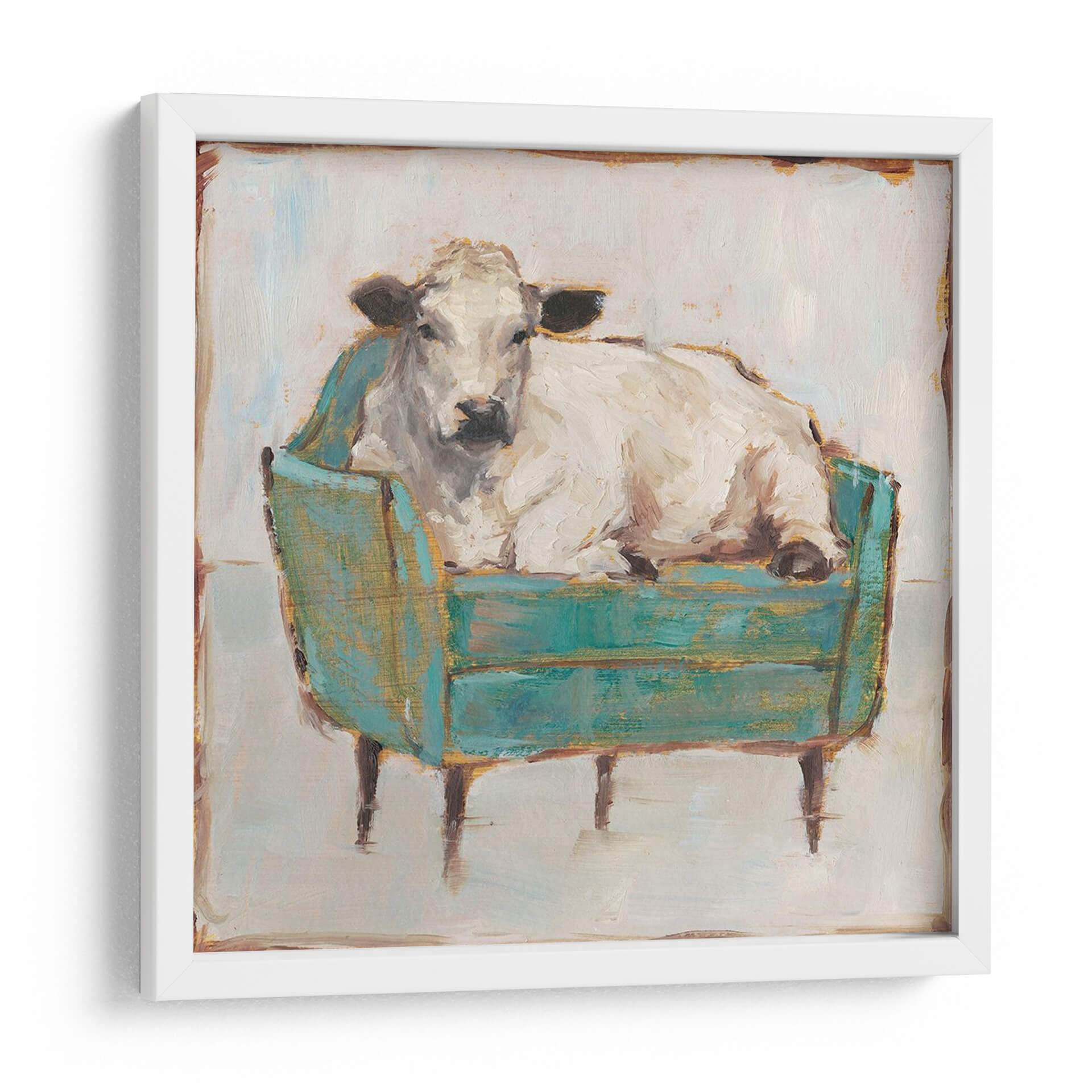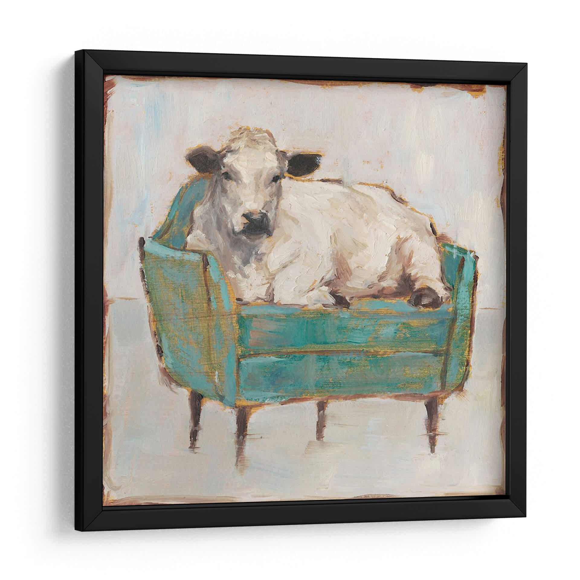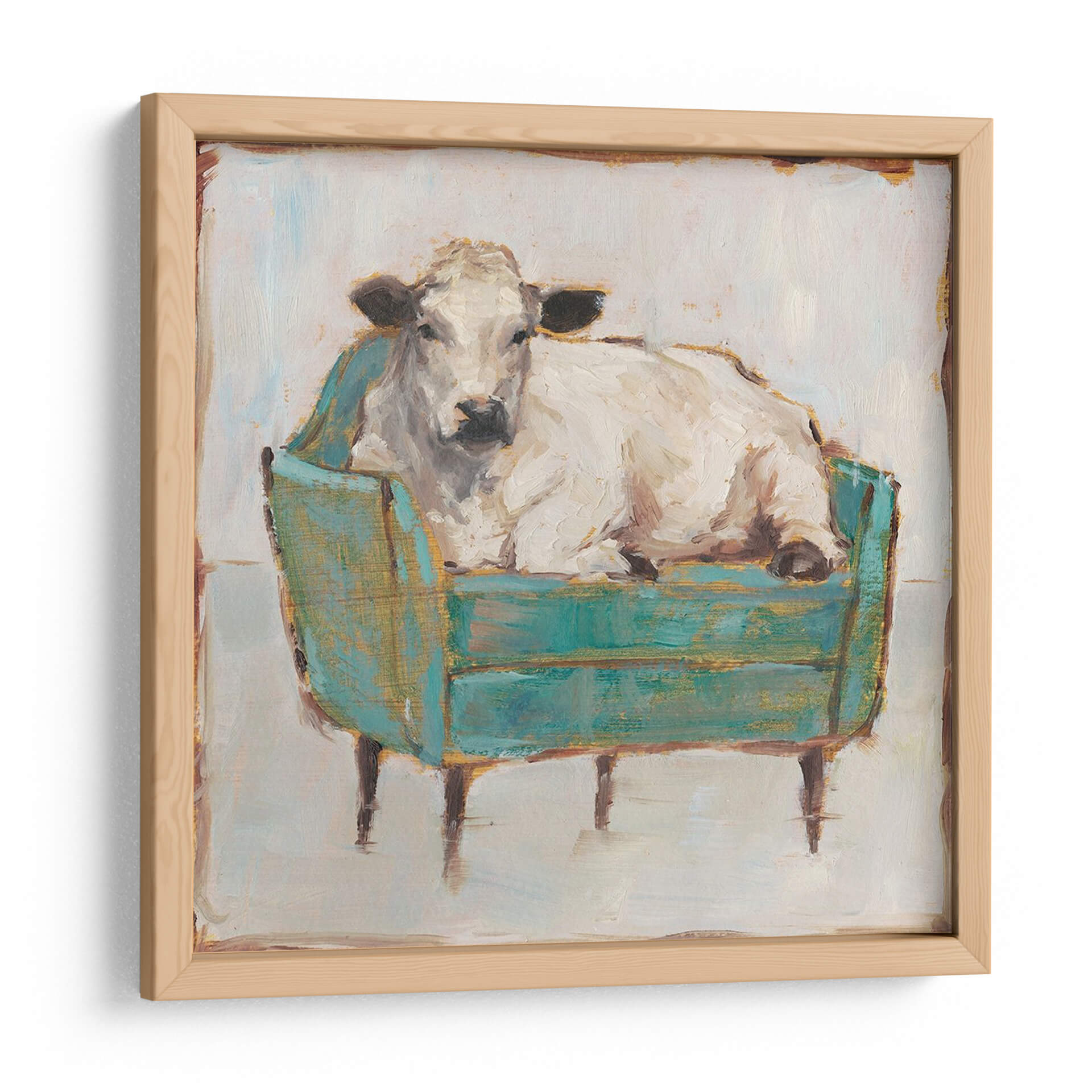 Sumérgete en la serenidad y el encanto de "Moo-Ving En I", una cautivadora obra de arte de Ethan Harper que redefine la decoración de interiores. Este cuadro decorativo presenta una vaca blanca, pintada con pinceladas sueltas y expresivas, recostada cómodamente en un sillón de terciopelo turquesa desgastado, adornado con sutiles toques dorados. La paleta de colores, dominada por blancos cremosos, turquesas profundos y acentos dorados, crea una atmósfera de calma rústica y elegancia informal. La composición, centrada en la figura principal, invita a la reflexión y añade un toque de humor peculiar a cualquier espacio. Ideal para salones, dormitorios o estudios que buscan una pieza de conversación única y un aire de sofisticación relajada. La técnica pictórica evoca una sensación de calidez y accesibilidad, haciendo de esta pieza una adición perfecta para quienes aprecian el arte contemporáneo con un toque de personalidad y un guiño a la vida rural, pero presentado con un estilo moderno y chic. Añade un toque de originalidad y dulzura a tu hogar con este cuadro decorativo que equilibra lo moderno con lo clásico.