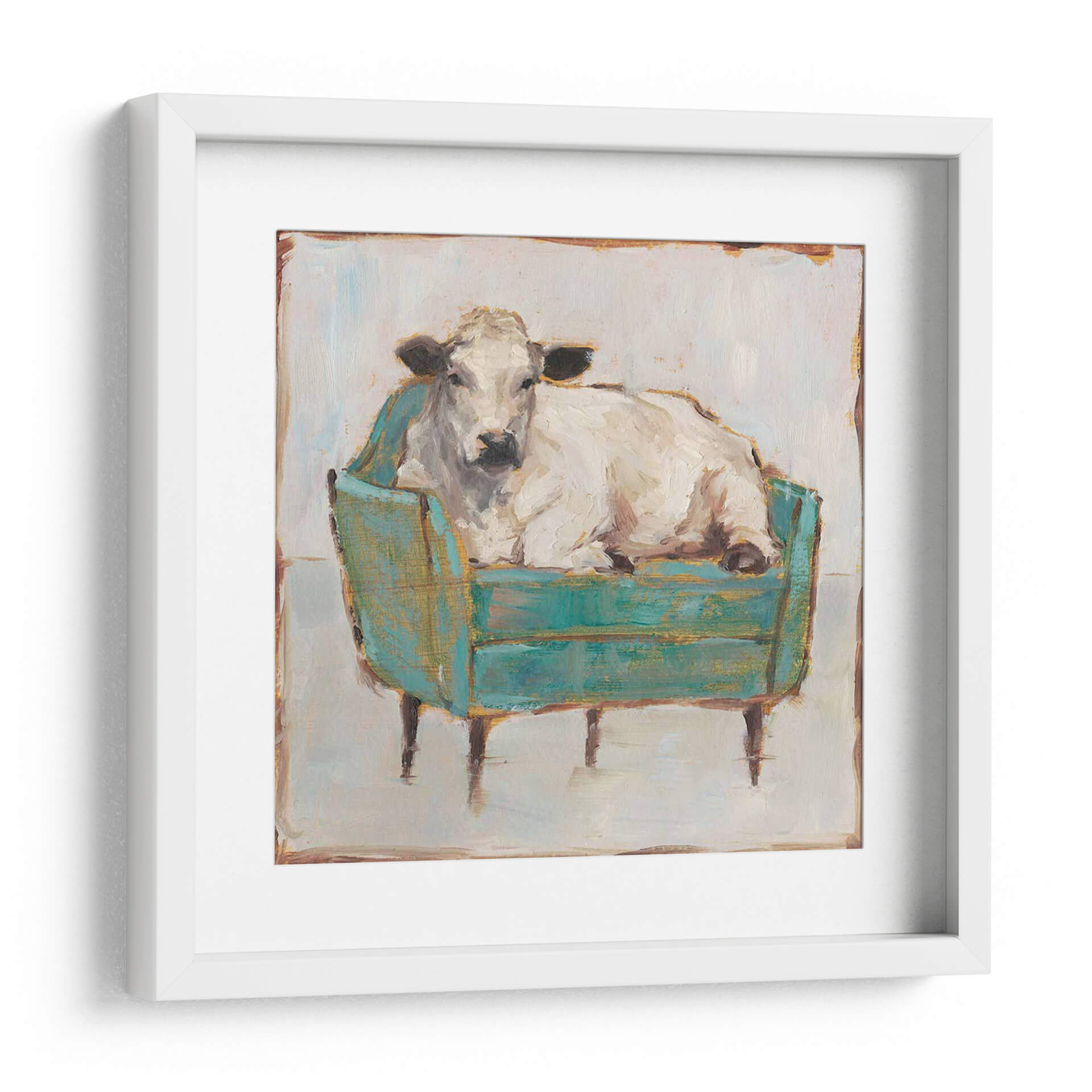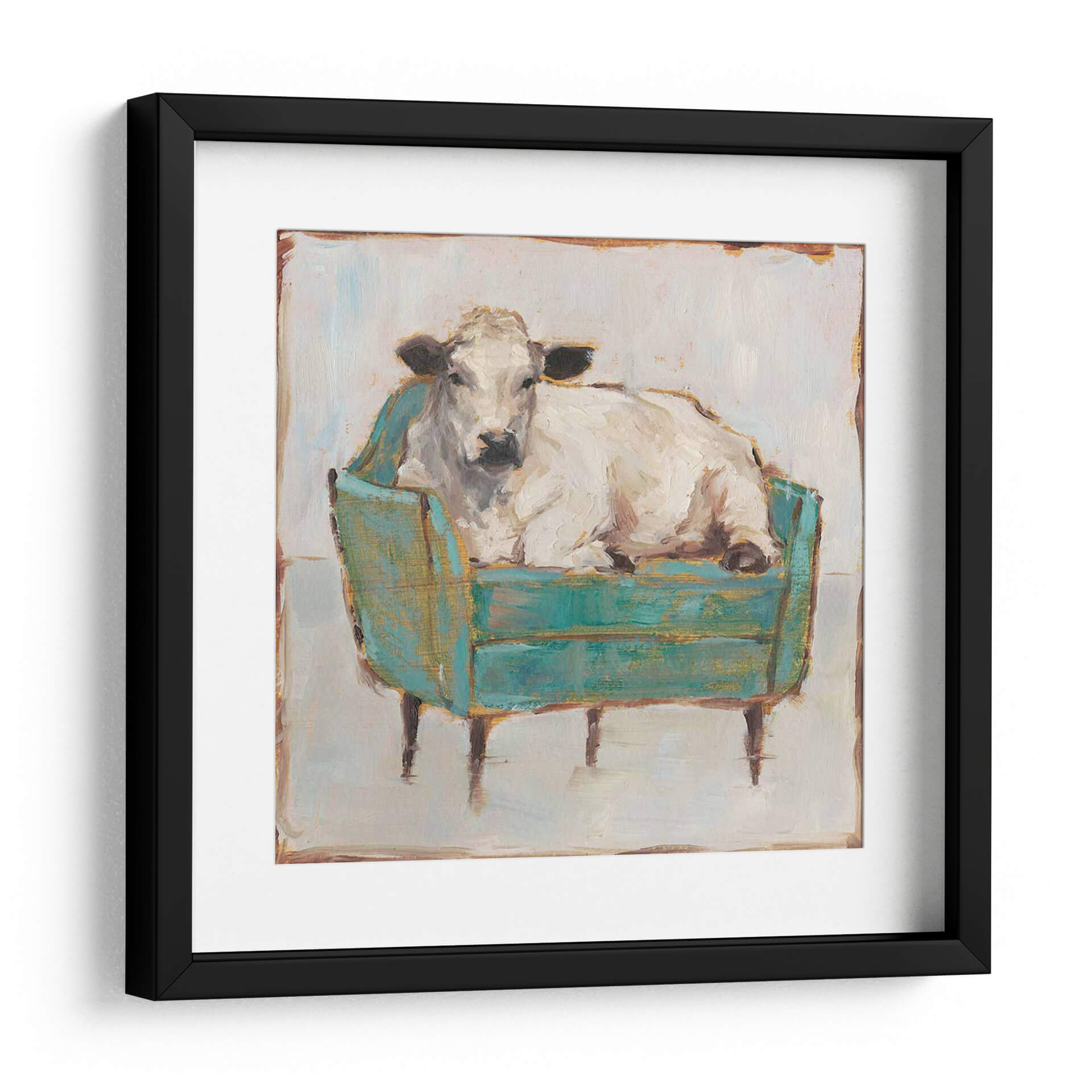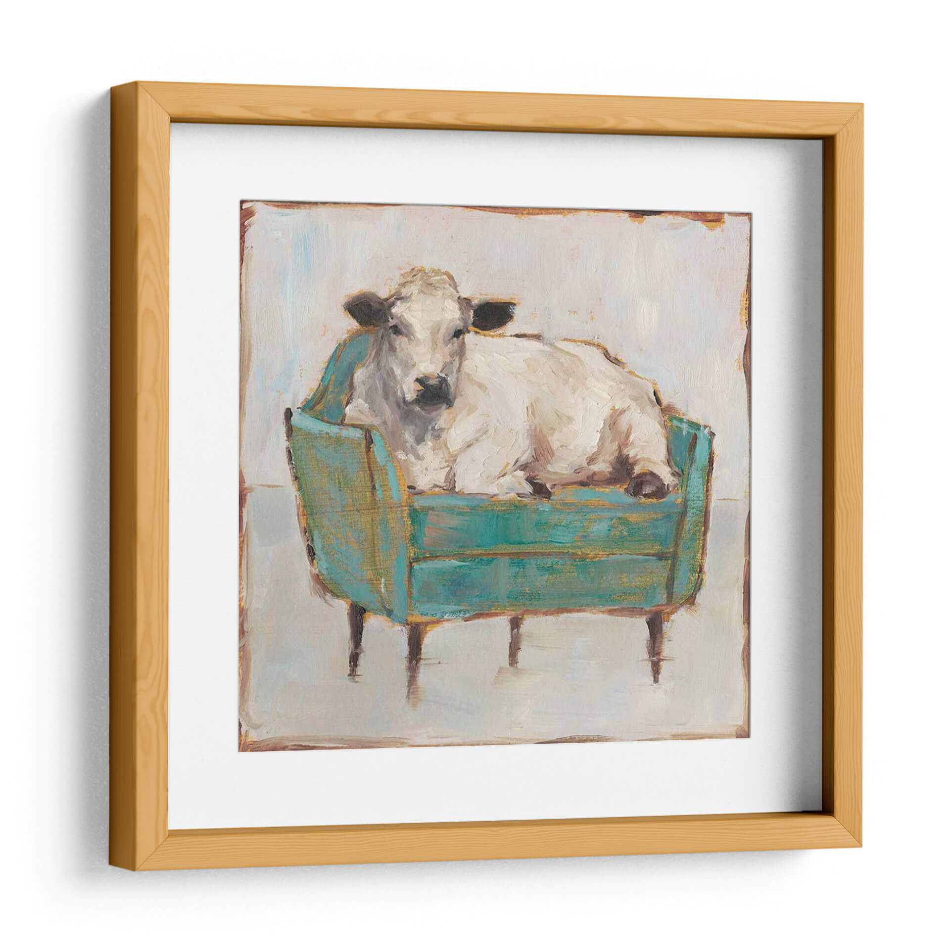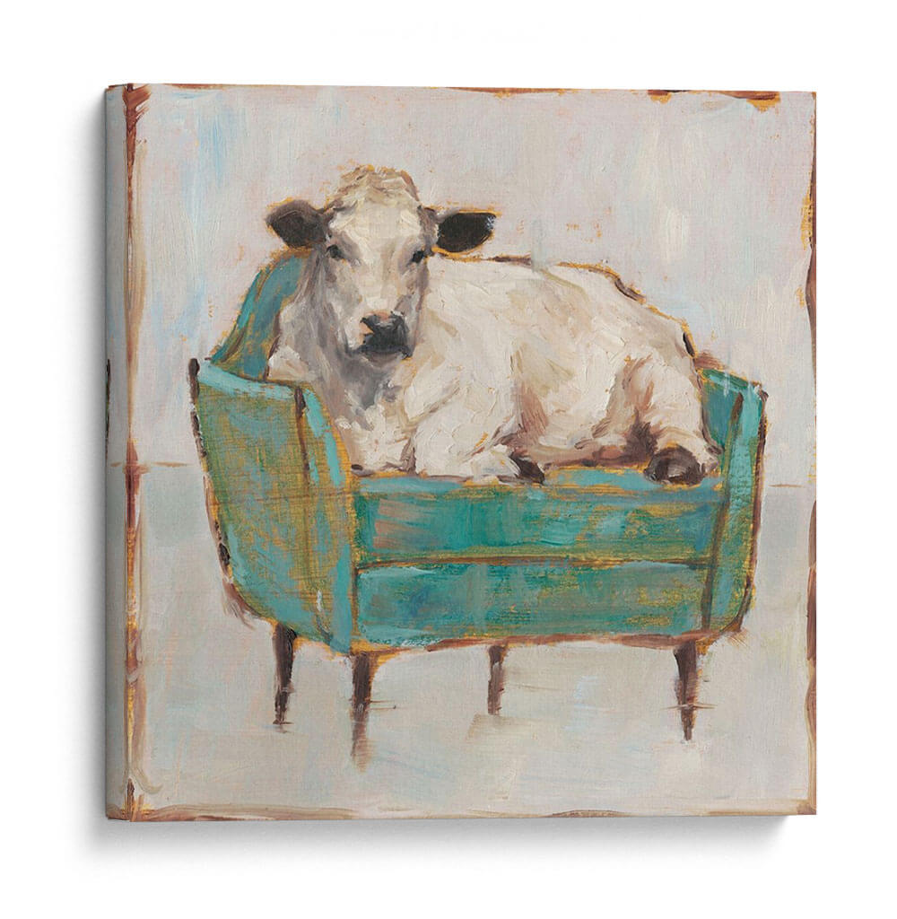 Sumérgete en la serenidad y el encanto de "Moo-Ving En I", una cautivadora obra de arte de Ethan Harper que redefine la decoración de interiores. Este cuadro decorativo presenta una vaca blanca, pintada con pinceladas sueltas y expresivas, recostada cómodamente en un sillón de terciopelo turquesa desgastado, adornado con sutiles toques dorados. La paleta de colores, dominada por blancos cremosos, turquesas profundos y acentos dorados, crea una atmósfera de calma rústica y elegancia informal. La composición, centrada en la figura principal, invita a la reflexión y añade un toque de humor peculiar a cualquier espacio. Ideal para salones, dormitorios o estudios que buscan una pieza de conversación única y un aire de sofisticación relajada. La técnica pictórica evoca una sensación de calidez y accesibilidad, haciendo de esta pieza una adición perfecta para quienes aprecian el arte contemporáneo con un toque de personalidad y un guiño a la vida rural, pero presentado con un estilo moderno y chic. Añade un toque de originalidad y dulzura a tu hogar con este cuadro decorativo que equilibra lo moderno con lo clásico.