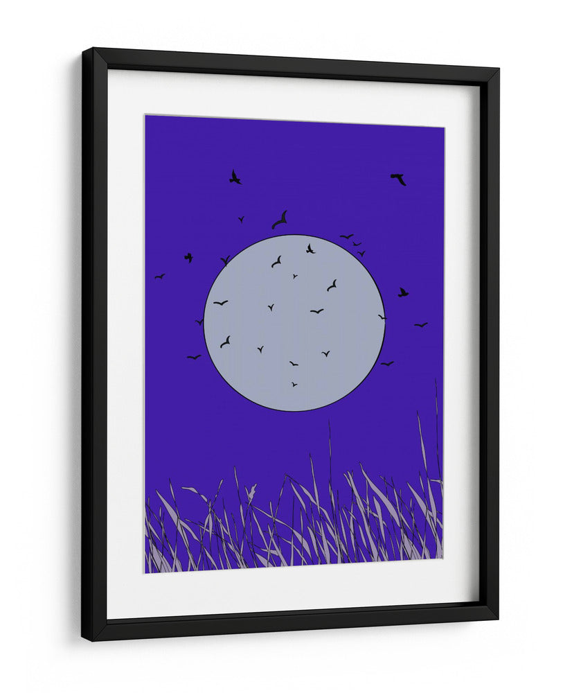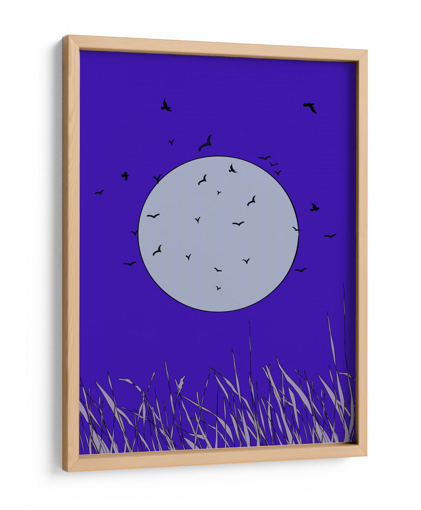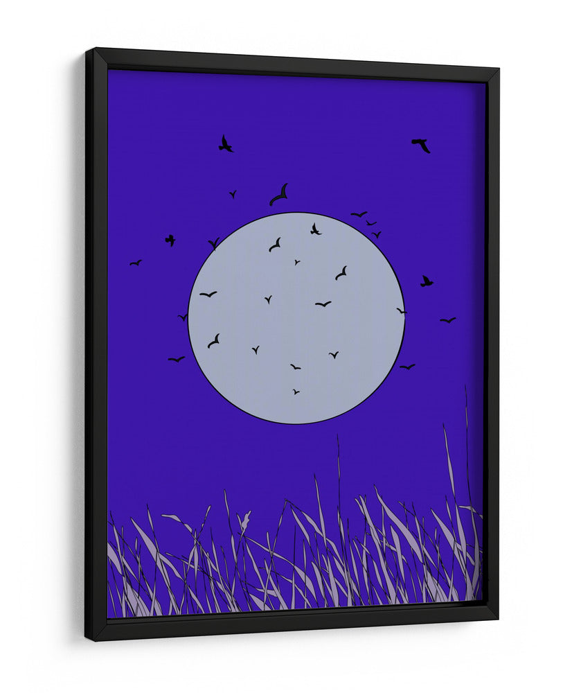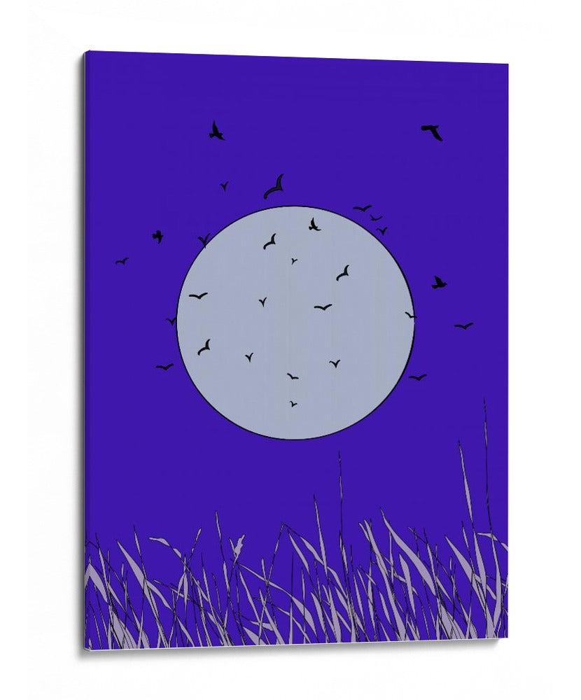 Sumérgete en la enigmática belleza de 'Murciélagos a la luz de la luna', una obra de arte digital que captura la magia de la noche. Este cuadro decorativo presenta una imponente luna pálida, rodeada por un cielo de un vibrante y profundo color azul cobalto. La composición se ve realzada por siluetas negras de murciélagos que vuelan en libertad, creando un aire de misterio y libertad, mientras que la hierba estilizada en primer plano ancla la escena con una delicadeza terrenal. La paleta de colores contrastantes, dominada por el azul intenso y los tonos grises y negros de la luna y las siluetas, genera una atmósfera de tranquilidad nocturna pero también de expectación. Ideal para quienes buscan añadir un toque de intriga y serenidad a su hogar u oficina, esta pieza evoca la calma de un paisaje nocturno y la energía sutil de la naturaleza. Su estilo gráfico y lineal la convierte en un punto focal moderno y cautivador para cualquier espacio que desee una conexión con la naturaleza en su faceta más misteriosa y poética. Añade un toque de sofisticación onírica a tu decoración con este cuadro único que invita a la contemplación.