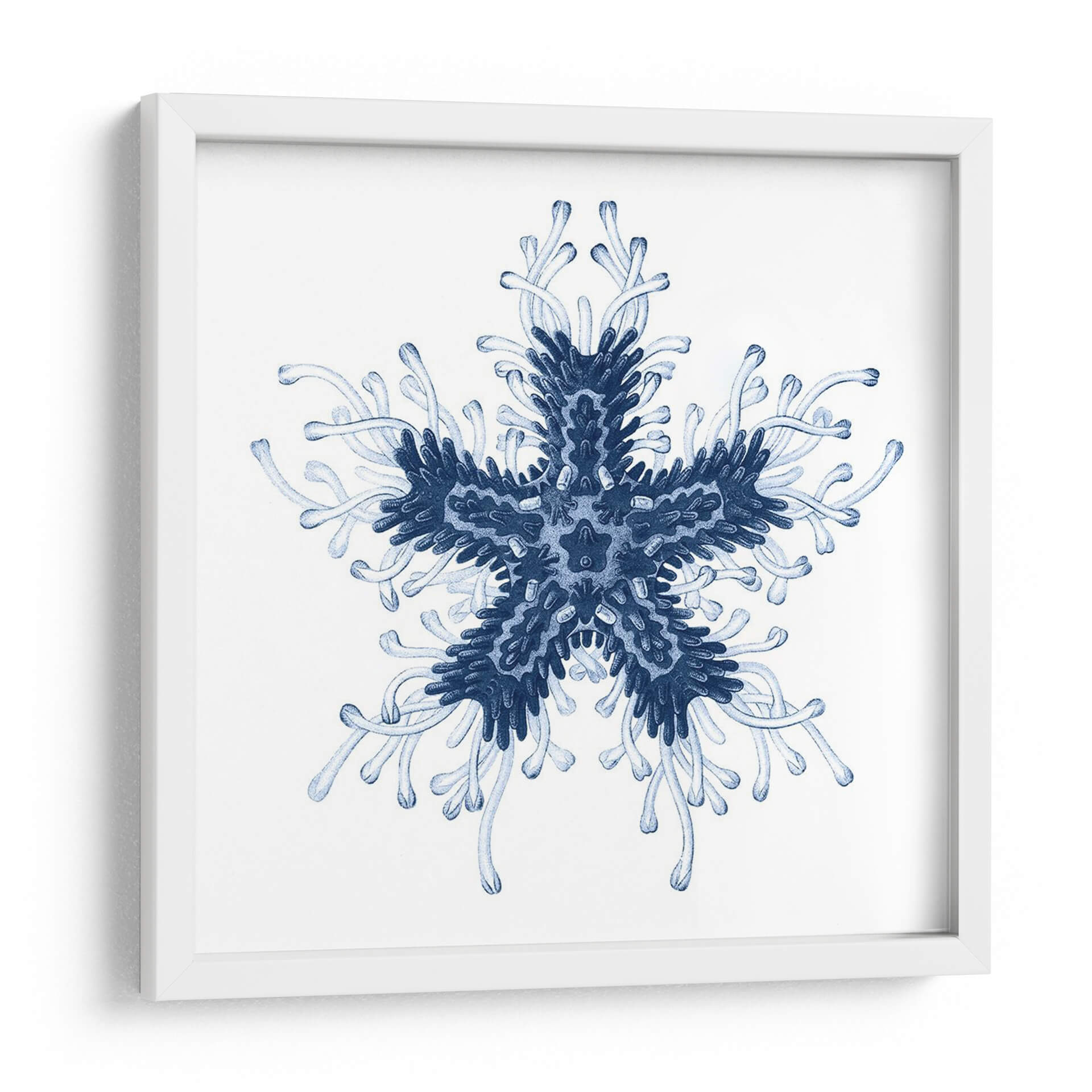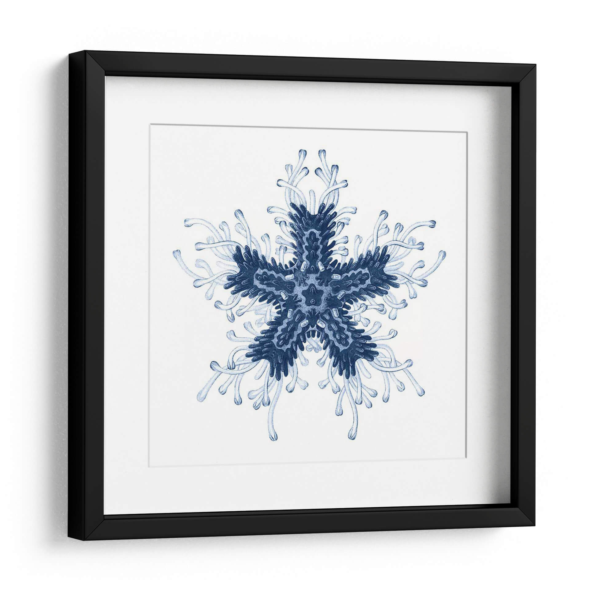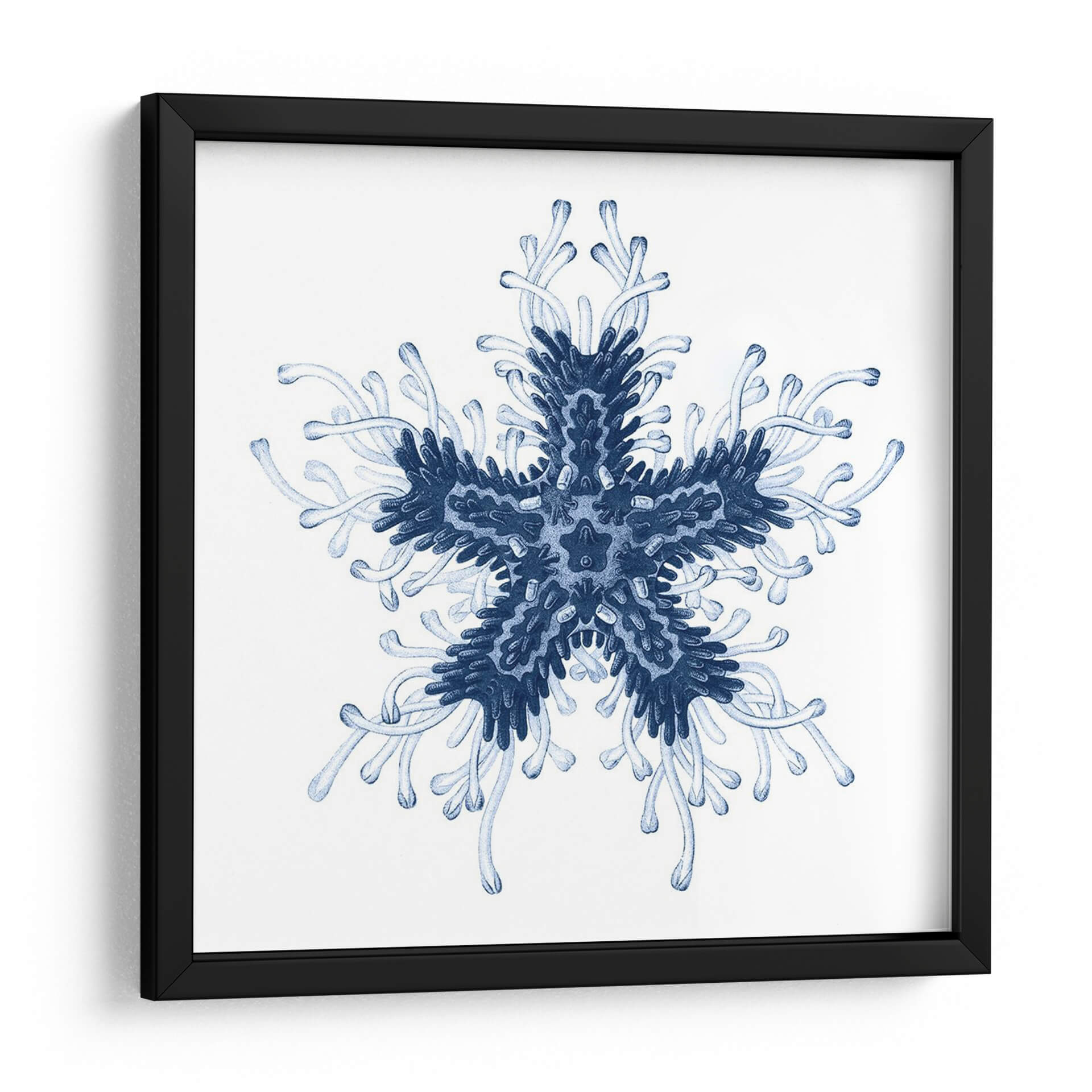 Sumérgete en la serena belleza del mar con "Navy Ocean Gems IV", una obra de arte contemporáneo que captura la intrincada simetría de la vida marina. Este cuadro decorativo presenta una forma central que recuerda a una estrella de mar o un delicado copo de nieve, extendiéndose en patrones orgánicos y fluidos. La paleta de colores se centra en profundos tonos de azul marino y azules más claros, evocando la inmensidad y la tranquilidad del océano. La composición, de estilo abstracto y orgánico, crea una sensación de armonía y orden natural. La delicada acuarela y las líneas fluidas transmiten una atmósfera de calma y contemplación, perfecta para añadir un toque de elegancia serena a cualquier espacio. Ideal para dormitorios, baños o salas de estar donde se busque un oasis de paz, "Navy Ocean Gems IV" es una pieza que invita a la relajación y a la conexión con la naturaleza. Su diseño simétrico y sus tonos azules lo convierten en un complemento versátil para decoraciones costeras, minimalistas o modernas, aportando profundidad y un toque de misterio acuático a tu hogar u oficina.