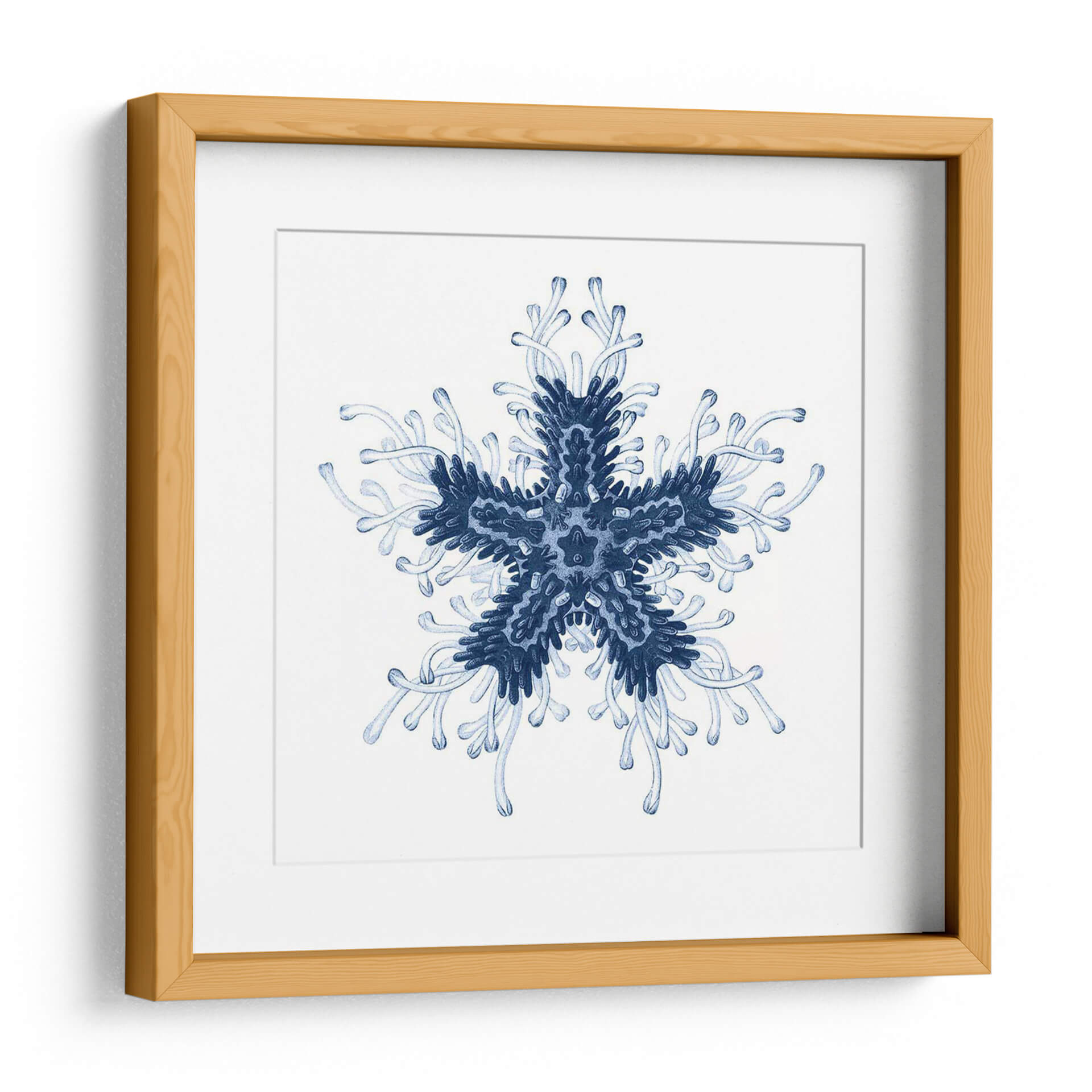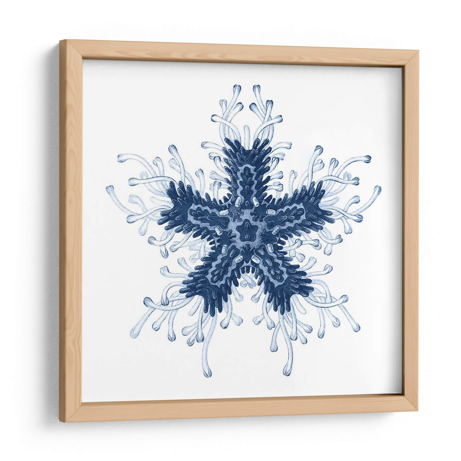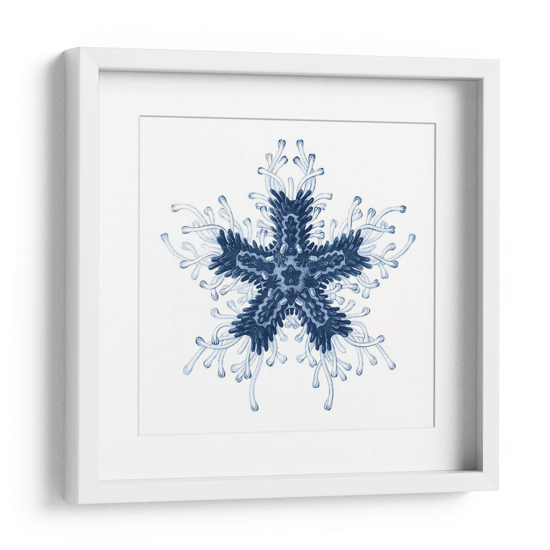 Sumérgete en la serena belleza del mar con "Navy Ocean Gems IV", una obra de arte contemporáneo que captura la intrincada simetría de la vida marina. Este cuadro decorativo presenta una forma central que recuerda a una estrella de mar o un delicado copo de nieve, extendiéndose en patrones orgánicos y fluidos. La paleta de colores se centra en profundos tonos de azul marino y azules más claros, evocando la inmensidad y la tranquilidad del océano. La composición, de estilo abstracto y orgánico, crea una sensación de armonía y orden natural. La delicada acuarela y las líneas fluidas transmiten una atmósfera de calma y contemplación, perfecta para añadir un toque de elegancia serena a cualquier espacio. Ideal para dormitorios, baños o salas de estar donde se busque un oasis de paz, "Navy Ocean Gems IV" es una pieza que invita a la relajación y a la conexión con la naturaleza. Su diseño simétrico y sus tonos azules lo convierten en un complemento versátil para decoraciones costeras, minimalistas o modernas, aportando profundidad y un toque de misterio acuático a tu hogar u oficina.
