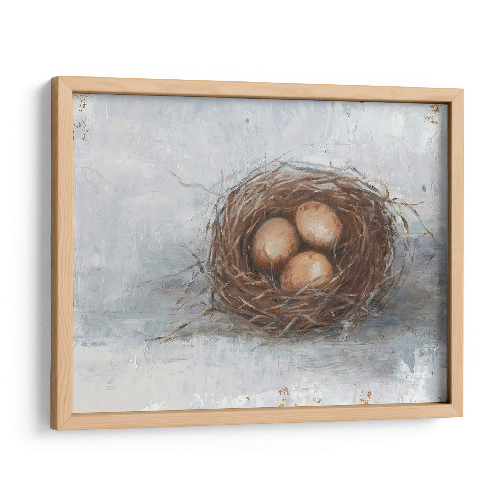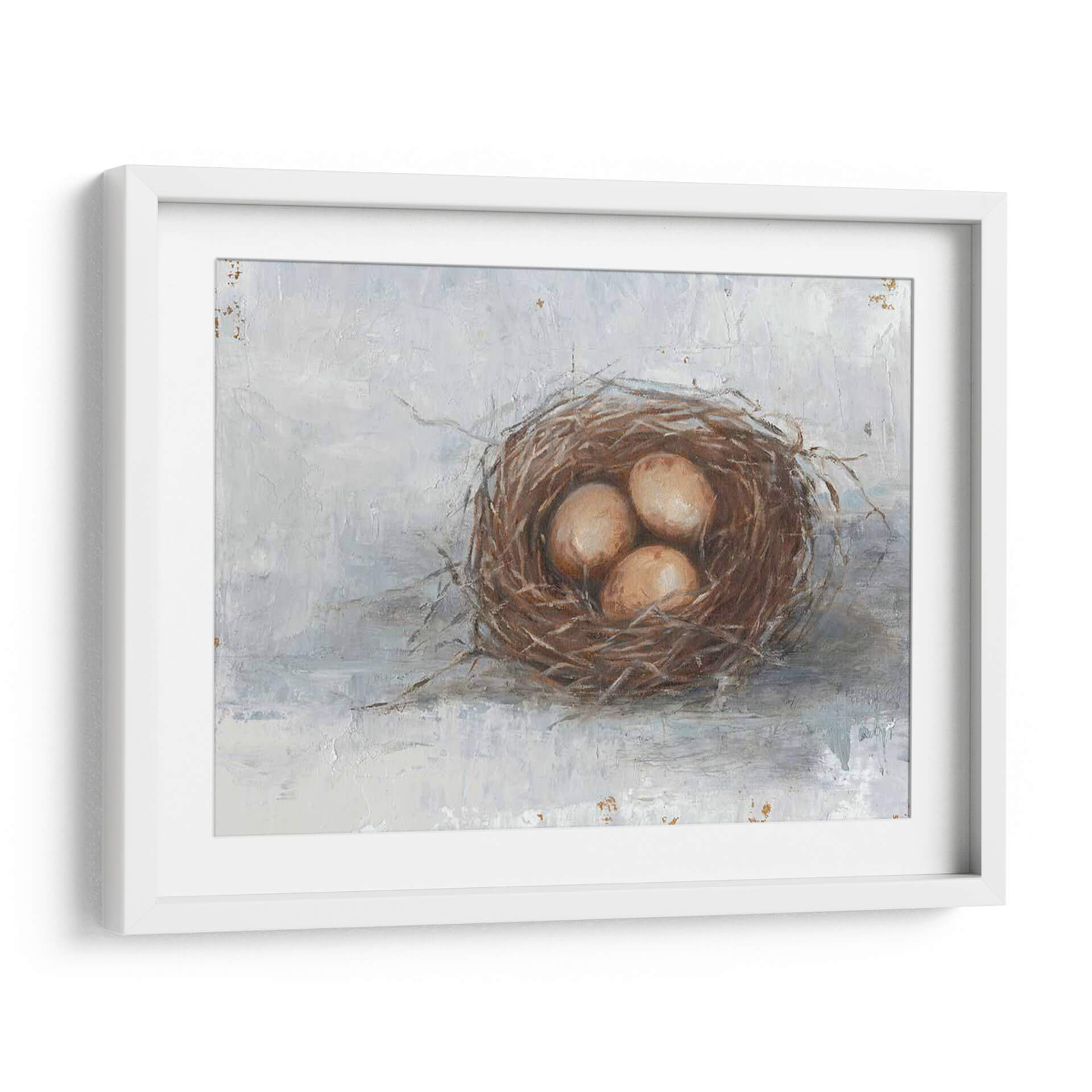 Captura la esencia de la naturaleza y la serenidad con este evocador cuadro decorativo 'Pájaro Rústico Nest Ii' del artista Ethan Harper. La obra presenta un nido de pájaro intrincadamente tejido, albergando tres delicados huevos, todo capturado con una técnica pictórica que evoca texturas rústicas y un encanto atemporal. La paleta de colores, dominada por tonos tierra cálidos del nido y los huevos, contrasta suavemente con un fondo texturizado en tonos grises y blancos apagados, creando una atmósfera de calma y contemplación. El estilo, que combina elementos realistas con una pincelada suelta y expresiva, confiere a la pieza una profundidad y un carácter únicos. Este cuadro es ideal para infundir un toque de tranquilidad natural en cualquier espacio, ya sea un dormitorio acogedor, una sala de estar serena o un estudio inspirador. Su composición centrada y su temática universal de vida y renovación lo convierten en una adición versátil y significativa para colecciones de arte de pared, aportando un recordatorio visual de la belleza simple y cíclica de la naturaleza. Transforma tu hogar con esta pieza que invita a la reflexión y la paz.