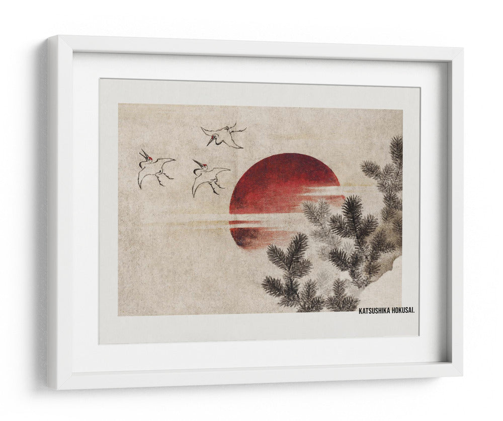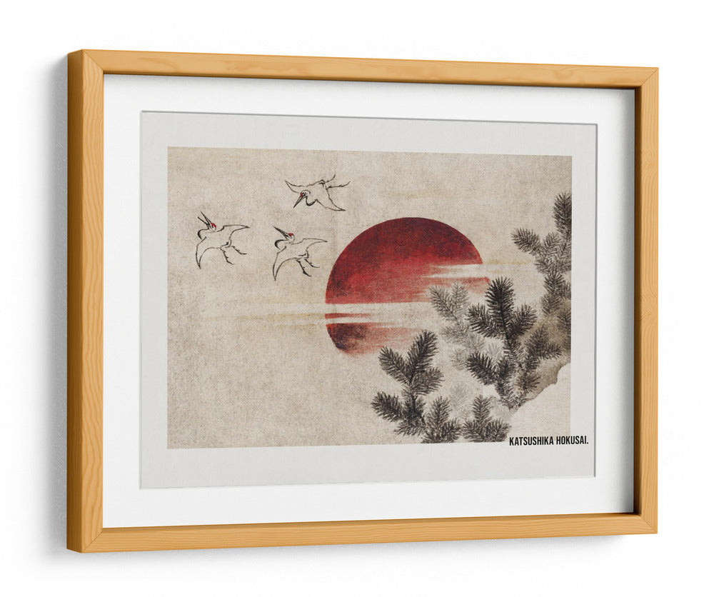 Sumérgete en la serena belleza de "Pájaros y atardecer", una obra inspirada en el icónico estilo de Hokusai. Este cuadro decorativo captura un momento efímero de la naturaleza con una elegancia atemporal. La composición presenta tres grullas en pleno vuelo, trazadas con trazos delicados y expresivos, que se dirigen hacia un sol poniente de un vibrante tono rojizo. El contraste entre la simplicidad de las aves y la fuerza del sol crea un punto focal cautivador. Los tonos tierra y ocres del fondo, reminiscentes del papel de arroz tradicional japonés, aportan una calidez y una sensación de paz. Las ramas de pino en primer plano añaden profundidad y textura, anclando la escena y evocando la conexión con el mundo natural. Esta pieza es ideal para infundir calma y sofisticación en cualquier espacio, desde una sala de estar hasta un estudio o dormitorio. Su estética única, que fusiona la delicadeza de la ilustración con la potencia del paisaje, la convierte en una adición excepcional para amantes del arte japonés, la naturaleza y la decoración contemporánea que valora la armonía visual y la profundidad emocional.