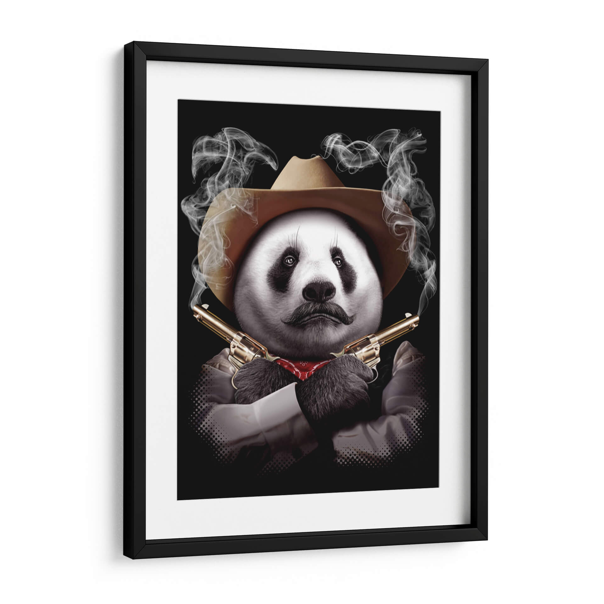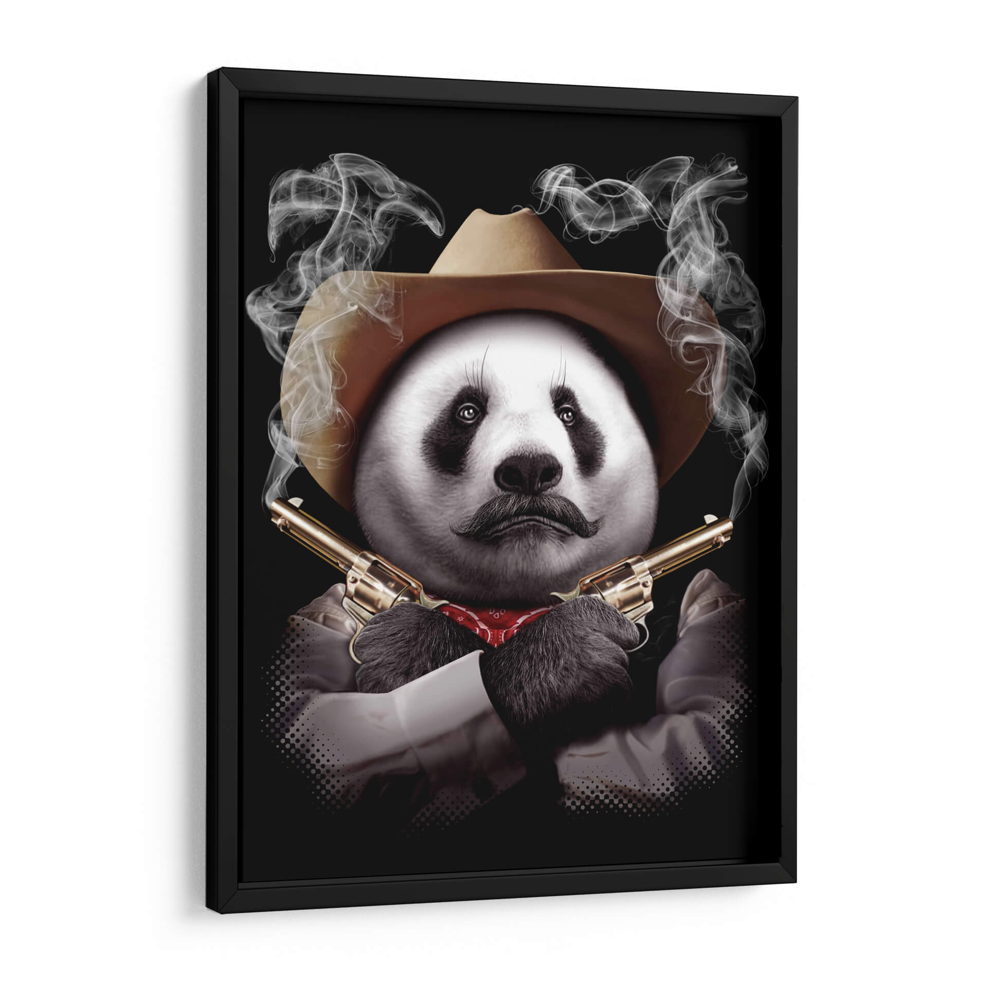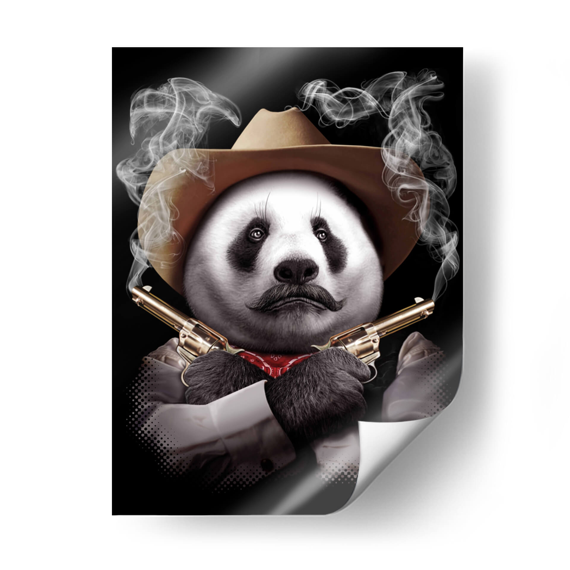 Este intrigante cuadro decorativo de un panda con sombrero de vaquero y revólveres cruzados captura la imaginación con su audaz surrealismo y humor negro. La obra presenta un panda con un bigote distintivo y un pañuelo rojo al cuello, posicionado con una actitud desafiante y envuelto en volutas de humo que emanan de las cañones de sus armas doradas. El contraste entre la tierna apariencia del panda y el peligroso arsenal crea una pieza visualmente impactante y llena de personalidad. La paleta de colores se centra en los tonos neutros del sombrero y la camisa, el brillo metálico de las pistolas y el rojo del pañuelo, todo ello sobre un fondo negro que realza la figura central y el misterio que la rodea. El estilo, una mezcla de arte digital y fotorrealismo con toques surrealistas, lo convierte en un tema de conversación garantizado. Ideal para quienes buscan un toque de originalidad y carácter en su decoración, este cuadro decorativo es perfecto para salones modernos, oficinas con carácter o cualquier espacio que desee una dosis de humor inesperado y una estética audaz. Añada un toque de rebelión y sofisticación a su hogar con esta pieza única que desafía las convenciones.