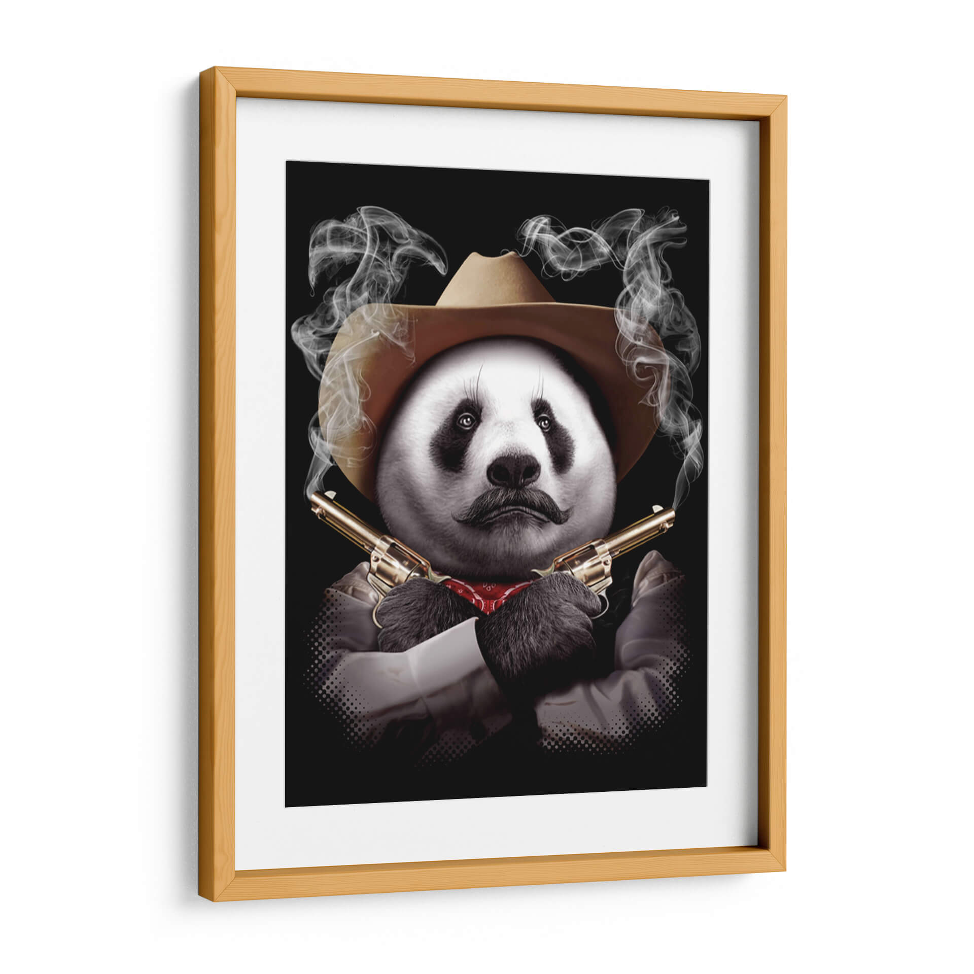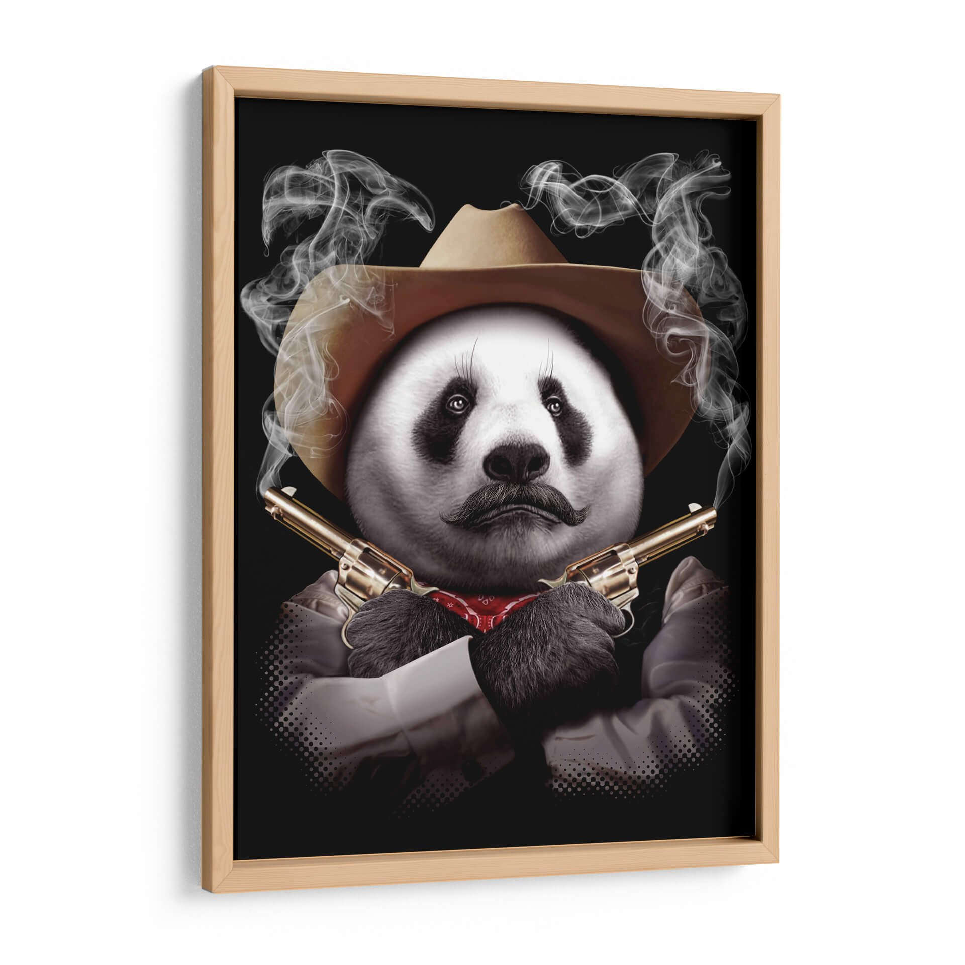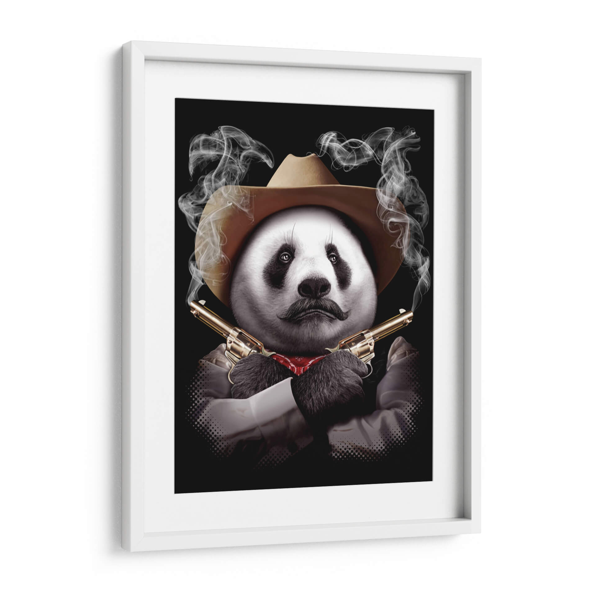 Este intrigante cuadro decorativo de un panda con sombrero de vaquero y revólveres cruzados captura la imaginación con su audaz surrealismo y humor negro. La obra presenta un panda con un bigote distintivo y un pañuelo rojo al cuello, posicionado con una actitud desafiante y envuelto en volutas de humo que emanan de las cañones de sus armas doradas. El contraste entre la tierna apariencia del panda y el peligroso arsenal crea una pieza visualmente impactante y llena de personalidad. La paleta de colores se centra en los tonos neutros del sombrero y la camisa, el brillo metálico de las pistolas y el rojo del pañuelo, todo ello sobre un fondo negro que realza la figura central y el misterio que la rodea. El estilo, una mezcla de arte digital y fotorrealismo con toques surrealistas, lo convierte en un tema de conversación garantizado. Ideal para quienes buscan un toque de originalidad y carácter en su decoración, este cuadro decorativo es perfecto para salones modernos, oficinas con carácter o cualquier espacio que desee una dosis de humor inesperado y una estética audaz. Añada un toque de rebelión y sofisticación a su hogar con esta pieza única que desafía las convenciones.