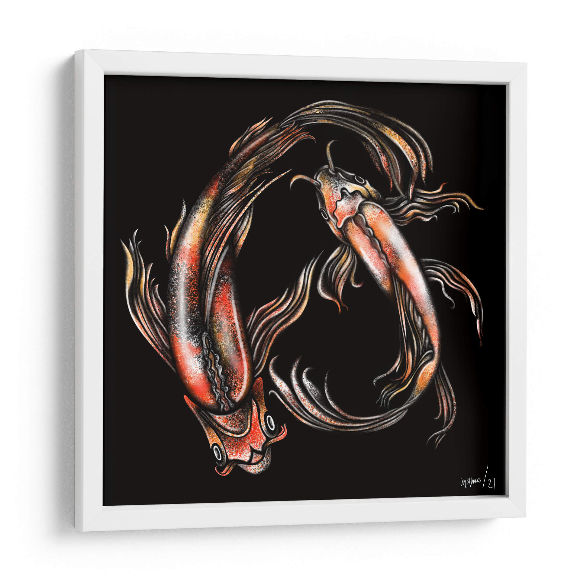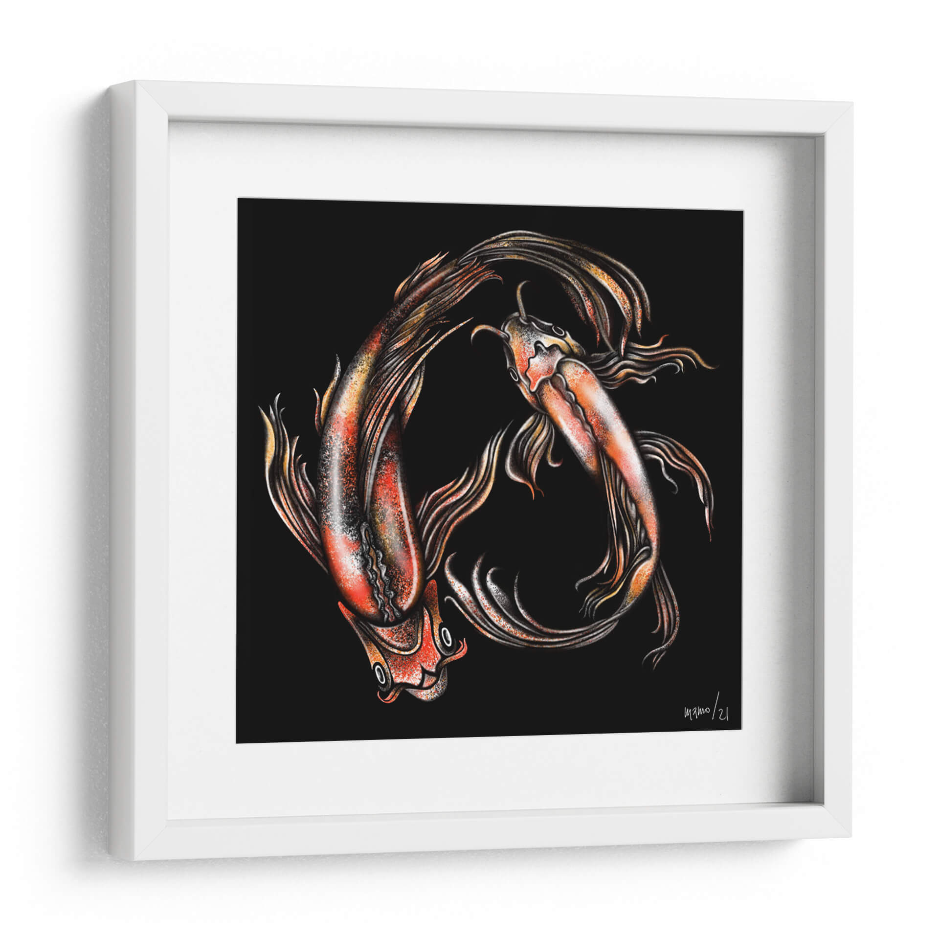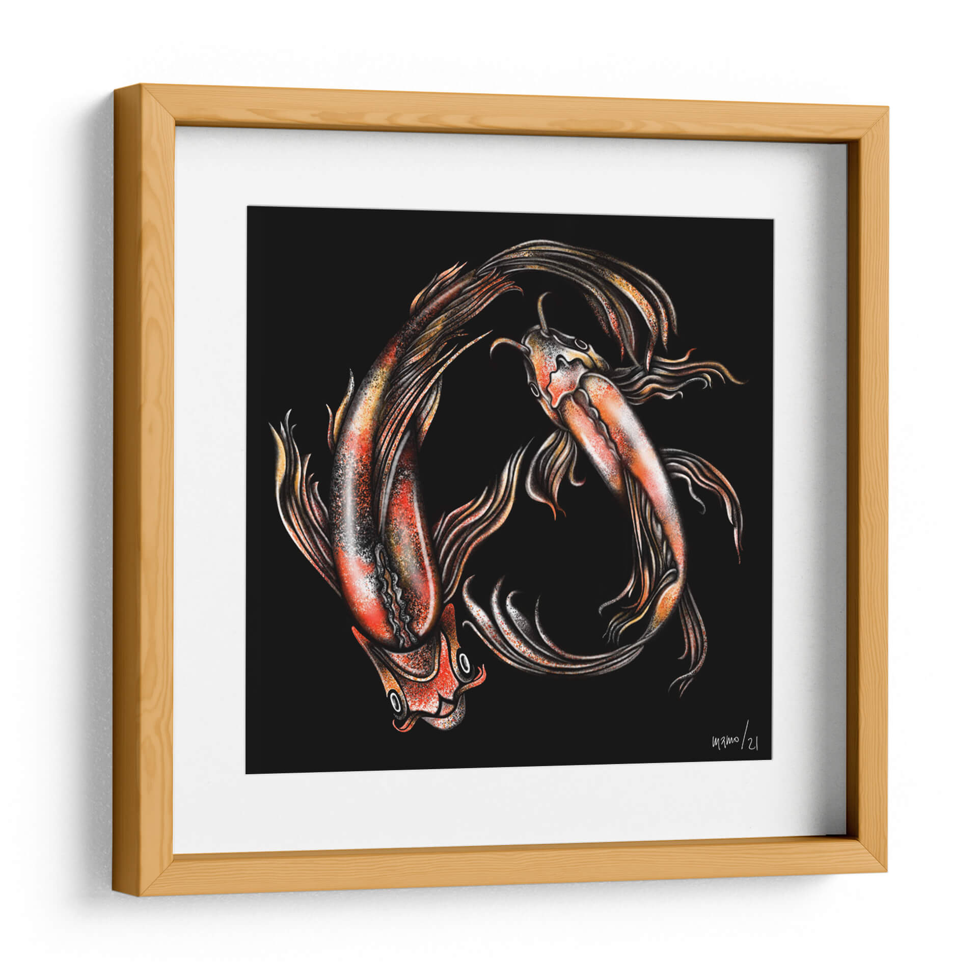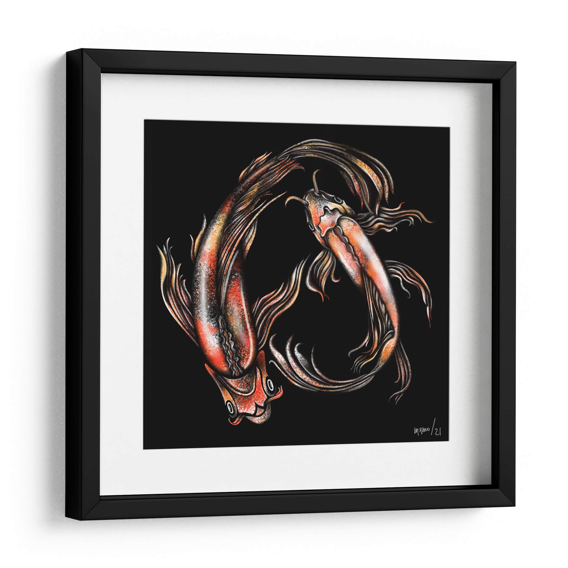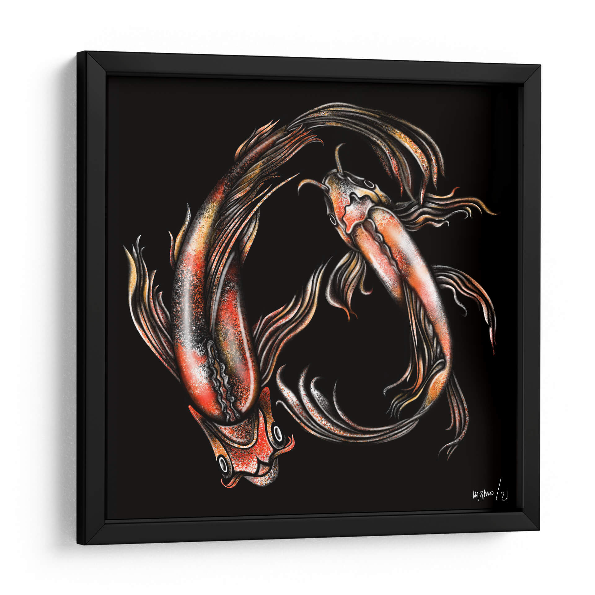 Sumérgete en la serena belleza de 'Peces Koi' de Gina Villalobos, una obra de arte digital que captura la elegancia y el movimiento de estos icónicos peces. La composición, dominada por un profundo fondo negro, realza el vibrante juego de colores anaranjados, rojizos y blancos que adornan las escamas y las fluidas aletas de los koi. Cada trazo parece danzar, creando una sensación de armonía y fluidez que atrae la mirada y calma el espíritu. Este cuadro decorativo es una representación estilizada que evoca tradición y modernidad a la vez, ideal para infundir un toque de sofisticación y tranquilidad en cualquier espacio. Imagina este cautivador diseño en tu sala de estar, aportando un punto focal de energía contenida, o en tu estudio, inspirando concentración y paz. 'Peces Koi' no es solo una pieza decorativa, sino una invitación a la contemplación, perfecta para quienes buscan arte con significado y un diseño contemporáneo que trascienda las tendencias. Añade esta obra maestra a tu colección y transforma tu hogar u oficina en un santuario de estilo y serenidad.