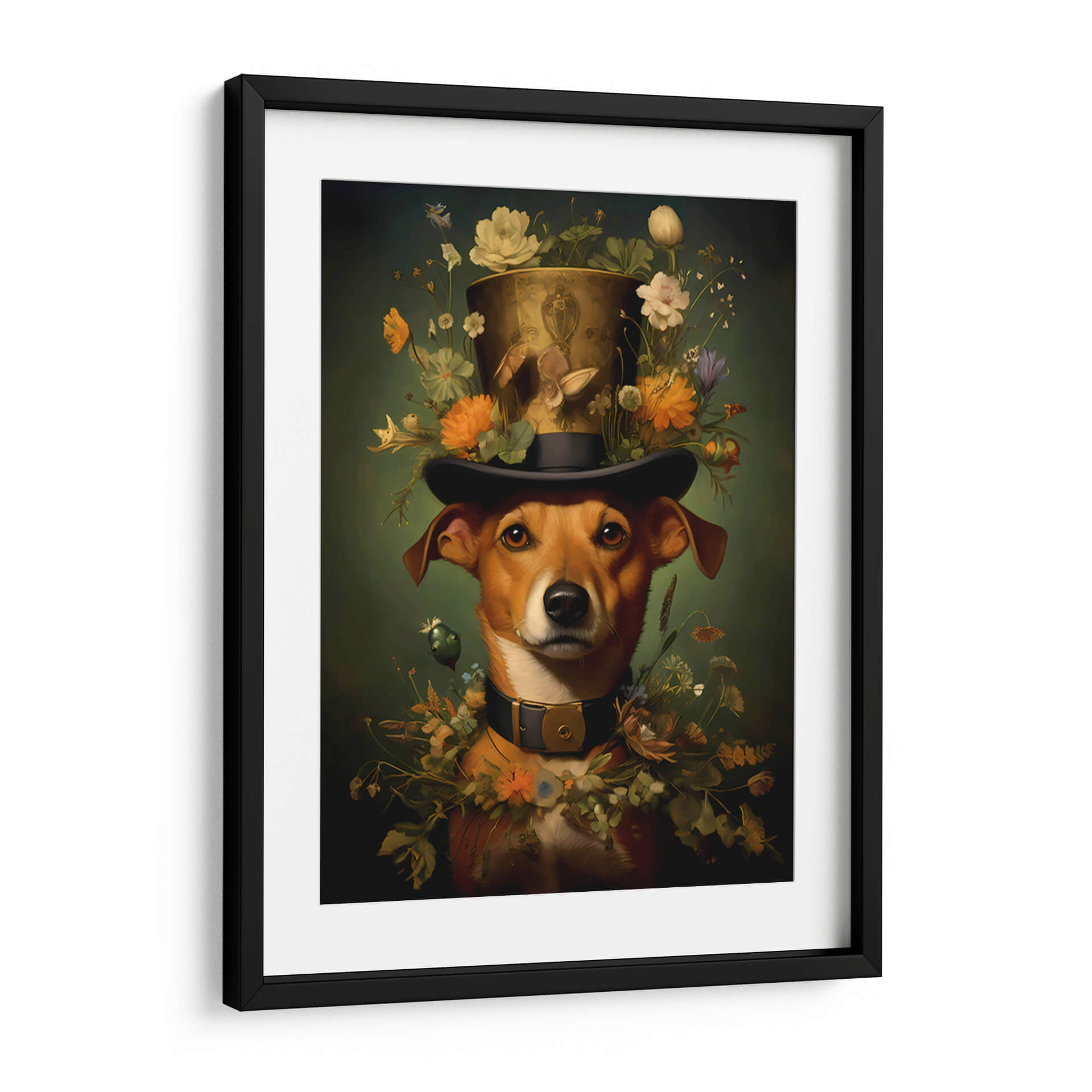 Embellece tu espacio con este cautivador cuadro decorativo "Perro" de Jessica CA. Esta obra de arte presenta un retrato surrealista y encantador de un perro con un sombrero de copa adornado con una exuberante corona de flores de temporada. La paleta de colores, dominada por verdes profundos y ricos tonos tierra y anaranjados de las flores, crea una atmósfera de fantasía y elegancia atemporal. El estilo, que fusiona elementos realistas con un toque onírico, evoca una sensación de sorpresa y dulzura, ideal para aquellos que buscan añadir un punto focal único y lleno de carácter a su hogar u oficina. La composición centrada en el animal y la detallada representación de la flora invitan a la contemplación, transformando cualquier habitación en un espacio con historia y personalidad. Este cuadro es perfecto para amantes de los animales, la naturaleza y el arte contemporáneo que aprecian las piezas con un giro imaginativo. Añade un toque de magia y sofisticación a tu decoración con esta pieza que seguro será tema de conversación.