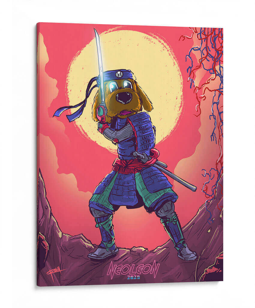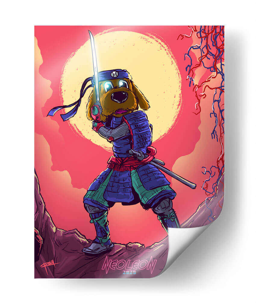 Sumérgete en un universo de fantasía y audacia con "Perro Sultán", una obra de arte digital vibrante y llena de carácter. Esta pieza única presenta a un perro caricaturesco, ataviado como un samurái en una pose de combate decidida, empuñando su katana. La paleta de colores es intensa, dominada por un cálido y poderoso fondo rojizo que evoca el amanecer o el ocaso, coronado por un sol o luna imponente de tonalidad amarilla. Los detalles en azul cobalto y verde esmeralda del atuendo del samurái contrastan con el rojo circundante, creando un impacto visual dinámico. El estilo, una fusión entre la ilustración de cómic y el arte fantástico, es audaz y expresivo, con líneas marcadas y una atmósfera de valentía y determinación. "Perro Sultán" es ideal para aquellos que buscan infundir energía y un toque de humor épico en sus espacios. Coloca este cuadro decorativo en tu sala de estar, oficina o estudio para añadir un punto focal intrigante que sin duda generará conversación. Es una elección perfecta para amantes de los animales, la cultura japonesa y el arte contemporáneo con un giro inesperado y divertido. Transforma tu decoración con esta obra llena de personalidad y estilo.