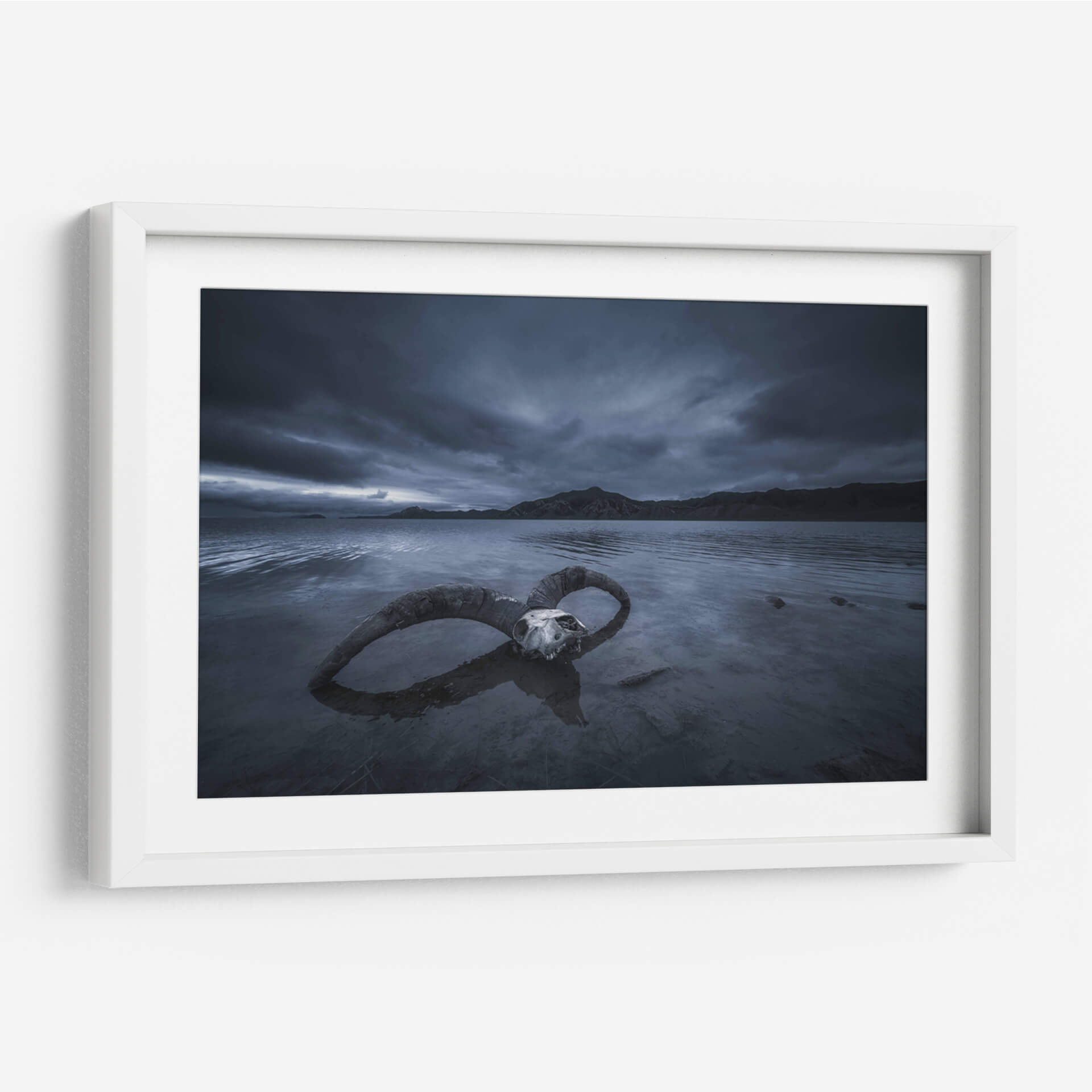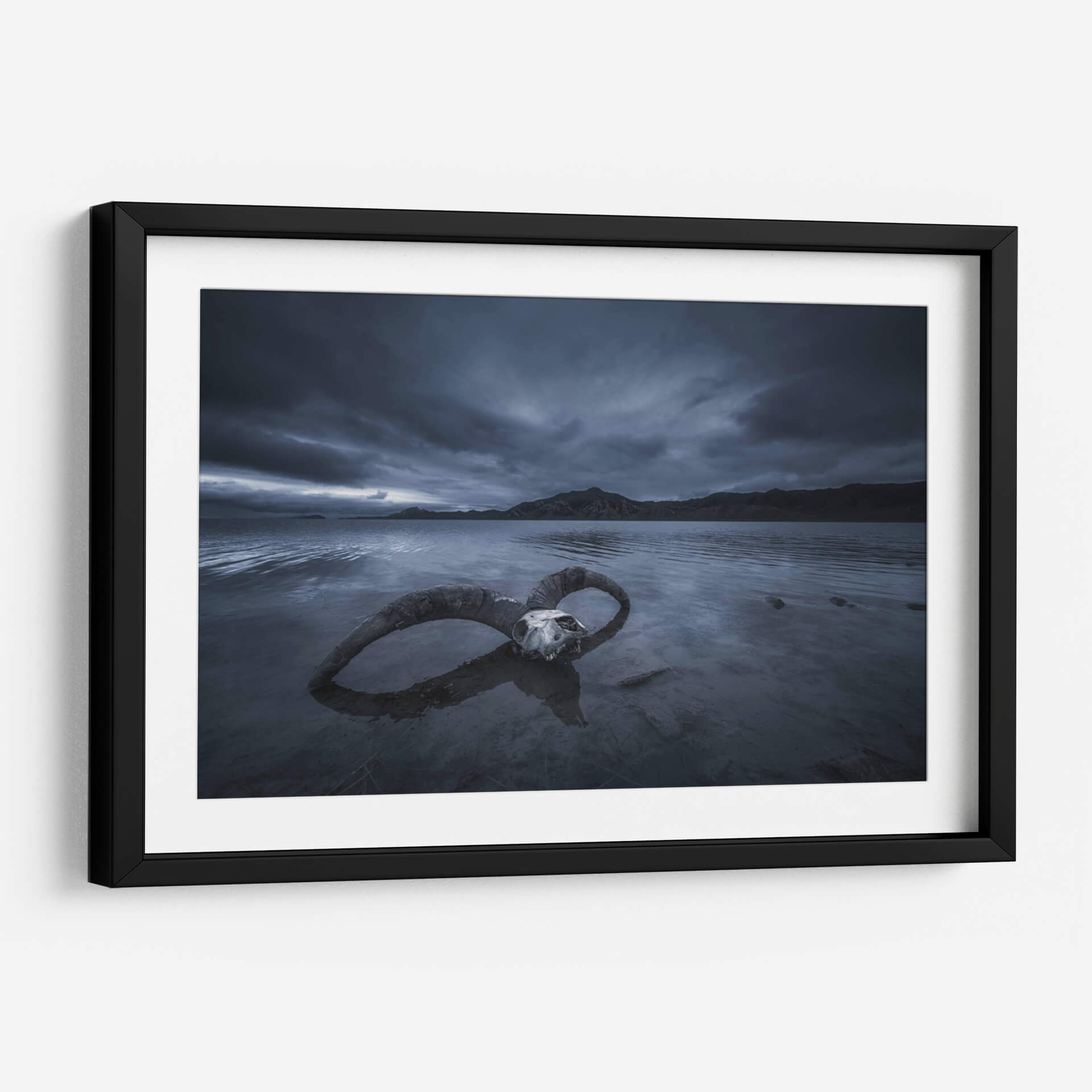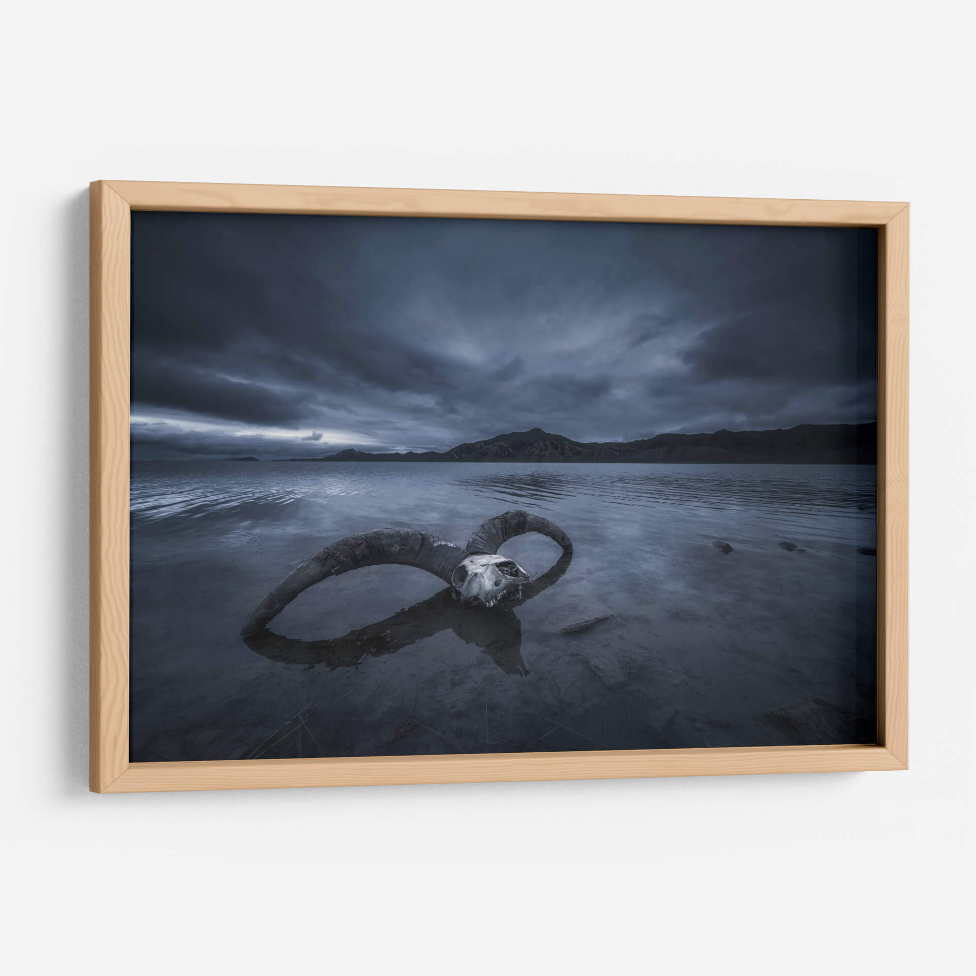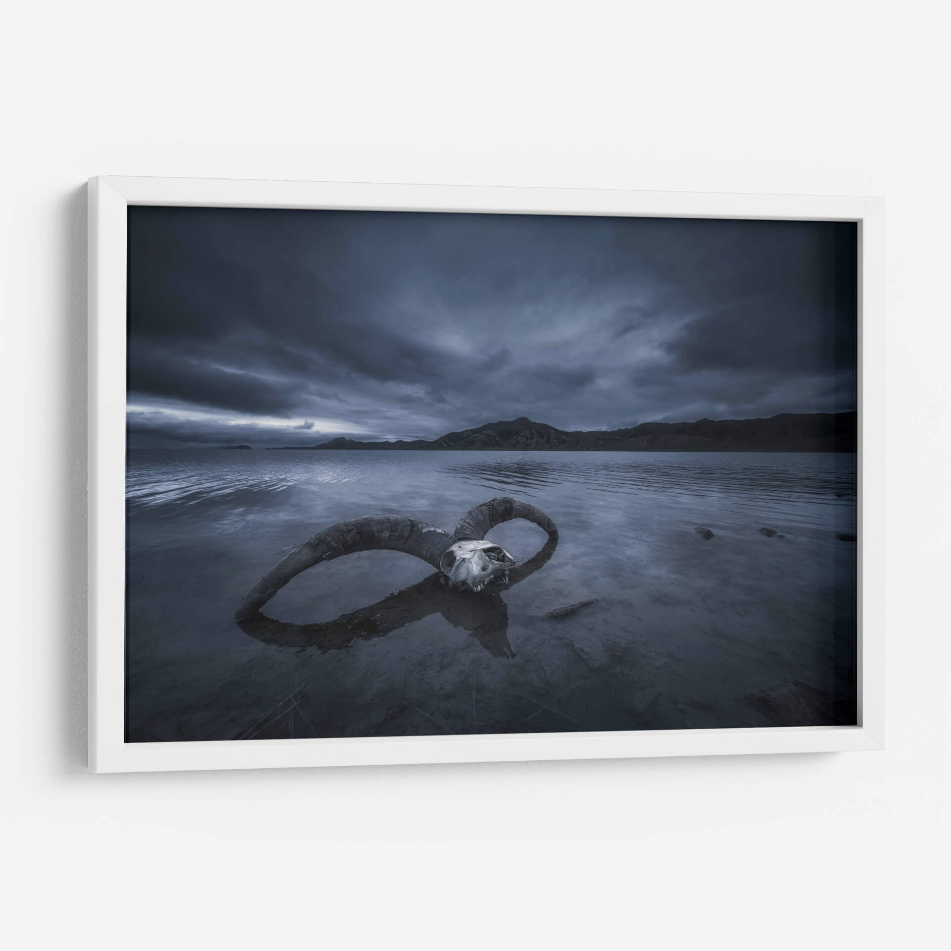Sumérgete en la atmósfera enigmática de "Playa de hueso blanco", una obra de arte que evoca misterio y reflexión. Este cuadro decorativo captura un cráneo de animal con imponentes cuernos, sumergido parcialmente en aguas tranquilas y oscuras, bajo un cielo tormentoso y cargado de nubes. La paleta de colores sombría, dominada por azules profundos y grises, crea una sensación de calma melancólica y una profunda conexión con la naturaleza en su estado más crudo. La composición, que enfoca el cráneo en primer plano con un paisaje de montañas distantes y un horizonte amplio, invita a la contemplación sobre la vida, la muerte y la impermanencia. Es una pieza perfecta para quienes buscan añadir un toque de intriga y profundidad a su decoración, ideal para salas de estar modernas, estudios o cualquier espacio que requiera un punto focal que inspire conversación y pensamiento. Este cuadro decorativo es más que una imagen; es una invitación a explorar las profundidades de la existencia y la belleza que se encuentra en lo efímero.