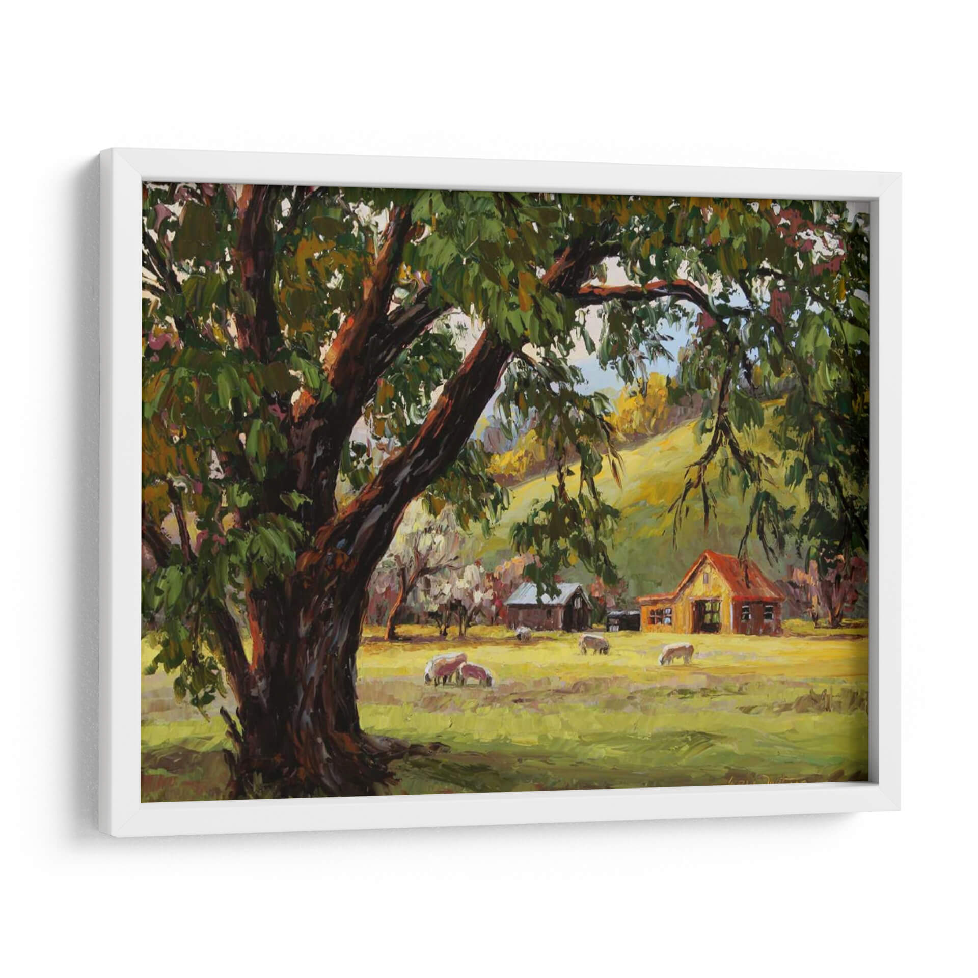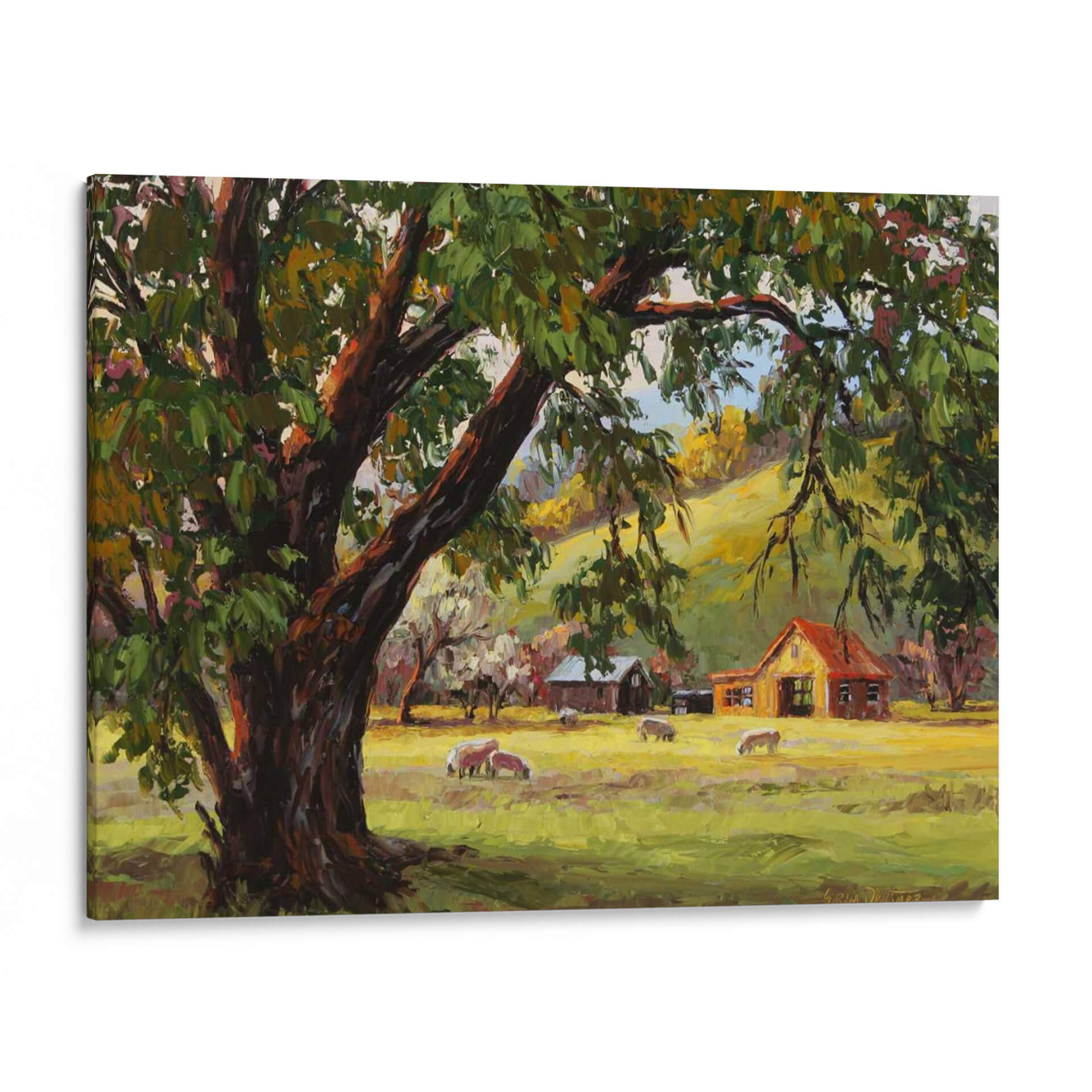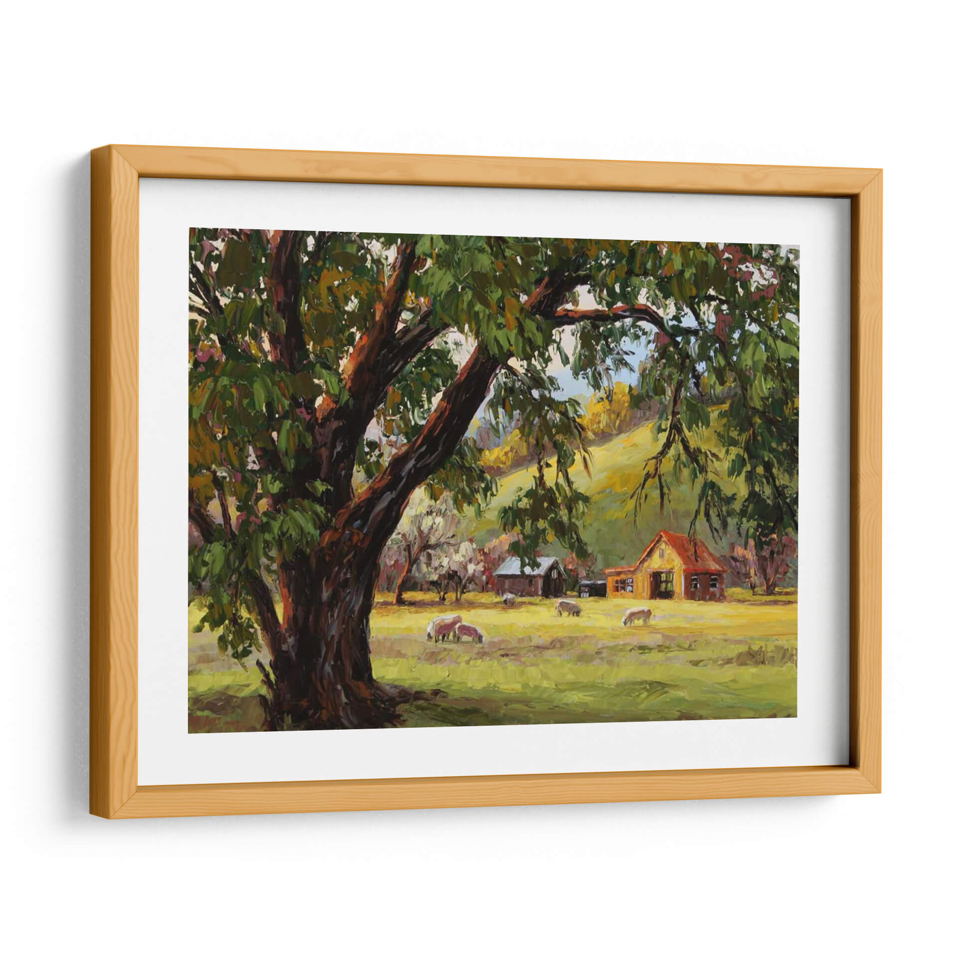 Transporta tu hogar a un idílico refugio rural con "Pradera Tranquila", una obra de arte que captura la esencia de la paz y la simplicidad. La pintura presenta un paisaje sereno donde un árbol majestuoso domina el primer plano, sus ramas frondosas enmarcando una escena pastoral. En la distancia, se vislumbran acogedoras edificaciones rurales, como granjas o cabañas, dispersas en un prado bañado por la cálida luz del sol. Ovejas pastan pacíficamente, añadiendo un toque de vida y movimiento a la quietud del entorno. La paleta de colores es rica y vibrante, dominada por verdes exuberantes, amarillos dorados y toques de rojo en los tejados, creando una atmósfera cálida y acogedora. El estilo pictórico, con pinceladas visibles, evoca una sensación de impresionismo moderno, invitando al espectador a sentir la brisa y el aroma de la naturaleza. Este cuadro decorativo es perfecto para aquellos que buscan infundir calma y belleza natural en sus espacios. Ideal para salones, comedores o dormitorios, "Pradera Tranquila" ofrece un escape visual a un mundo de serenidad y armonía, convirtiéndose en un punto focal encantador que inspira paz y bienestar.