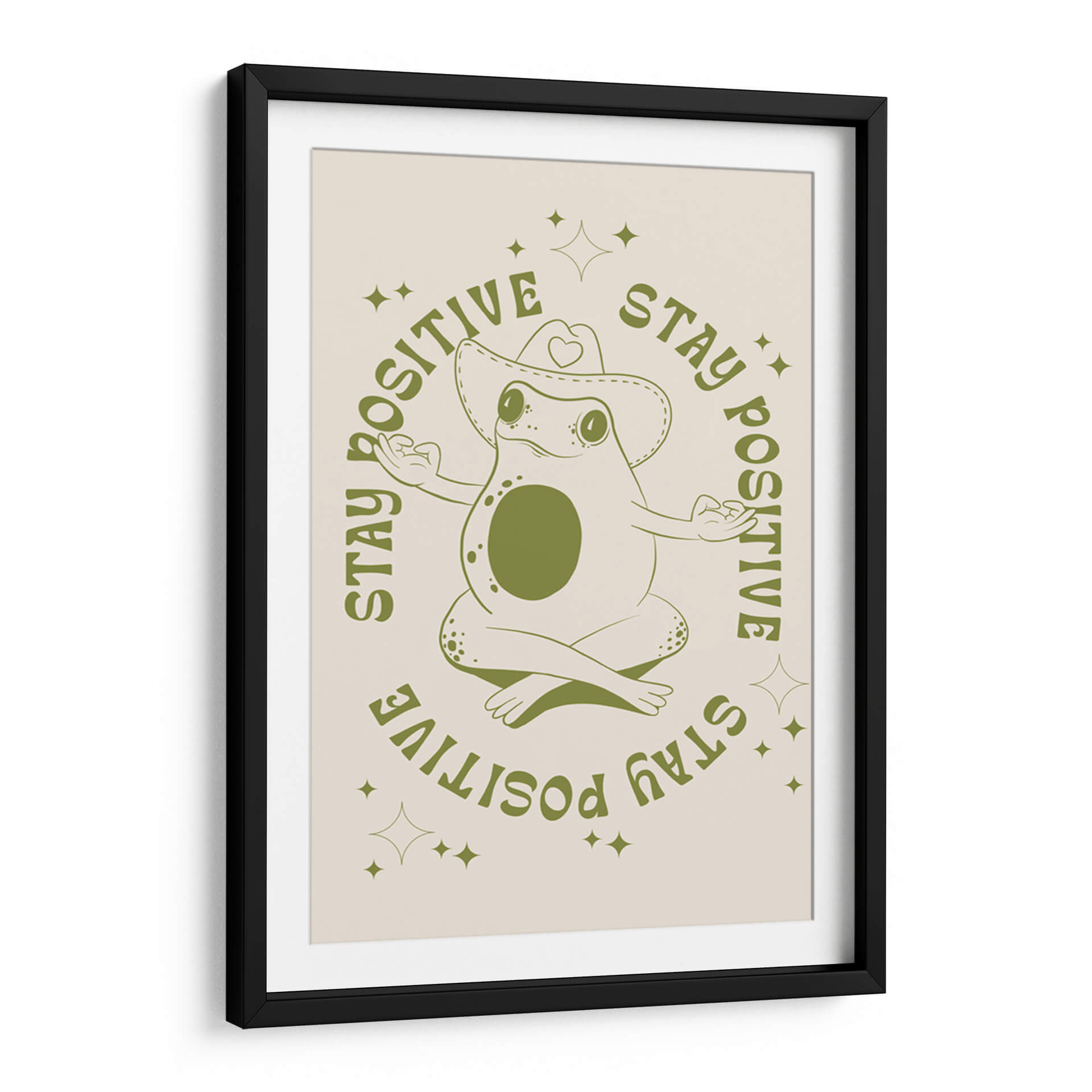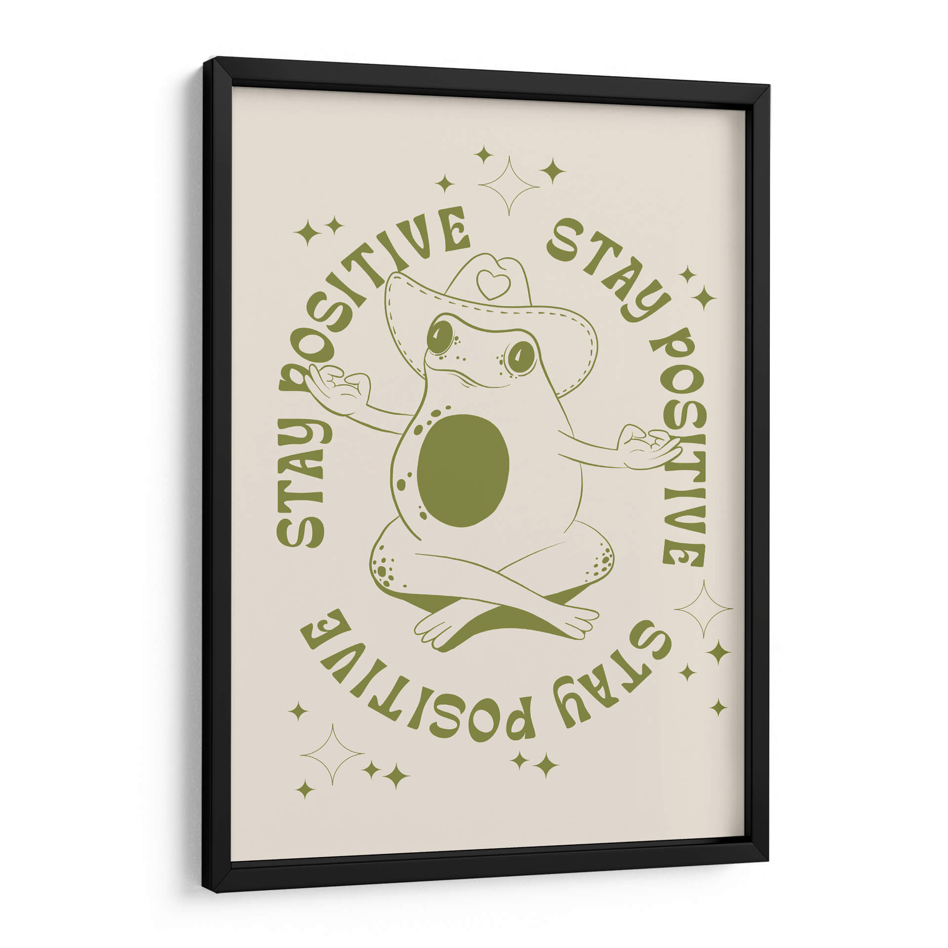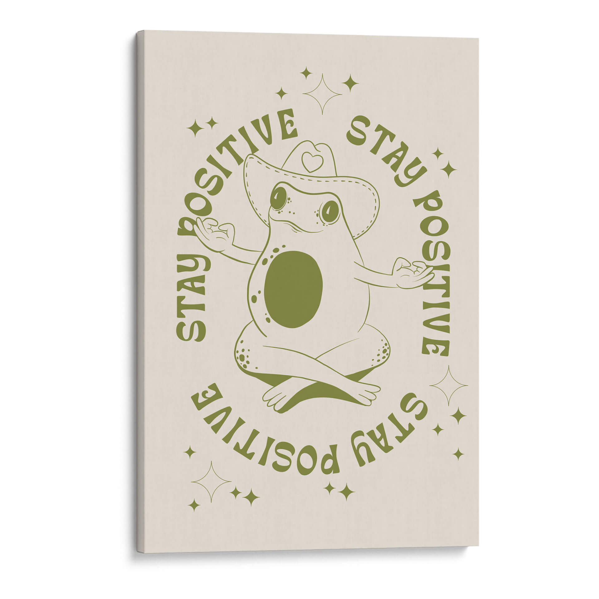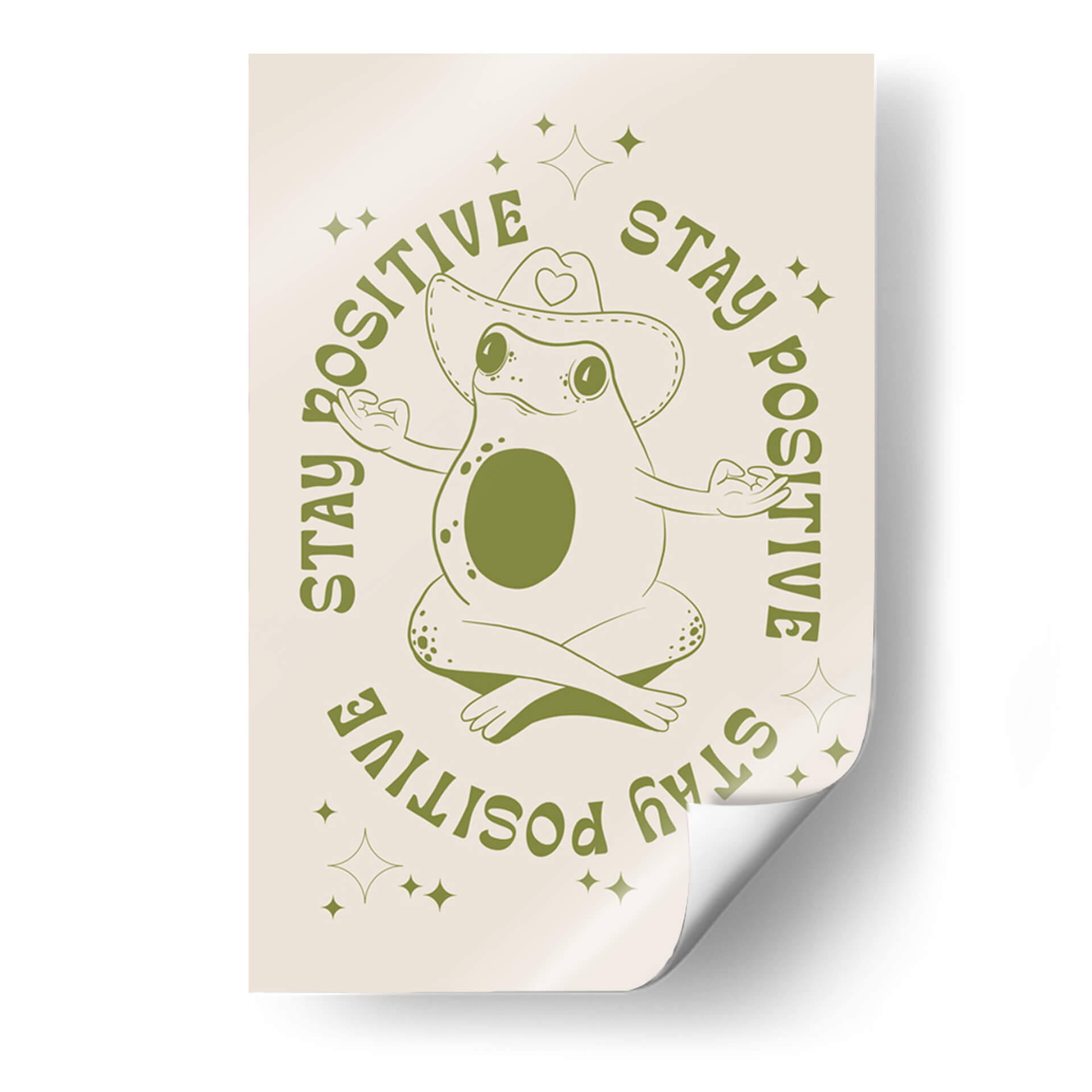 Infunde tu espacio con una dosis de optimismo y serenidad con este encantador cuadro decorativo 'Rana Feliz' de Alina Shulhouskaya. La obra presenta una simpática rana en pose de meditación, luciendo un sombrero de vaquero adornado con un corazón, rodeada por la inspiradora frase "STAY POSITIVE" repetida en un círculo. La paleta de colores se centra en tonos verdes terrosos sobre un fondo crema suave, creando una atmósfera relajante y acogedora. El estilo minimalista y la línea artística clara de la ilustración la convierten en una pieza versátil, perfecta para añadir un toque de alegría y mindfulness a cualquier habitación. Ideal para dormitorios, estudios, oficinas o salas de estar, este cuadro decorativo es un recordatorio visual para mantener una actitud positiva ante la vida. Su diseño único y el mensaje edificante la convierten en un regalo excepcional para amigos y familiares que aprecian el arte con propósito y un toque de humor.