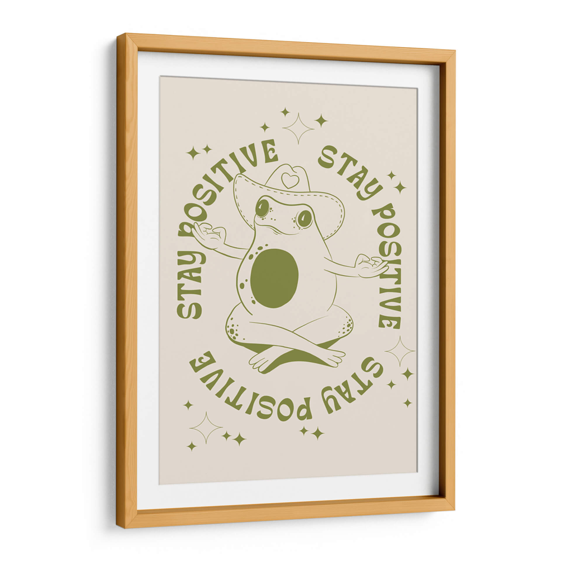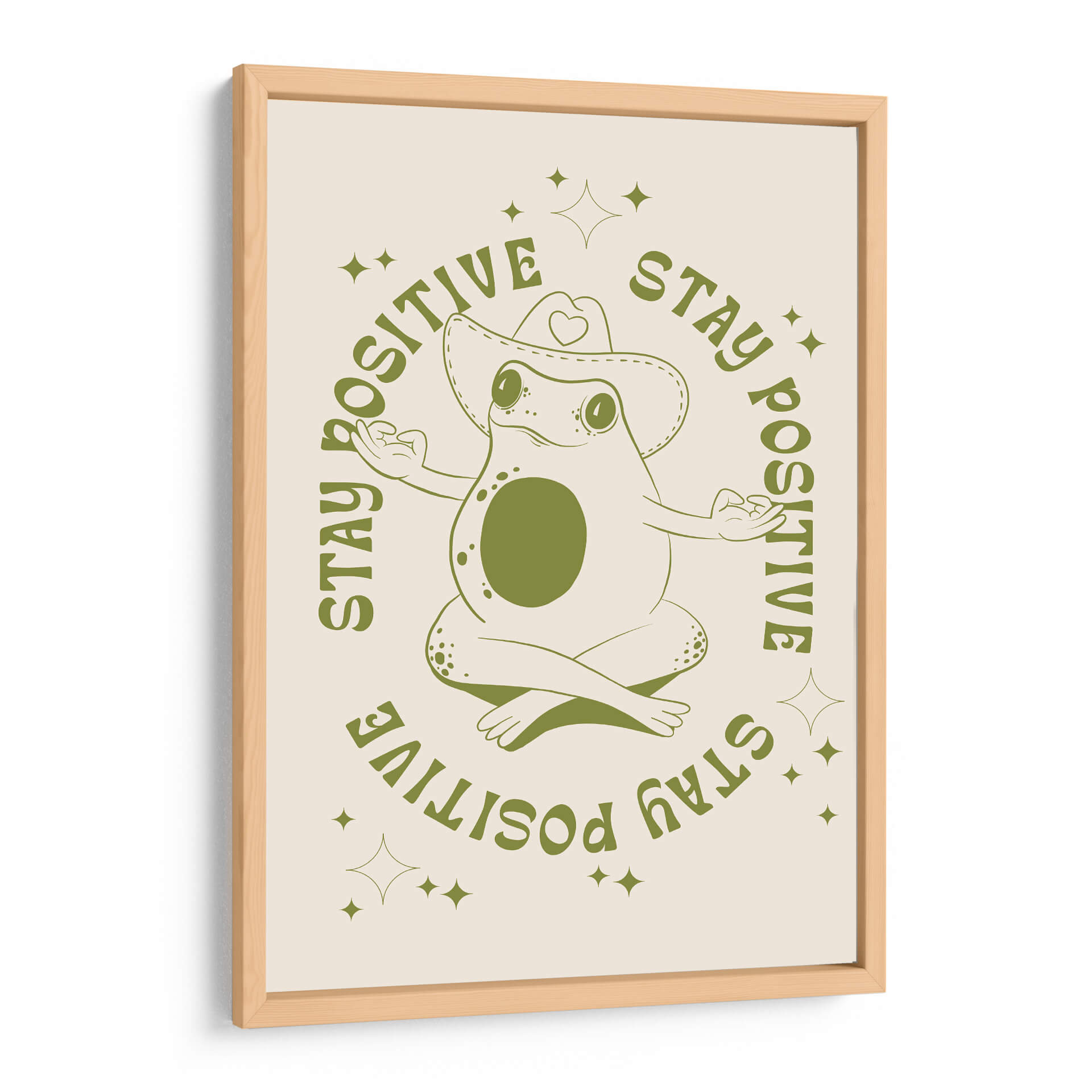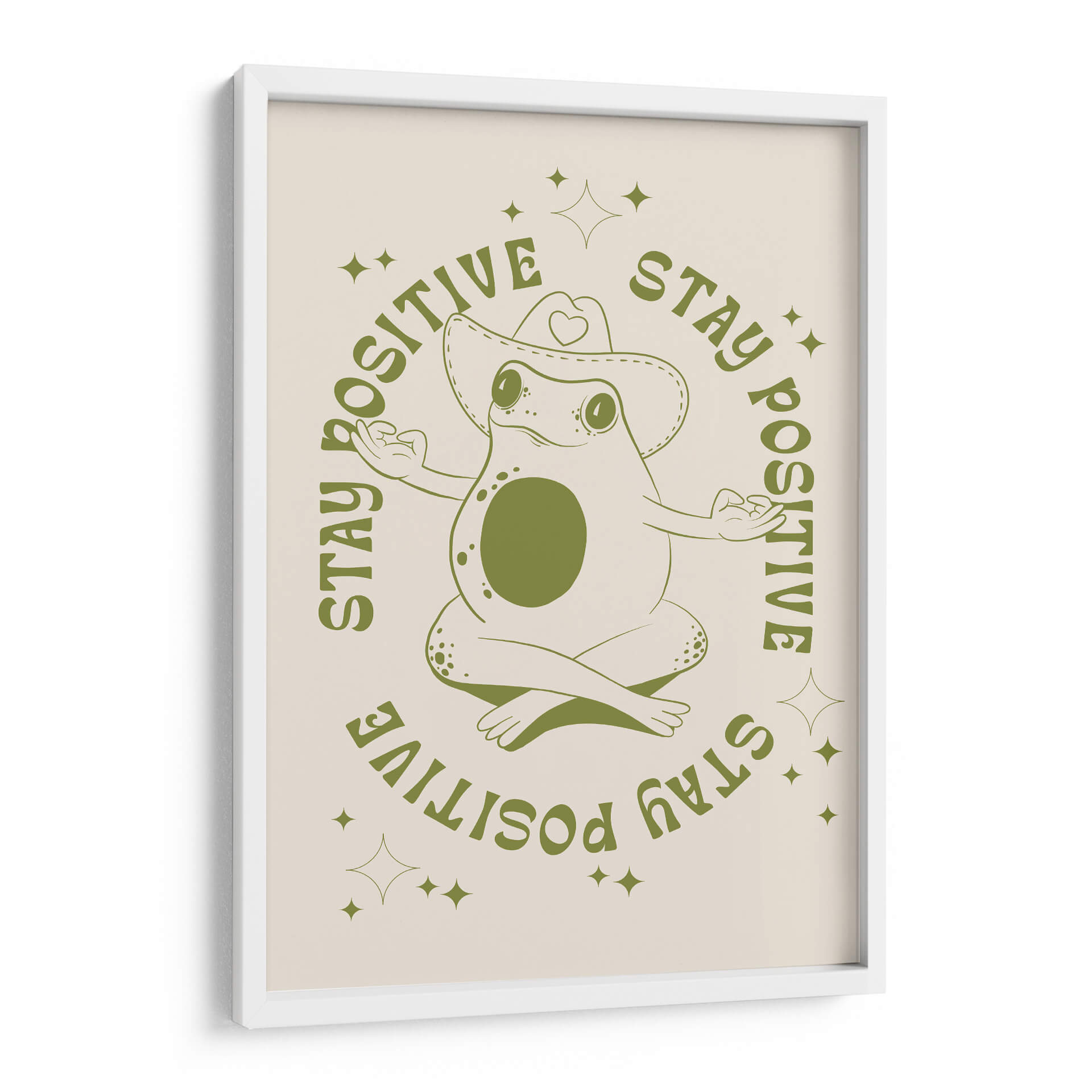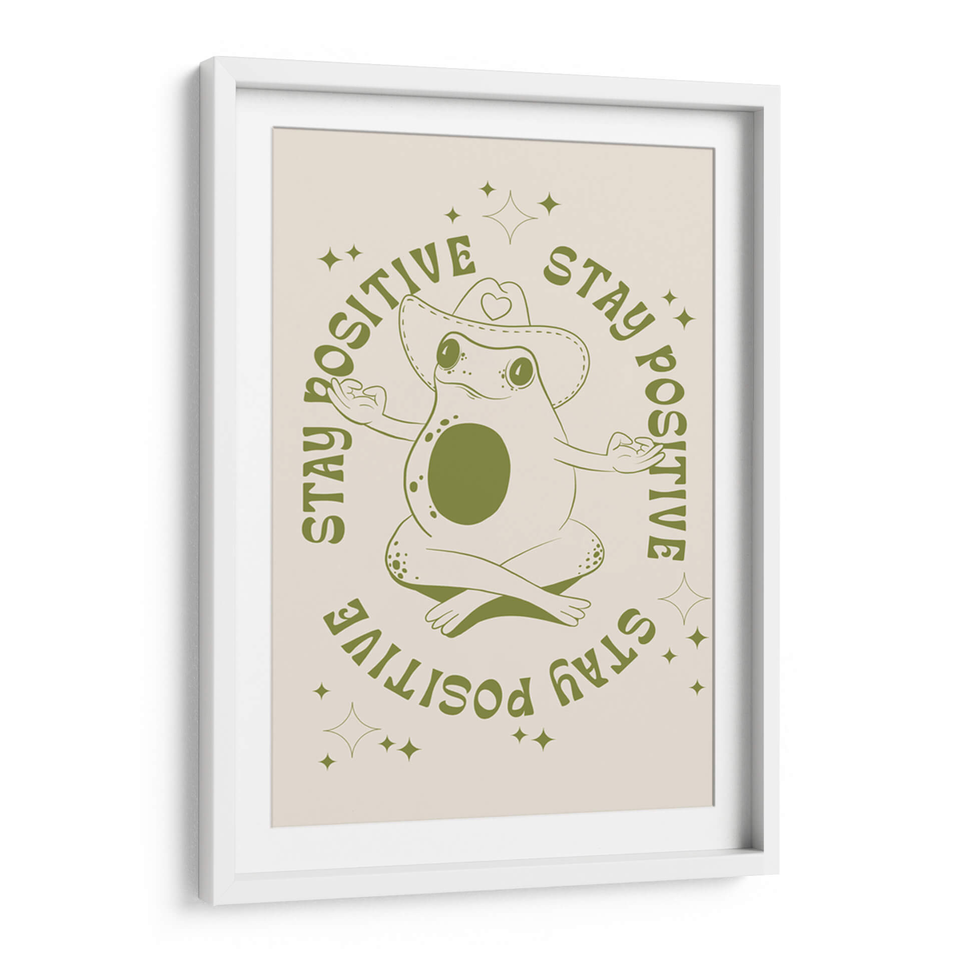 Infunde tu espacio con una dosis de optimismo y serenidad con este encantador cuadro decorativo 'Rana Feliz' de Alina Shulhouskaya. La obra presenta una simpática rana en pose de meditación, luciendo un sombrero de vaquero adornado con un corazón, rodeada por la inspiradora frase "STAY POSITIVE" repetida en un círculo. La paleta de colores se centra en tonos verdes terrosos sobre un fondo crema suave, creando una atmósfera relajante y acogedora. El estilo minimalista y la línea artística clara de la ilustración la convierten en una pieza versátil, perfecta para añadir un toque de alegría y mindfulness a cualquier habitación. Ideal para dormitorios, estudios, oficinas o salas de estar, este cuadro decorativo es un recordatorio visual para mantener una actitud positiva ante la vida. Su diseño único y el mensaje edificante la convierten en un regalo excepcional para amigos y familiares que aprecian el arte con propósito y un toque de humor.