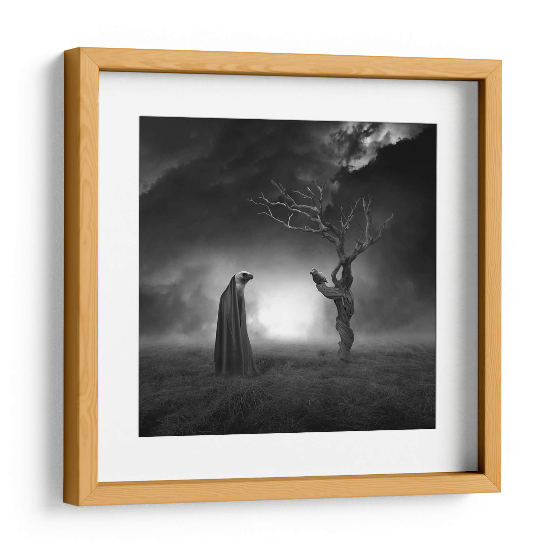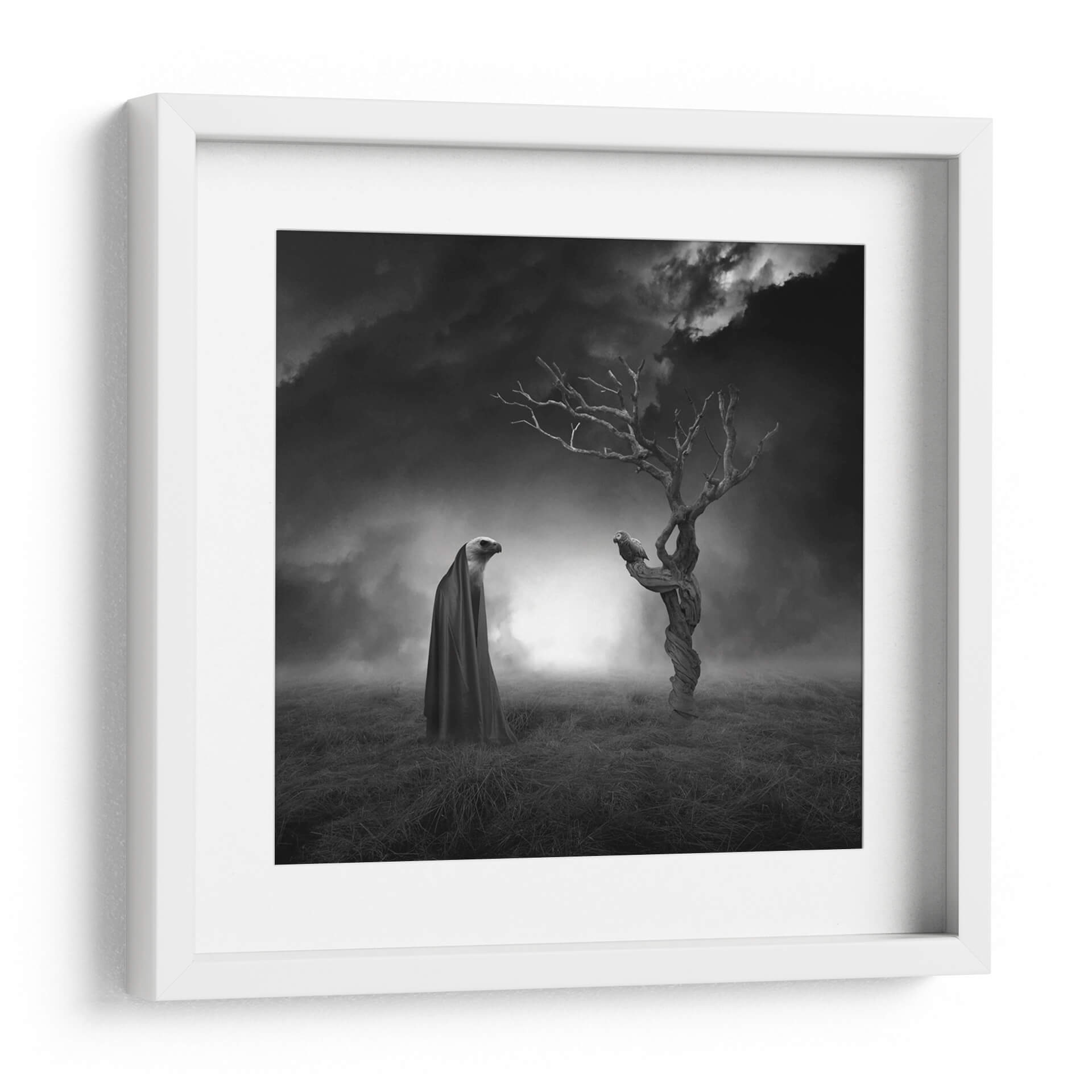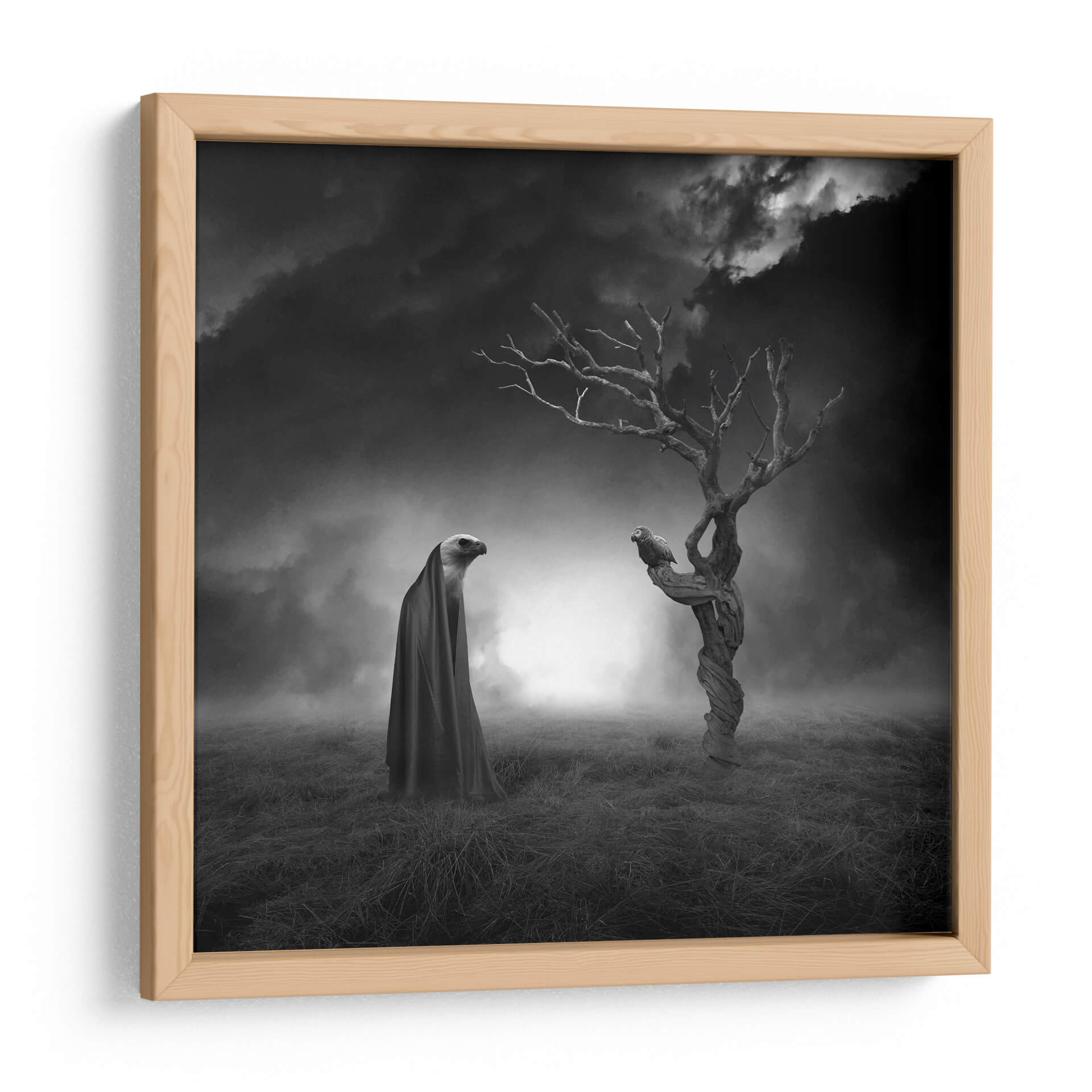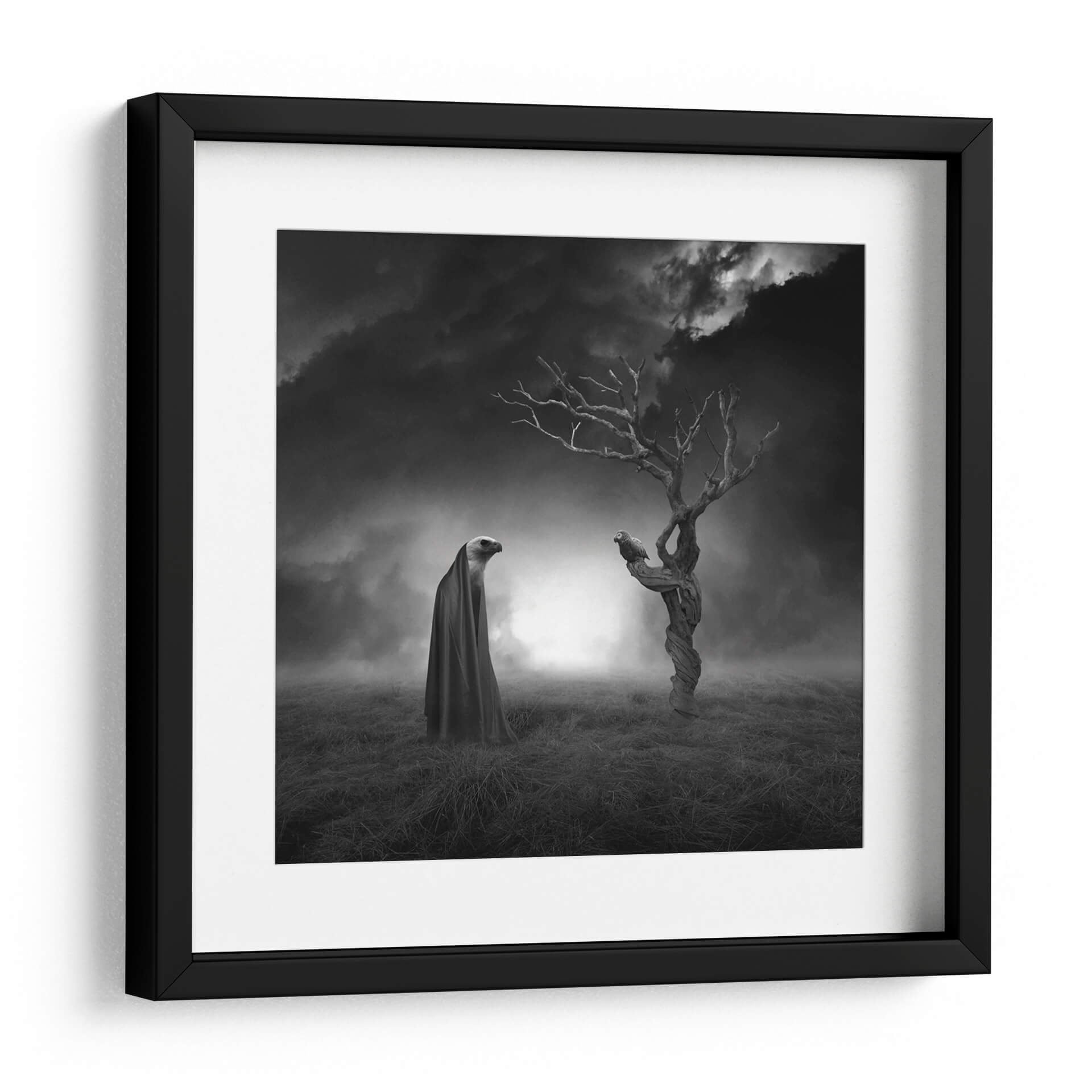 Sumérgete en el enigmático mundo de "Rembukan" de Hari Sulistiawan, una obra de arte digital que te cautivará con su atmósfera onírica y surrealista. Este cuadro decorativo presenta una figura solitaria, envuelta en una túnica oscura, parada en un paisaje desolado bajo un cielo tormentoso. A su lado, un árbol retorcido y desnudo sirve de percha a un ave, creando una escena cargada de simbolismo y misterio. La paleta de grises y negros profundos, contrastada con luces etéreas, genera una sensación de introspección y contemplación. El estilo único de Sulistiawan, que mezcla elementos realistas con composiciones fantásticas, invita a la reflexión sobre la soledad, la conexión y la naturaleza. "Rembukan" es una pieza perfecta para aquellos que buscan añadir profundidad y carácter a su hogar u oficina. Su estética dramática y su temática evocadora la convierten en un punto focal ideal para salas de estar, estudios o cualquier espacio que se beneficie de un toque de intriga. Este cuadro decorativo no solo embellecerá tus paredes, sino que también iniciará conversaciones, despertando la imaginación de tus invitados. Descubre la magia del arte contemporáneo y transforma tu entorno con la poderosa narrativa visual de "Rembukan".